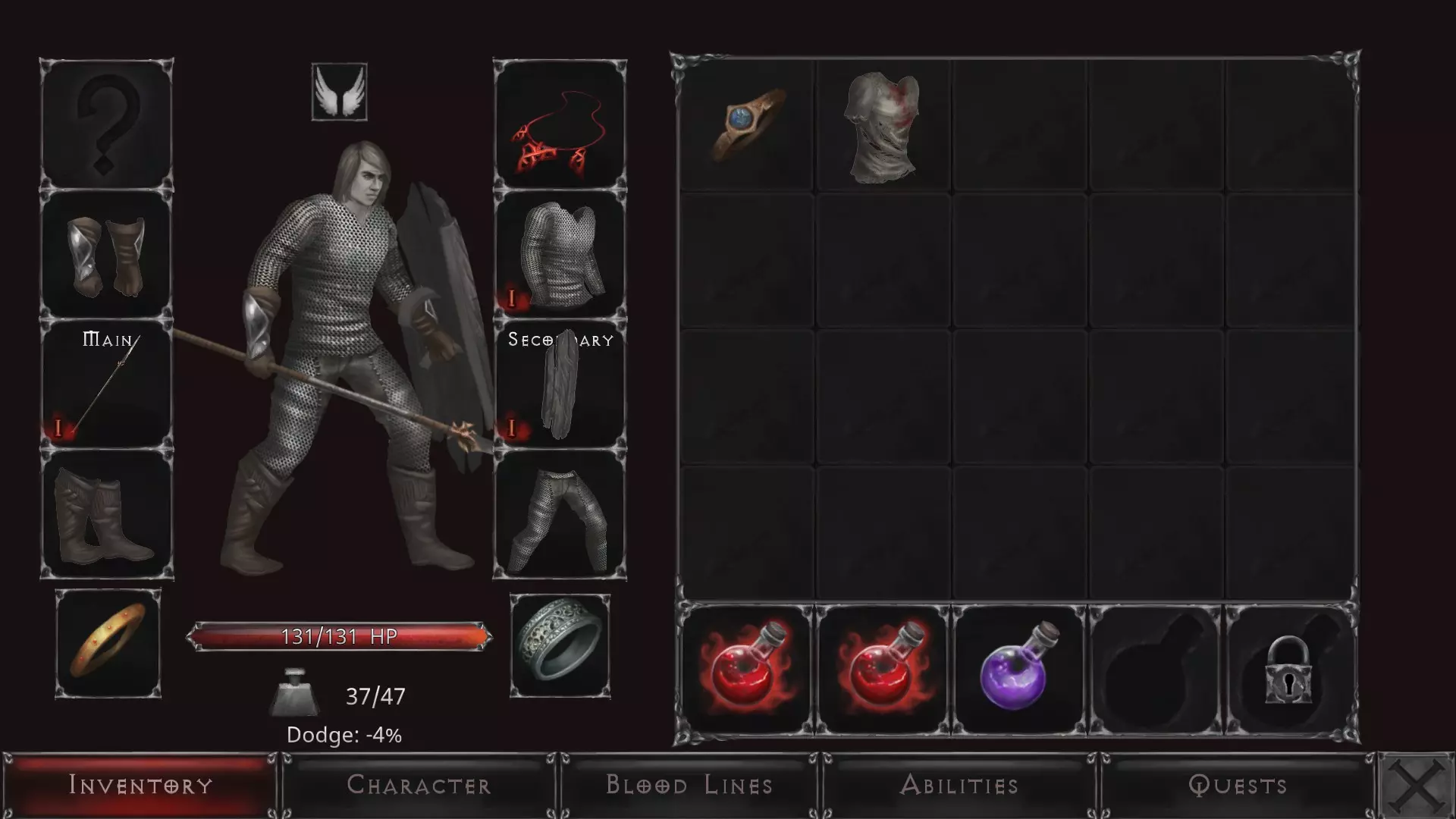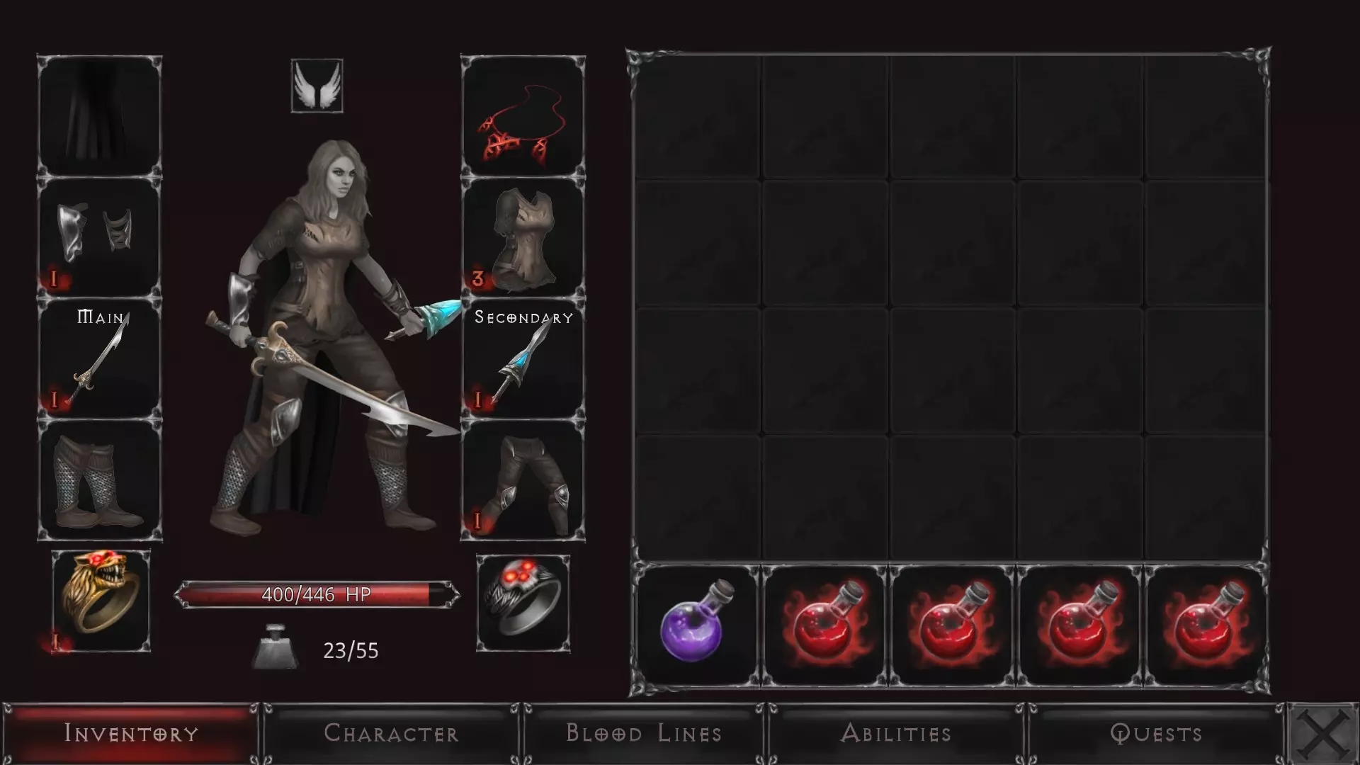 你的角色界面会是这样的。注意你有装备槽用于穿戴装备、武器、戒指、项链以及一些其他特殊物品(比如披风)。物品放入装备槽后,你可以将其装备在右手或左手。右手武器始终是你在战斗中使用的主武器,而副武器会在你选择专注攻击时使用(例如使用剑和盾牌、双斧或双匕首)。注意右下角区域用于放置药水——治疗药水、传送药水或吸引敌人的药水。你可以携带4瓶药水,并能解锁第5个药水槽。