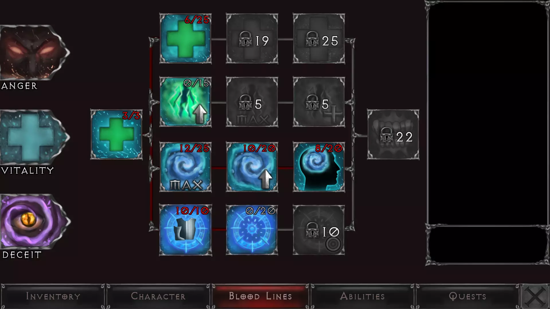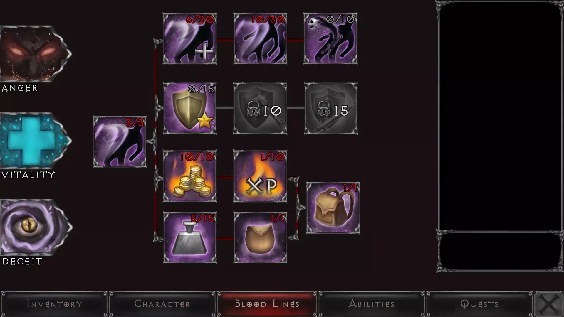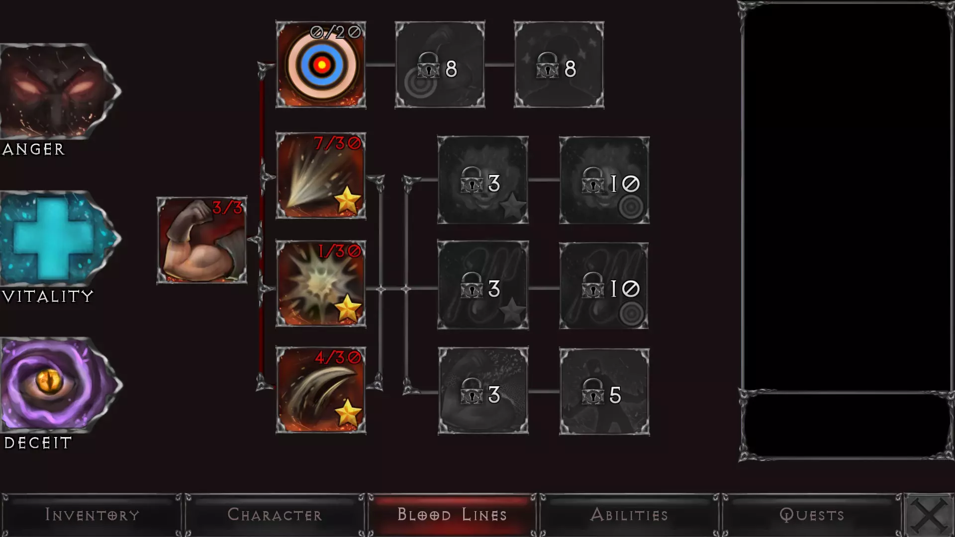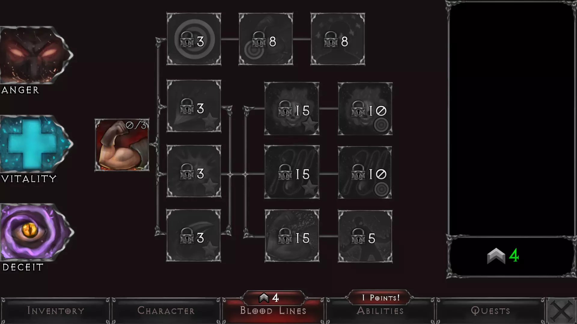 当你开始获取装备、武器、饰品等物品时,你的属性将会发生变化。这可能会影响你的闪避能力或伤害提升,也可能会增加你的生命值或专注值恢复速度——这一切都取决于你的游戏风格以及在游戏世界中寻找物品的运气。 血脉 - 概述 血脉是你的技能点,能够增强你在《吸血鬼之陨:起源》世界中生存所需的各项能力。每次升级你将获得4个技能点,可按自己的意愿进行分配。 血脉分为三种类型,每种类型都有一系列等级。在某一等级投入足够的点数将解锁下一等级。 血脉 - 愤怒