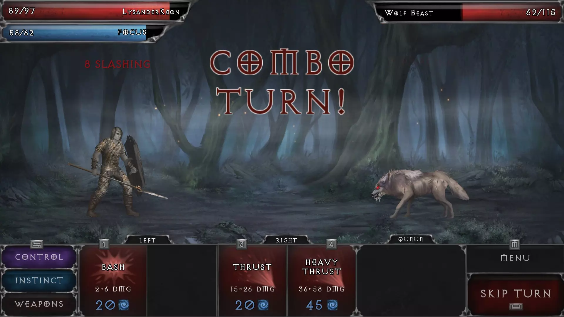 连击回合每三回合触发一次,在此期间你的专注力将获得显著提升,并且有机会连续释放数次攻击/技能,尝试打出精彩的连招或对敌人造成重创。部分技能在连击回合中会提供额外增益,例如专注力提升或生命值增加。 举例来说:一个游荡者角色在普通回合使用背刺技能需要消耗30点专注力,并有机会对敌人叠加最多五次攻击。听起来很棒,对吧?而在连击回合中,如果该游荡者拥有90点专注力,就能使用背刺技能最多三次——这意味着他们有潜力对敌人发动高达十五次攻击! 连击回合让你有机会发动攻击,也可以使用【啃咬】技能进行治疗,或者通过其他战斗技能为自己提供增益。