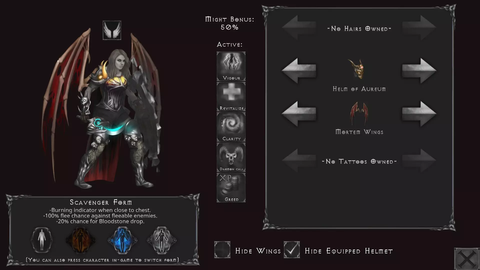 角色界面中可购买三种光环,但其中只有一种真正有用。 拾荒者形态相当无用。它能让你有100%的几率逃离大多数战斗,但当你能一击秒杀所有敌人时,你已经可以逃离非剧情或残酷迷宫的战斗了。你本来就能逃离野外残酷战斗,所以我觉得这个形态很鸡肋,更糟糕的是它还会使你获得血石的概率降低20%。真不敢相信提出这个想法的人还能保住工作。太逊了。燃烧指示器能让你知道附近有宝箱,但除非你在第二张地图获取血石,否则金币获取非常容易,所以这个功能也不值一提。 炼金术士形态很有用。我喜欢它能让你即使不在城镇也能制作药水。它还能延长对主动攻击你的野外战斗生效的药水持续时间,是个不错的选择。 暗影形态是最棒的,不会遭遇野外战斗。当你需要从A点前往B点却没有传送药水时非常好用。我在旅行时几乎总是开启这个形态。不过要记得,当你需要为了剧情或寻找野外精英怪而进行随机战斗时,要关掉它。 外观装饰