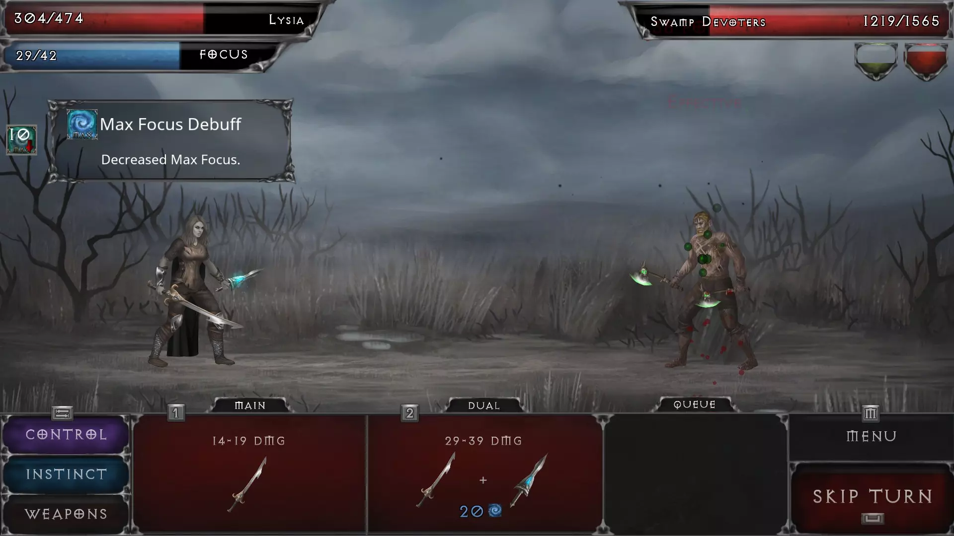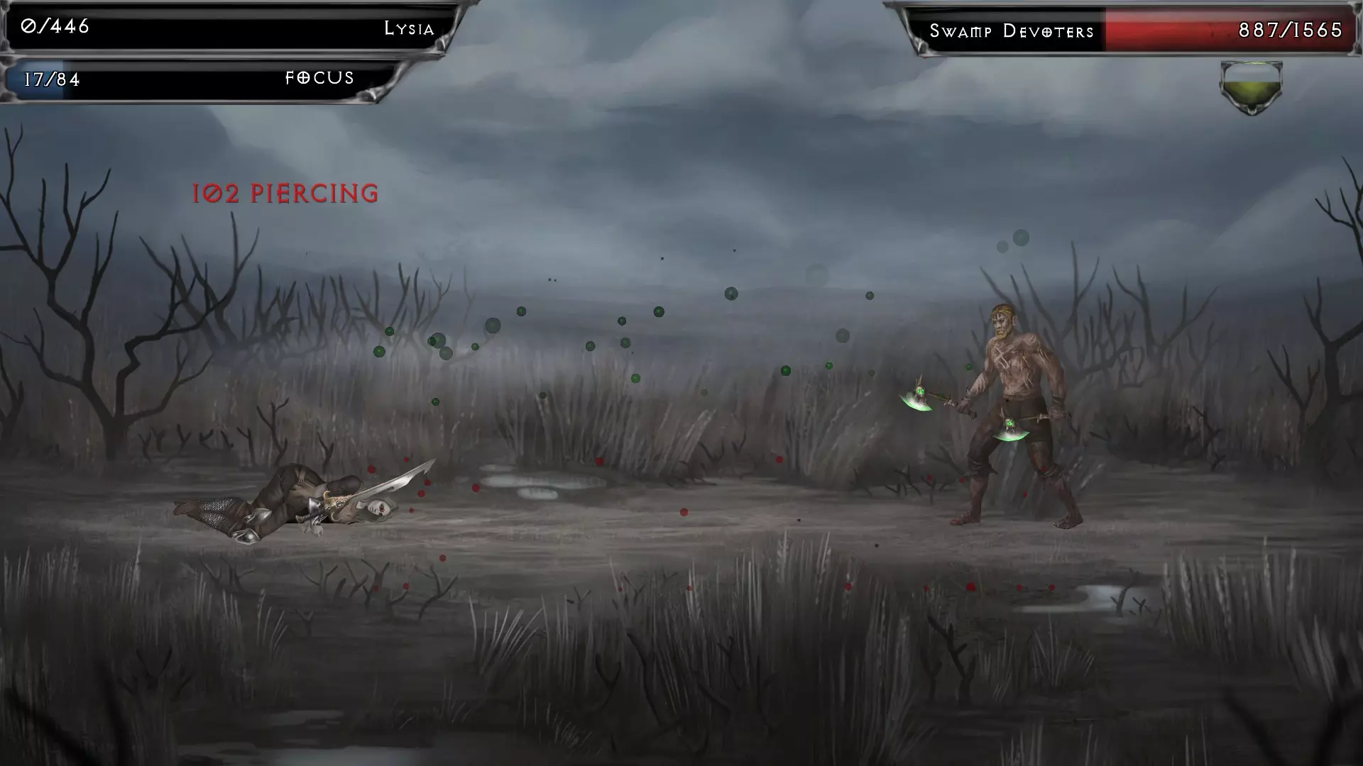 就像你可以给敌人上持续伤害效果一样,敌人也可以对你这么做。有些敌人的持续伤害效果可以叠加,并且极具破坏性,比如上图中那种降低最大专注值的效果——这会严重削弱我的角色,因为她非常依赖专注值来使用技能。 有些敌人拥有在特定时间内自我治疗的能力,有时会逐渐恢复至满血,有时则是少量恢复。 许多敌人拥有降低你闪避几率、恢复专注值的能力,或是减少你的最大专注值、削弱你的恢复能力。这些减益效果会在战斗结束后消失。 死亡