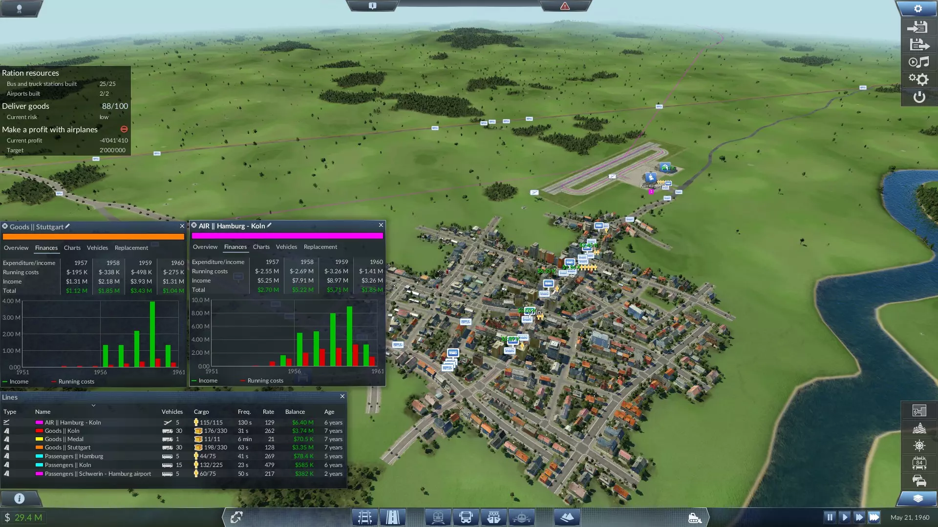 【Profitable year】 一年内赚取300万。 说实话,这对我来说是最难的任务。你很难赚大钱,因为工业布局糟糕,船只速度很慢,没有公交线路的情况下交通拥堵严重,三个城市的公交车数量不足以达到让人们选择你的线路而非自驾车的合理班次等等。好在这个成就计算的是年度总营收(而非利润)。要查看的话,点击左下角的银行账户数字,找到名为“收入”的最后一行,达到至少300万即可获得该成就。我在1969年成功获得了360万(公路170万,铁路15万,航空32万,1)。4M水资源)使用5艘船只(铁矿石→钢铁厂、石料→材料厂、谷物↔塑料、钢铁+矿渣↔材料+机器)以及所有可用的陆地载具,其中效益最高的线路是将牲畜/谷物运送到食品厂,然后使用同一批卡车将食品运送到拉斯帕尔马斯。我刚刚建造了一条铁路,假以时日,它也能带来更多收益。
