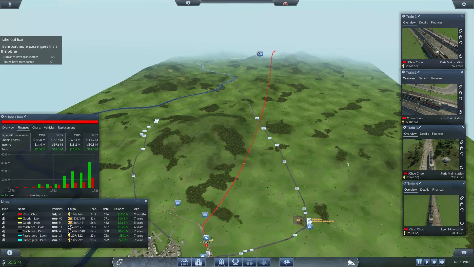 金钱助你展翅高飞 通过你的航空公司赚取5000万。 如果你的公交线路设置得当,这笔钱迟早会自然到手。确保将所有三座城市相互连接,并为机场增加更多航站楼,这样来自不同城市的飞机就不会过长时间等待空位。 欧洲任务6:尖端科技(法国) 从资金角度来看,这是一个相当简单的任务;与德国任务类似,但现在你拥有两家无需任何原料就能生产货物和机器的工厂!不过,乘客相关的任务可能会有些难度,我们稍后再详细说明。 是否应该接受贷款?——不应该,而且你应该也不需要贷款。总体概述:正如许多人可能已经提到的,你首先应该做的是卖掉当前里昂和巴黎之间铁路线上正在运行的空火车。这列火车已经9年了,车厢数量过多,每年的维护费用接近300万。在完成第一个任务(将旅行时间减少到7分钟以内)之前,几乎所有的建造选项都被锁定,因此需要一条更好的线路。由于资金很快就不成问题,我个人建造了一条铁路线,直接穿过所有山脉,如果你从里昂看向巴黎,线路会稍微偏左。铁路建设花费约2000万,道路基础设施花费500万(将道路升级为四车道+公交线路,同时为货物运输修建一条穿过山脉直达里昂的笔直道路)。关于任务本身,我们受限于最快的客运车厢,因此选择并不多:A4型、1042型或218型+1节二等统一车厢。根据线路不同,将时间降至7分钟以下可能需要不同时长(我的列车离开车库后需要停靠5站才能完成任务)。 完成后会解锁其他建筑,建议暂停游戏并设置从工厂到巴黎、从货物到里昂的线路,以及每个城市内的公交/有轨电车路线,以便将乘客送往火车站。将机器运往里昂、货物运往巴黎也能获得不错的利润,但最好在工厂升级几次后再采用这种方式,否则工厂可能会把所有物资都投放到短途线路上,这样你的收益可能会比原本少2-3倍。第二项任务——每年运送500名乘客,实际上是其中一个成就,具体细节可查看成就描述。 下一个任务是运送比协和式飞机更多的乘客。从技术上讲,如果你已经能在一年内运送500名乘客,那么完成这个任务应该不需要太多额外操作。巴黎上方还有一个问号任务:你可以使用老旧且较长的铁路来运行一列慢车以完成该任务,但说实话,我没发现奖励(未来购买的车型会提升性能和牵引力属性)有什么显著影响,所以如果你愿意,完全可以跳过它。重要提示:这个任务是本关卡的最后一个任务,因此我建议在完成所有任务后额外执行一个操作——将你当前的列车替换为TFV列车,以解锁280公里/小时的成就。一旦你的数据超过航空公司,关卡就会立即结束。