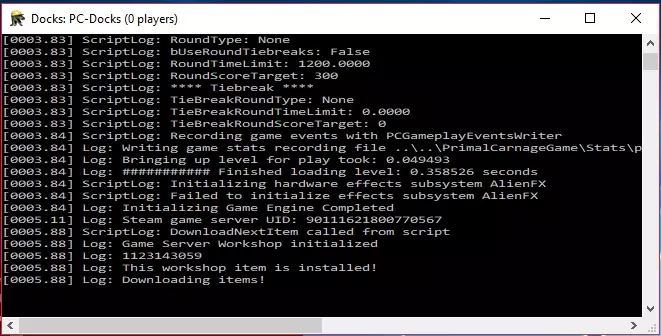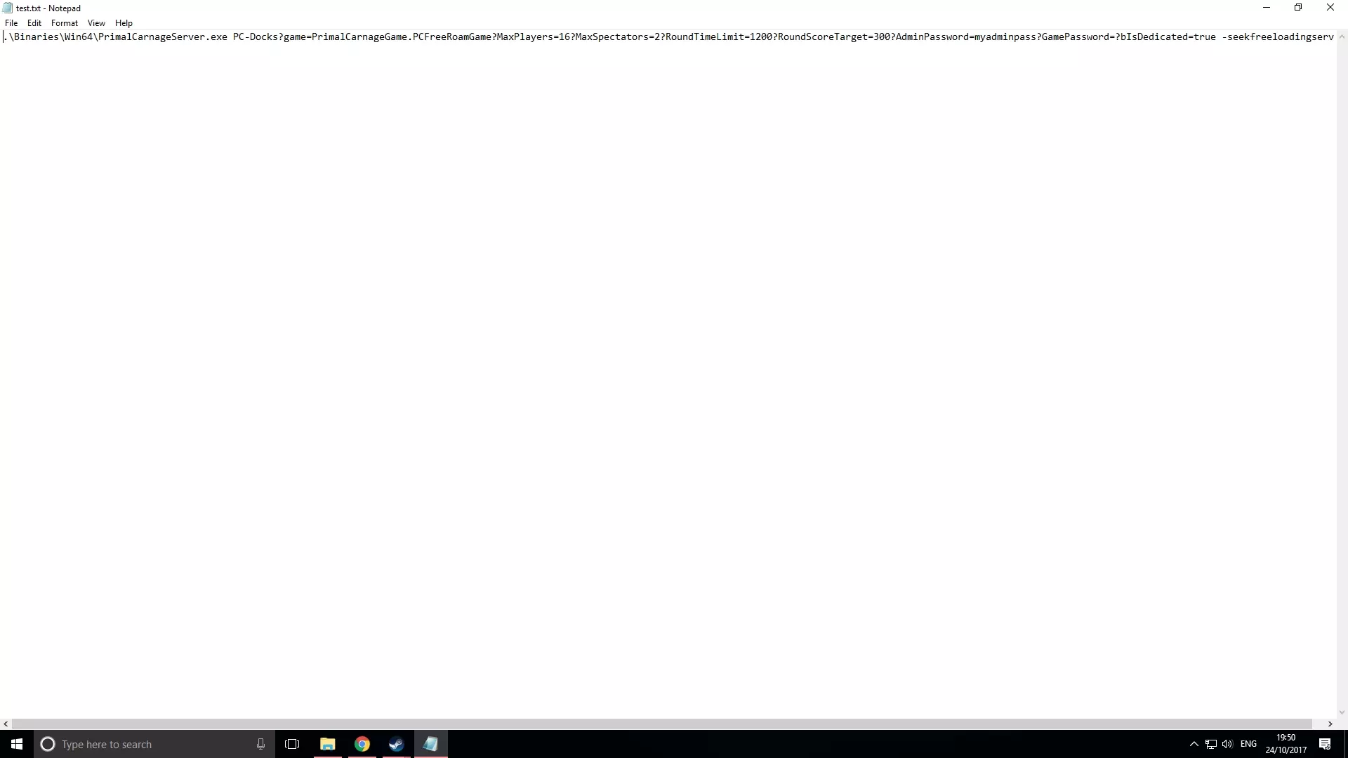 将以下内容复制粘贴到您的文本文档中:. Binaries Win64 PrimalCarnageServer.exe PC-Docks?game=PrimalCarnageGame.PCFreeRoamGame?MaxPlayers=16?MaxSpectators=2?RoundTimeLimit=1200?RoundScoreTarget=300?AdminPassword=myadminpass?GamePassword=?bIsDedicated=true -seekfreeloadingserver
