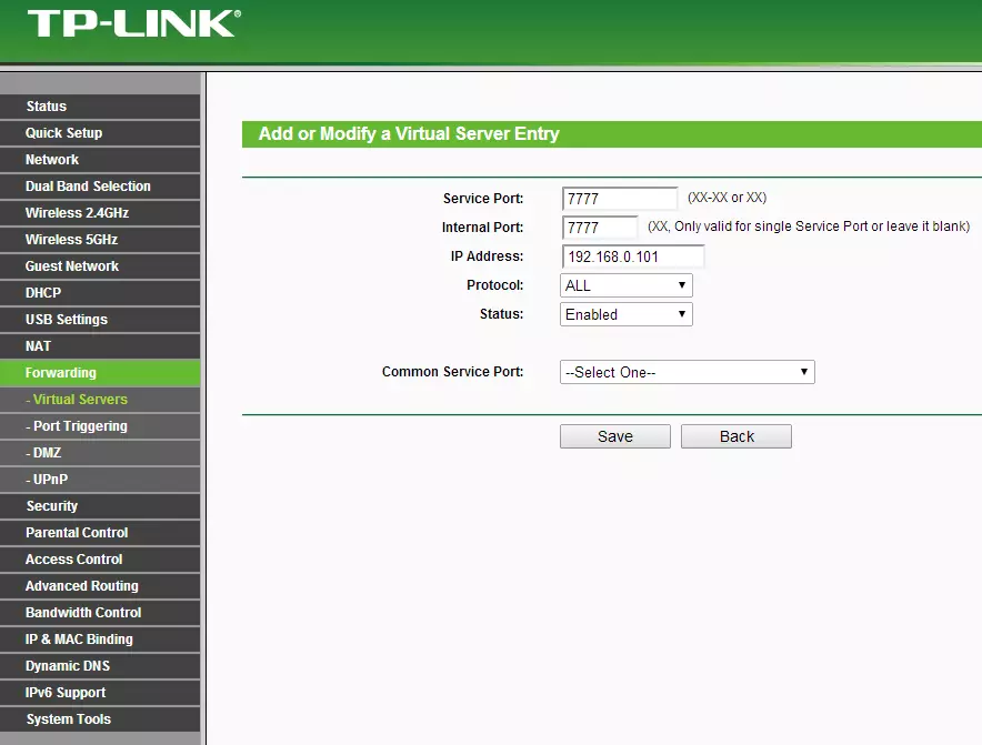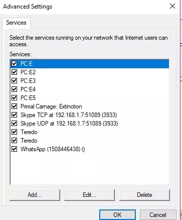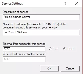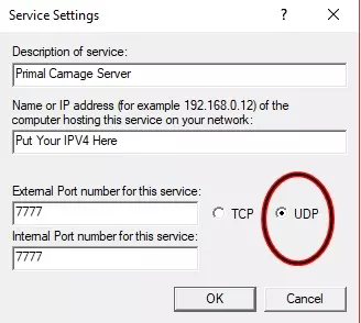 你不会在那里看到PC;E选项,不用担心!现在点击“添加”,这就是进行端口映射的地方。服务描述可以随便填写,完全没关系。这里需要填写IPv4地址,所以回到你记录IPv4地址的地方,把它填在这里。你需要的端口是:7777、7778、27015。确保在右下角选择UDP!外部端口和内部端口都设置为7777。其他两个端口也按同样的方法设置。