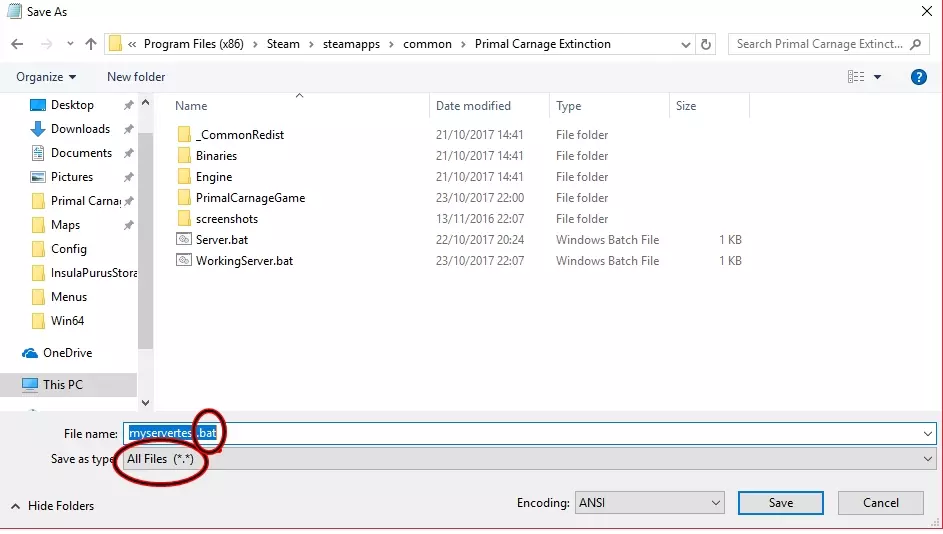 在此处填写你的游戏详情,例如管理员密码、地图、游戏模式。完成所有设置后,前往文件并点击“另存为”,将其保存到C: Program Files (x86) Steam steamapps common Primal Carnage Extinction文件夹。确保将文件保存为.bat格式。