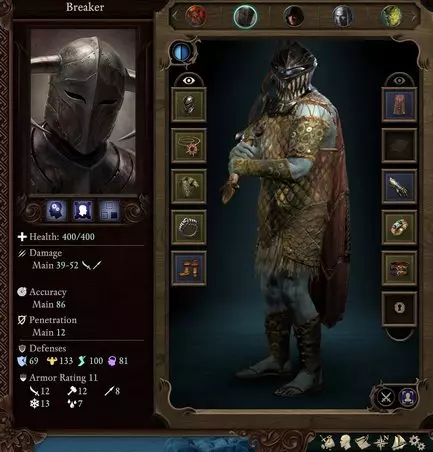 如你所见,即便在战斗中属性被削弱,也几乎不会受到伤害,还能自我治疗、自我强化……(5-8个敌人=10秒钟的混战) 头部槽位:部分头盔能提供不错的属性加成与额外效果。 注意:“神选者”种族无法佩戴头盔(头部槽位不可用),这可能是个劣势。 进阶技巧: 1. 坦克和治疗职业需要头盔(僧侣/牧师除外)。 2. 部分头部装备和饰品的效果非常强大。 护甲方面,恢复速度通常很重要,不要让自己过于受限。在游戏终局(16级及以上)前,轻甲/中甲是最佳选择 分类 恢复惩罚 基础护甲值 弱点 轻甲 布甲 0% 3 --无-- 皮甲 革甲 棉甲 20% 5 皮甲:对挥砍/腐蚀伤害抗性-3 革甲:对钝击/冰冻伤害抗性-3 棉甲:对穿刺/火焰伤害抗性-3 中甲 胸甲 链甲 鳞甲 35% 7 胸甲:对挥砍/电击伤害抗性-5 链甲:对钝击/冰冻伤害抗性-5 鳞甲:对穿刺/腐蚀伤害抗性-5 重甲 鳞甲衫 板甲 55% 9 鳞甲衫:对穿刺/腐蚀伤害抗性-5 板甲:对钝击/电击伤害抗性-5 首饰/腰带/靴子/披风 项链和戒指能提供强效加成,为角色装备合适的加成属性 腰带非常适合增加体质,或获得抗性,或获得推拉免疫 靴子可提升步幅(移动速度),或提供异常状态防护部分属性提升 披风可以提升你的偏转值/其他抗性/施法速度/从火焰伤害中恢复生命 武器