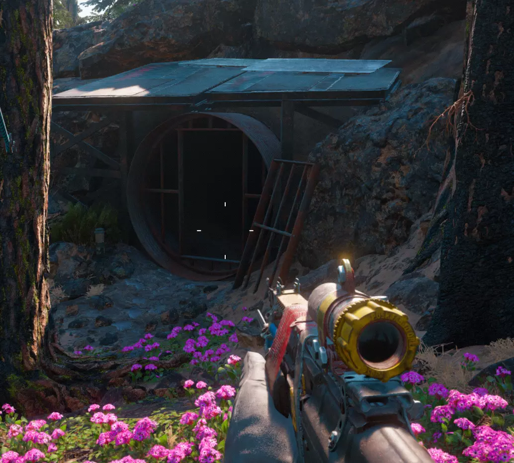 从桥上可以看到 sewer pipe exit(下水道管道出口)。 使用远程武器的同伴有时很难攻击到坑里的敌人,这可能是因为坑上覆盖着金属栏杆。出于某些原因,这些栏杆有时会挡住子弹。 非动物同伴可以被带领穿过下水道系统,这样他们就能协助杀敌。