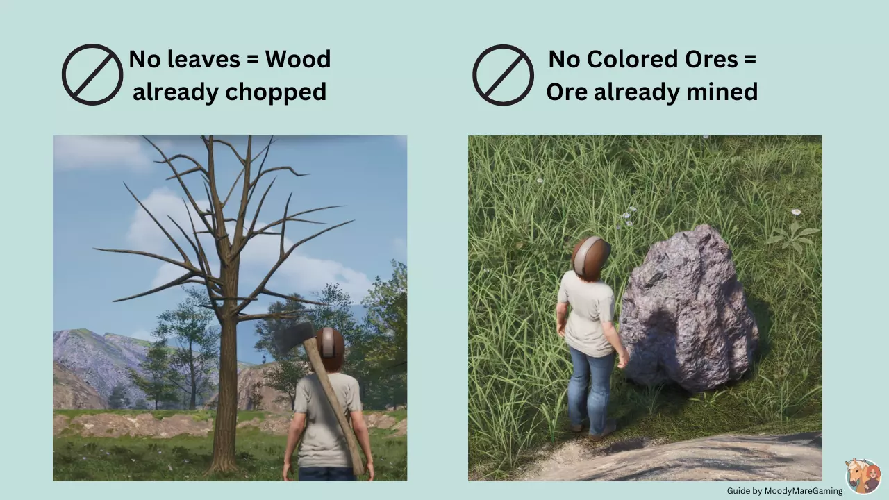 木材与矿石资源 砍伐/采矿操作 要获取资源,请靠近树木/岩石,使用合适的工具击打3次。每次会松动1-4个资源物品。每个物品需要单独按【E】键收集。 - 木材资源