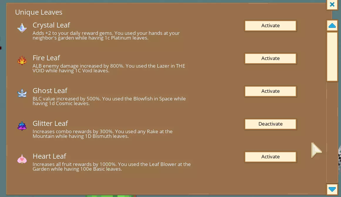 需要注意的重要事项 1) 树叶必须被吹出屏幕。只需待在树叶后面缓慢推进,无需一直超过它来拖拽它 2) 一次只能装备一片独特树叶。你可以一直装备一片树叶 3) 如果相关树叶没有生成,传送离开后再回来 BubblesandSuch补充的内容 1. 你需要2000万BLC升级后,独特树叶才会生成 2. 如果你拥有所需数量的树叶,在正确的世界装备正确的工具后,树叶会立即生成 3. 树叶很大,不可能错过。它大约有中型敌人那么大,会生成在屏幕正中央 4. 独特树叶不会消失,所以你可以放心挂机 1c是什么意思? 这是你拥有的树叶数量它们按顺序排列(列表中每向下一项都是前一项的1000倍) 1 1000 = 1e3 1 m = 1,000,000 = 1e6 1 b = 1,000,000,000 = 1e9 1 t = 1,000,000,000,000 = 1e12 1 a = 1e15 1 A = 1e18 (b未被遗漏,因为b代表十亿) (B被遗漏原因未知) 1 c = 1e21 1 C = 1e24 1 d = 1e27 1 D = 1e30 1 e = 1e33 由于某种原因,该游戏没有切换到科学计数模式的选项。