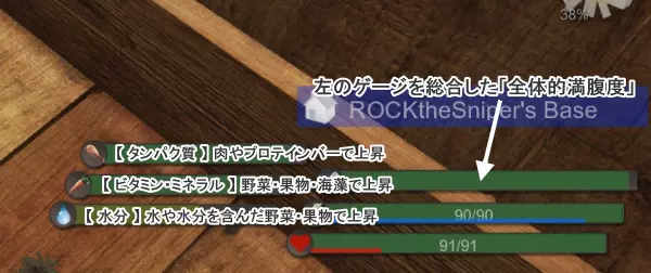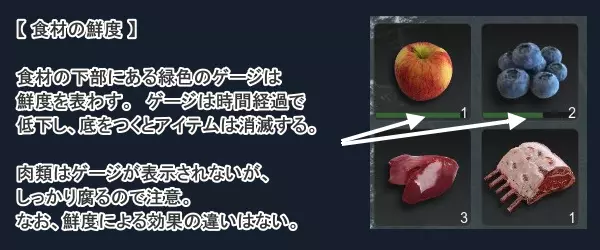除了【蛋白棒】等少数密封食品和【水】之外,所有食品都有【鲜度】设定。 在物品栏中,物品下方显示的绿色计量条代表该食品的鲜度。当这个计量条耗尽时,植物和水果就会消失。 肉类不会显示鲜度计量条,但似乎有隐藏的鲜度参数,即使经过烹饪也会彻底腐烂。 鲜度计量条大约会在半天到一天内耗尽。考虑到烤肉的情况,本想晚上集中进食,但也可能出现“晚上打开背包时生鲜食品已经消失”的情况,所以如果有快要变质的食物,请毫不犹豫地当场吃掉。要记住“食物一定要在腐烂前吃掉”“吃不完的话,就不要勉强去收获”。此外,该游戏和生存建造类游戏常见设定一样,存在所谓的【食物·水分计量条】,但在本作中,食物计量条又细分为【蛋白质】【维生素·矿物质】以及【水分】,这三者的综合构成【饱食度计量条】(也就是说,食物计量条实际上是由四个系统并行存在)。