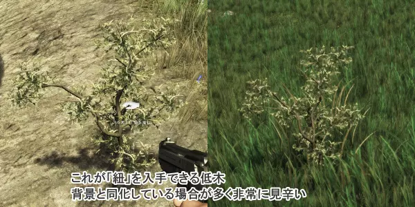 那么,装有物资的箱子有: - 主要装有制作材料的【木箱】 - 装有医疗类素材和食物的【医疗品箱】 - 装有弹药和子弹材料的【弹药箱】 - 带锁的【金属板条箱(特殊容器)】 不过,除了金属板条箱之外,都可以全部打开。 (当然,探索时要时刻留意野生动物。把手中的手枪当作“护身符”,尽量不要开枪。)目前来看,无论攻击什么目标,几乎都会以“浪费弹药”告终。 见到能捡的东西就都捡起来,但此时一定要记得从箱子里寻找【箭或羽毛】以及【火柴或生物燃料】。 绳子消耗量大却难以获取,它可以从褪色的矮树丛(见下图)中获得。