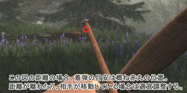 “蛋白质”主要通过食用肉类和蛋白棒获取,“维生素·矿物质”可从蔬菜、水果、海藻中获取。 营养失衡(任意一项数值大幅下降)时,首先会导致耐力值恢复速度变慢,接着仅步行就会消耗耐力,最终耐力值将完全无法恢复(即持续处于耐力为零的状态)。 一旦出现这种情况,即使在危险状况下也无法奔跑,生存能力会大幅降低。此外,当任意一个营养条耗尽并持续一段时间后,角色会进入【营养不良】状态,此后每隔一段时间就会受到持续伤害,最终导致死亡。 关于【维生素·矿物质】,可以通过食用随机掉落箱子里的水果(如苹果、蓝莓)以及池塘或湖底生长的【海带】来恢复,因此相对容易提升。但箱子中出现蛋白质棒的概率极低,所以【蛋白质】在游戏初期很难补充。 接下来是下一步。4:狩猎准备 到目前为止的探索,应该已经收集到足够制作弓和几支箭的素材了吧?如果没有,请继续探索直到收集齐全。(制作弓所需的【绳】,可以用2个【线】制作1根) 当获得弓和4~6支箭后,就去寻找小型的棕色鸡或兔子(或许在之前的探索中你已经见过好几次了)。 尤其在游戏初期,建议优先瞄准鸡,因为拆解鸡时能稳定获得制作箭所需的羽毛。 (※这里需要注意的是,【绝对不要对小动物使用手枪】。)被手枪击倒的小动物会因冲击力被破坏成垃圾物品,除了能制成【腐肉】外,别无他用。 发现目标后应立即压低身姿,逐步接近到一定距离(注意不要过于靠近,否则会导致目标逃跑)。 拉弓时不会显示瞄准准星,需要凭感觉发射。根据距离不同,横向以箭头根部为基准,纵向瞄准目标上方约1至2个箭头长度的位置,这是大致的命中参考。