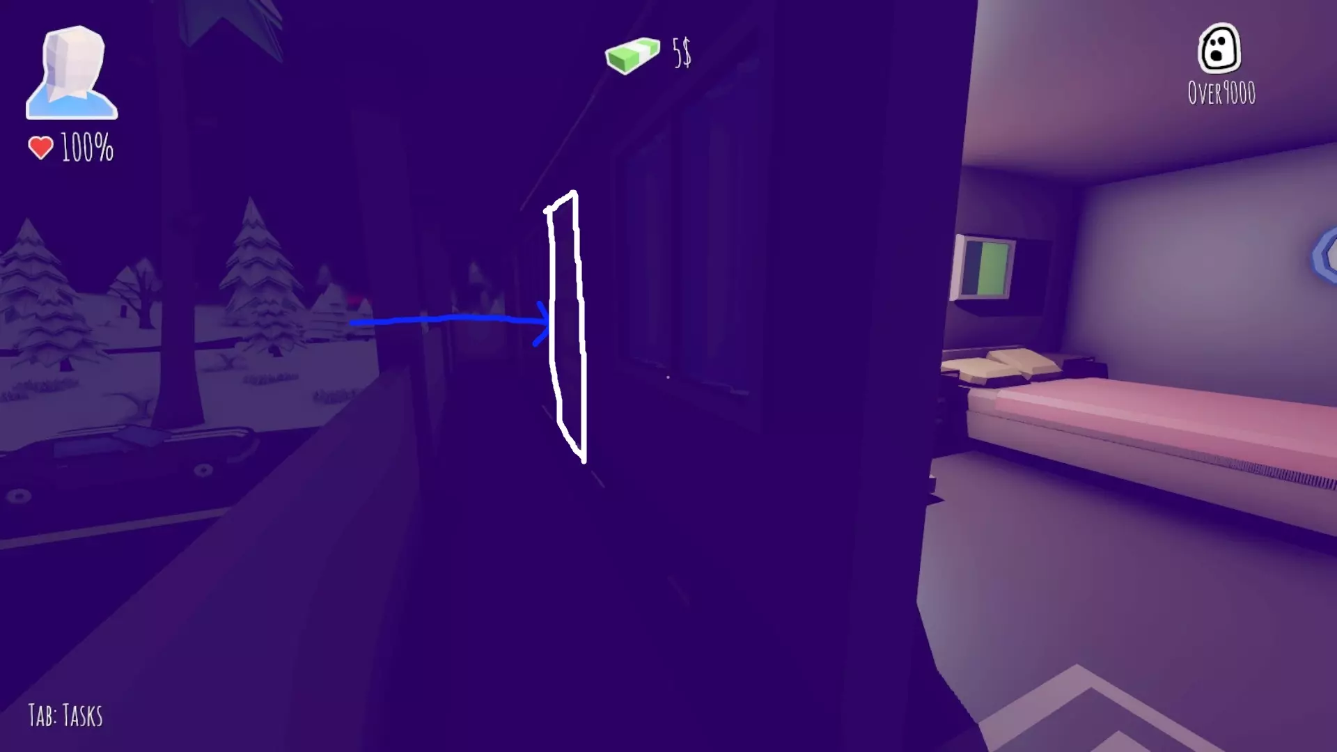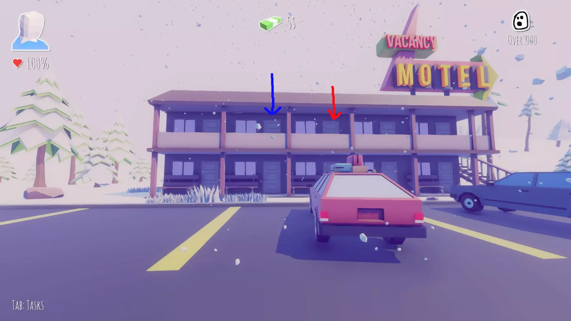 坐进车里然后开车。 汽车旅馆 在汽车旅馆停下后前往我们的房间。红色箭头是你的房间,蓝色箭头是你的邻居(记住这一点)。