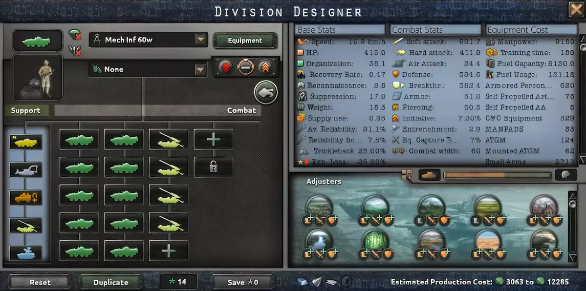 60版本在DLC中包含了几个坦克营和自行火炮。这是一支非常强大的突击师,甚至可以击败许多AI的坦克师。这是一个非常昂贵的师,所以请记住这一点,不过它是值得的。 你可以用自行火炮代替坦克营,以便更强地对敌方步兵进行软攻击。机械化步兵(装甲运兵车) 同样,装甲运兵车单位拥有更高的软攻击值,因此应优先用它们来压制敌方步兵。 机械化步兵(装甲运兵车)30