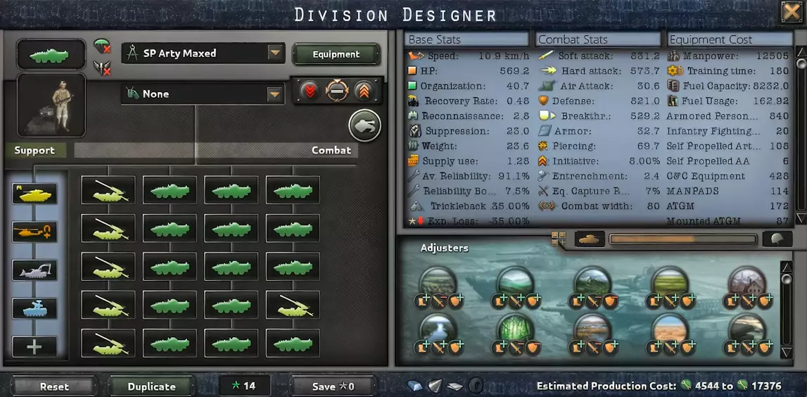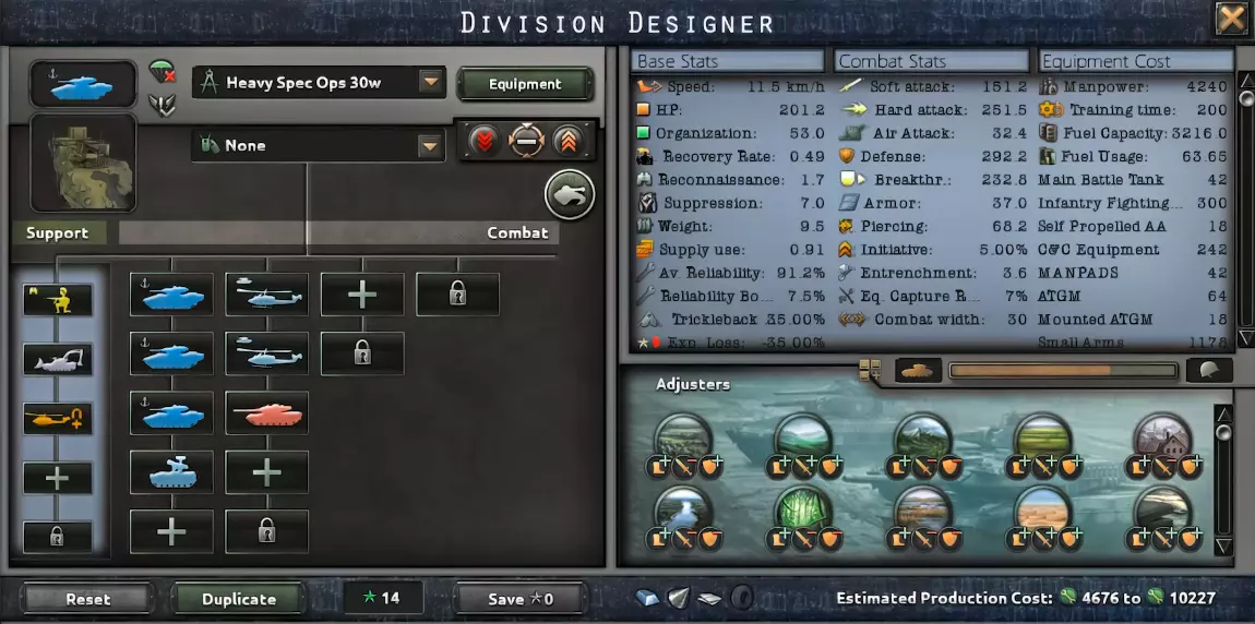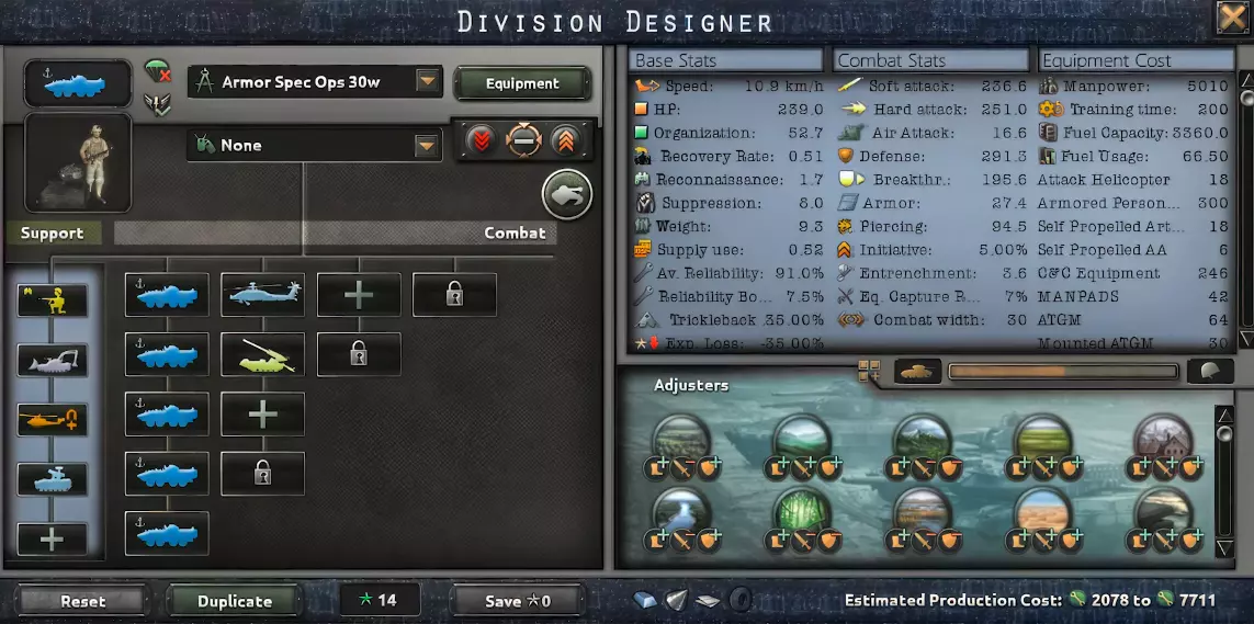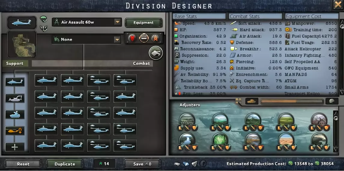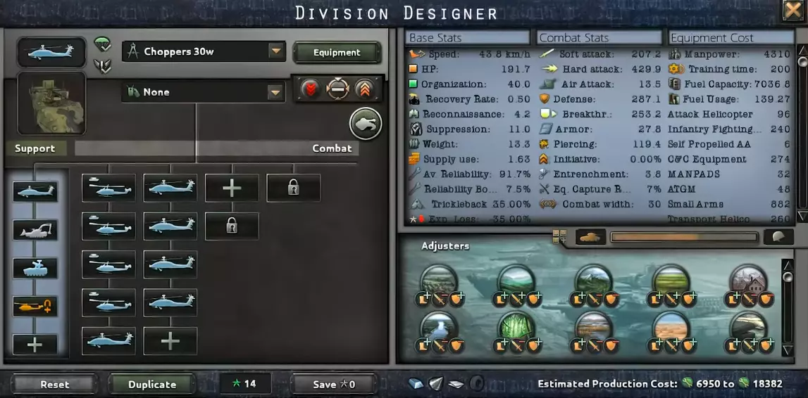 这里我们通过直升机提升战力。这也需要更多的装备,但我们能因此获得不错的速度、高额的装甲以及软攻击。在使用我攻略中提到的防空模板时,这种配置最为有效。 武装直升机 我们终于有了直接的空中模板,它们重获生机。随着直升机设计器的加入,我们可以打造出相当出色的直升机。而现在,师属直升机分队是游戏中最出色的单位之一。它们速度极快,属性也非常强大,但造价却高得离谱。