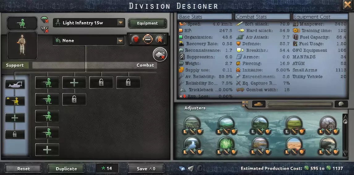 摩托化步兵拥有出色的属性,并且移动速度非常快。可以用它们突破敌人的师。 为了降低成本,可以删除支援营,但必须保留自行火炮,以免损失火力。 特种部队 由于模组的改动,《千禧黎明》中的特种部队变得更加强大,还为空降兵和海军陆战队新增了学说分支。除常规类型外,这些师在所有地形加成方面都拥有更出色的属性,通常最适合在复杂地形推进。 请注意,几乎所有部队都配备了重型工兵连。它们能为复杂地形提供强大加成,且只需越野车辆。几乎所有师都应配备它们。 特种部队15
