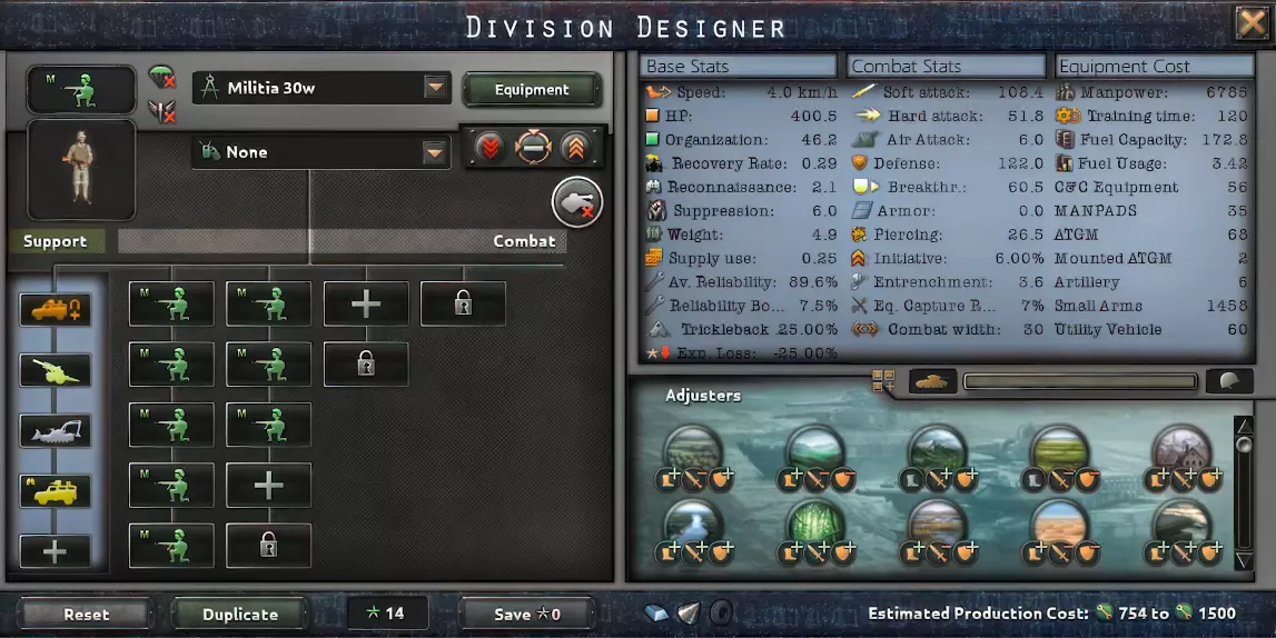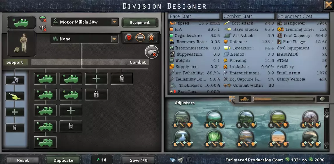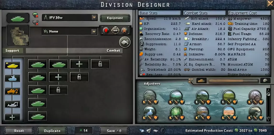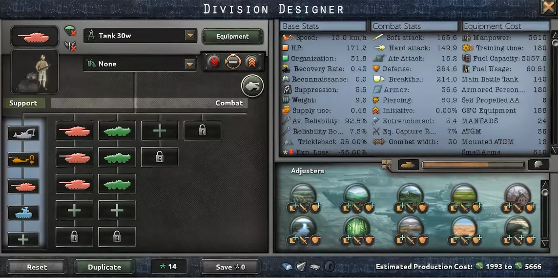 这是一支小型装甲师。它在考虑到前线宽度的情况下并非追求最大效率,但其数值优势弥补了这一点。小国可以用这个师模板集中全部的军事工业力量与实力,大国则可以用它来轻松推进或娱乐。 装甲师是原版和千禧年模组中最强大的突击师。它们凭借高突破值、穿甲值和装甲值超越其他师。许多师根本无法对其造成伤害,但除城市、平原和沙漠外,它们在其他地形会受到严重惩罚。因此,要注意派遣它们前往的地形。 【30装甲师】