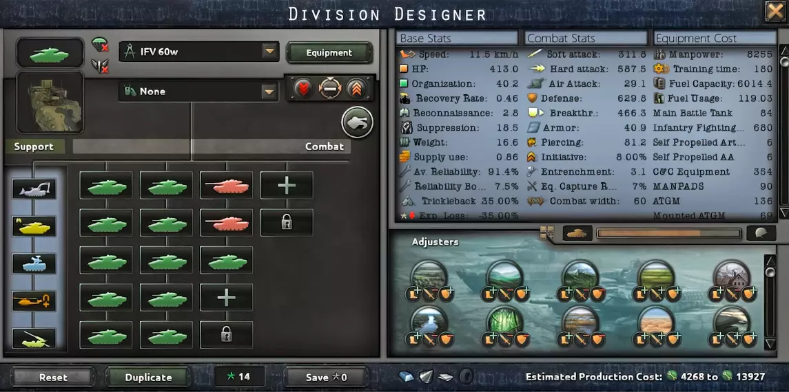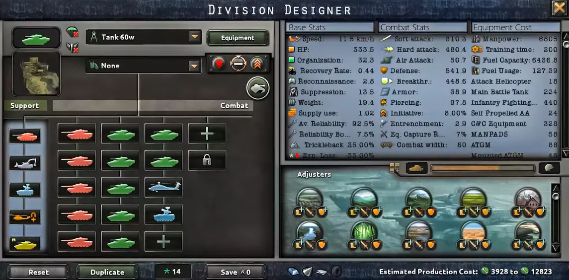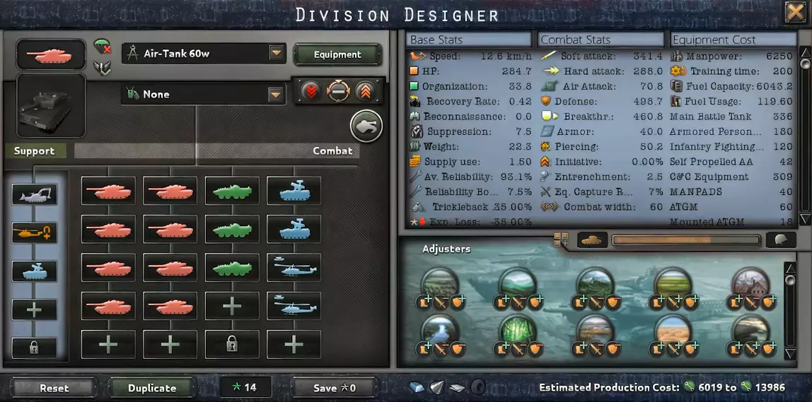 这是一股强大的力量。这里使用步兵战车(BMP)来最大化反坦克(硬)攻击,而坦克则提供必要的装甲和穿甲能力。武装直升机和防空部队将为你提供额外的有用属性。缺点是需要大量不同的昂贵装备,但该师战力出色且势不可挡。只有主要国家才能组建这样的师。这个师几乎不可战胜,结合本载具指南中的载具模板,只有真正强大的直升机师才能与之抗衡。空中坦克师60