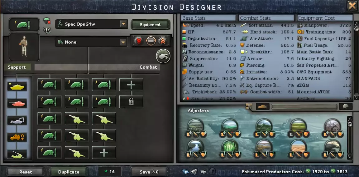 此模板最适合新手开局或小型国家使用。宽度为15的战线可直接使用,无需任何特殊装备类型。其属性以及地形修正效果都非常出色。 【特种部队51】