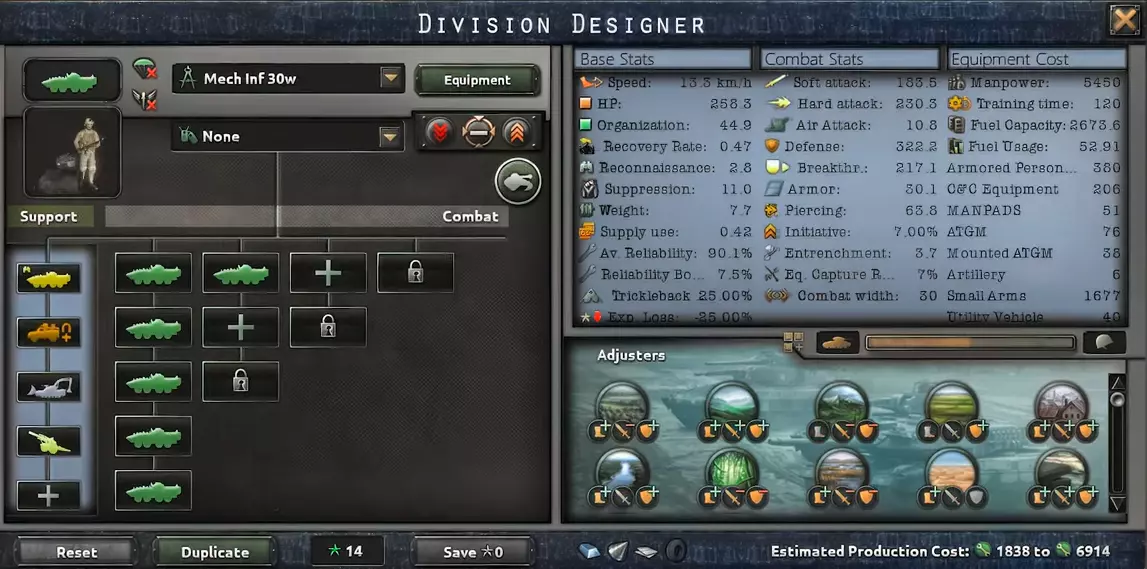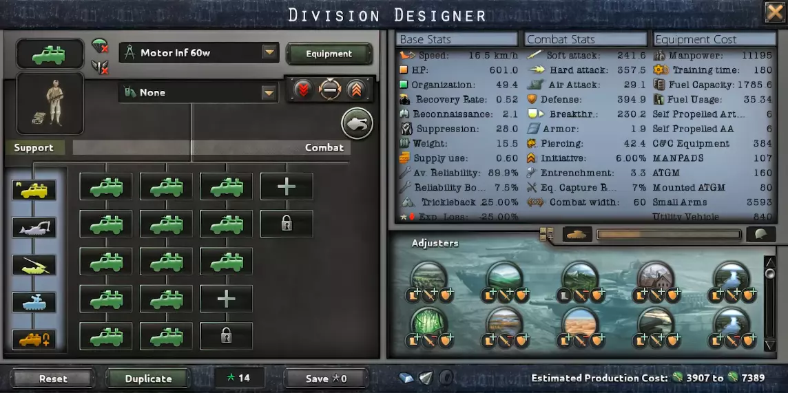 这个30宽度的模板即使对小国也很有用。如果你能为这个师配备所有必要的装备,它几乎可以成功推进除坦克外的所有目标,非常适合手动控制。 如果生产能力不足,可以移除防空营。 机械化步兵(BMP)60