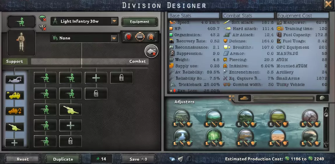 步兵师最适合用于坚守阵地。它们是摩托化步兵的低成本版本。如果您缺乏额外的运输工具,或者希望纯粹追求低成本,那么您会想要使用它们。轻步兵是在前线形成兵力优势的最佳方式。 轻步兵30