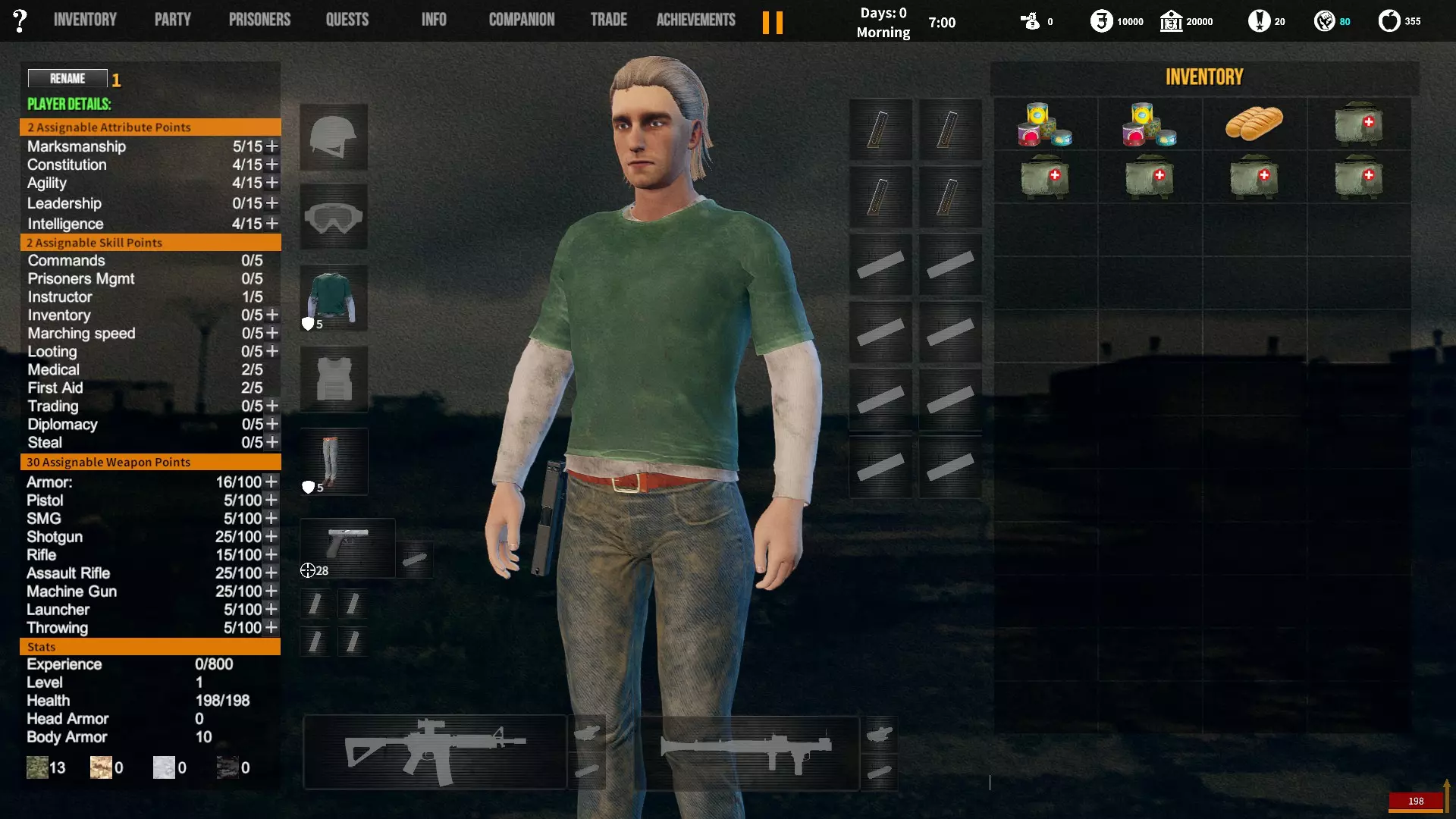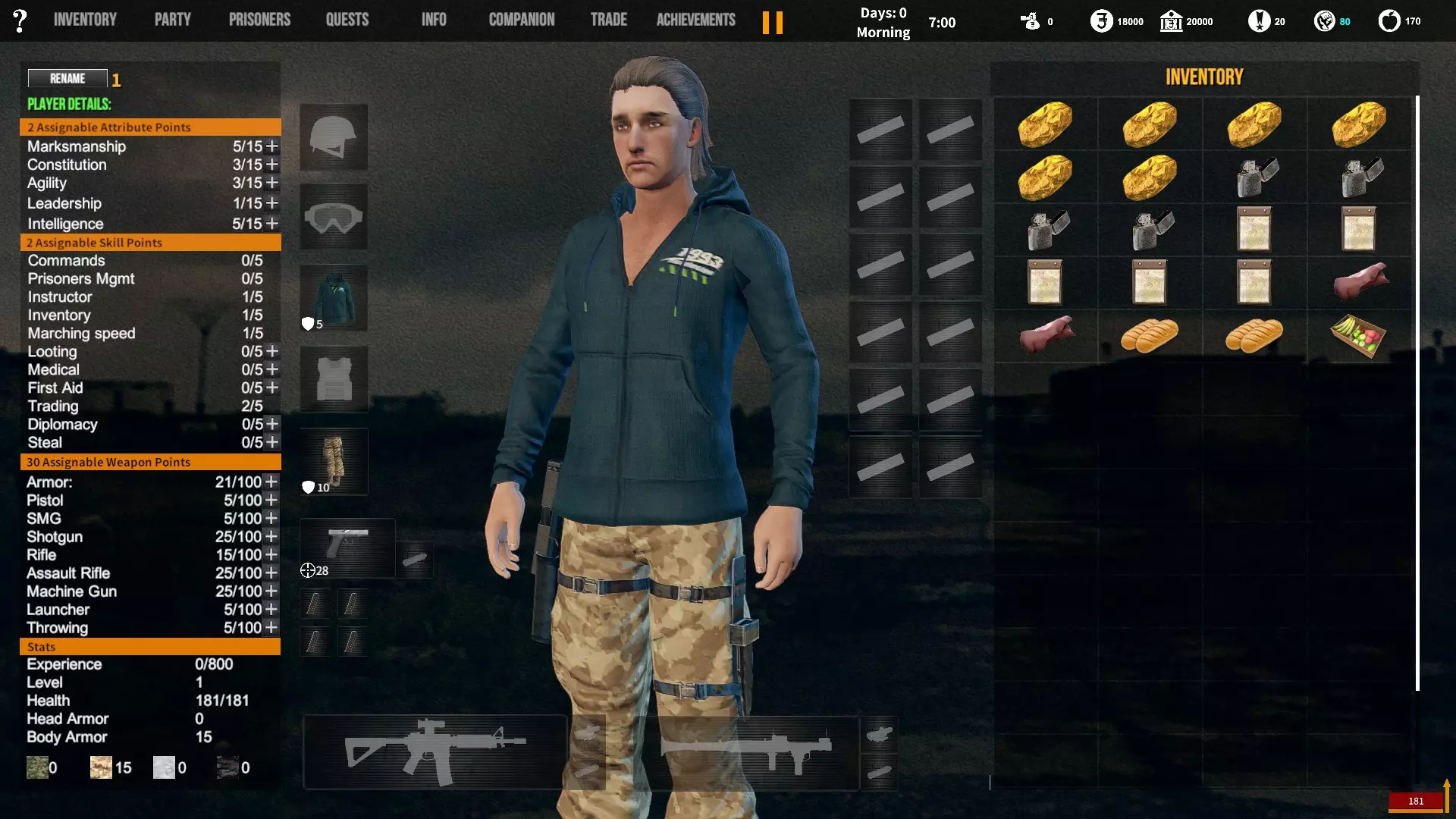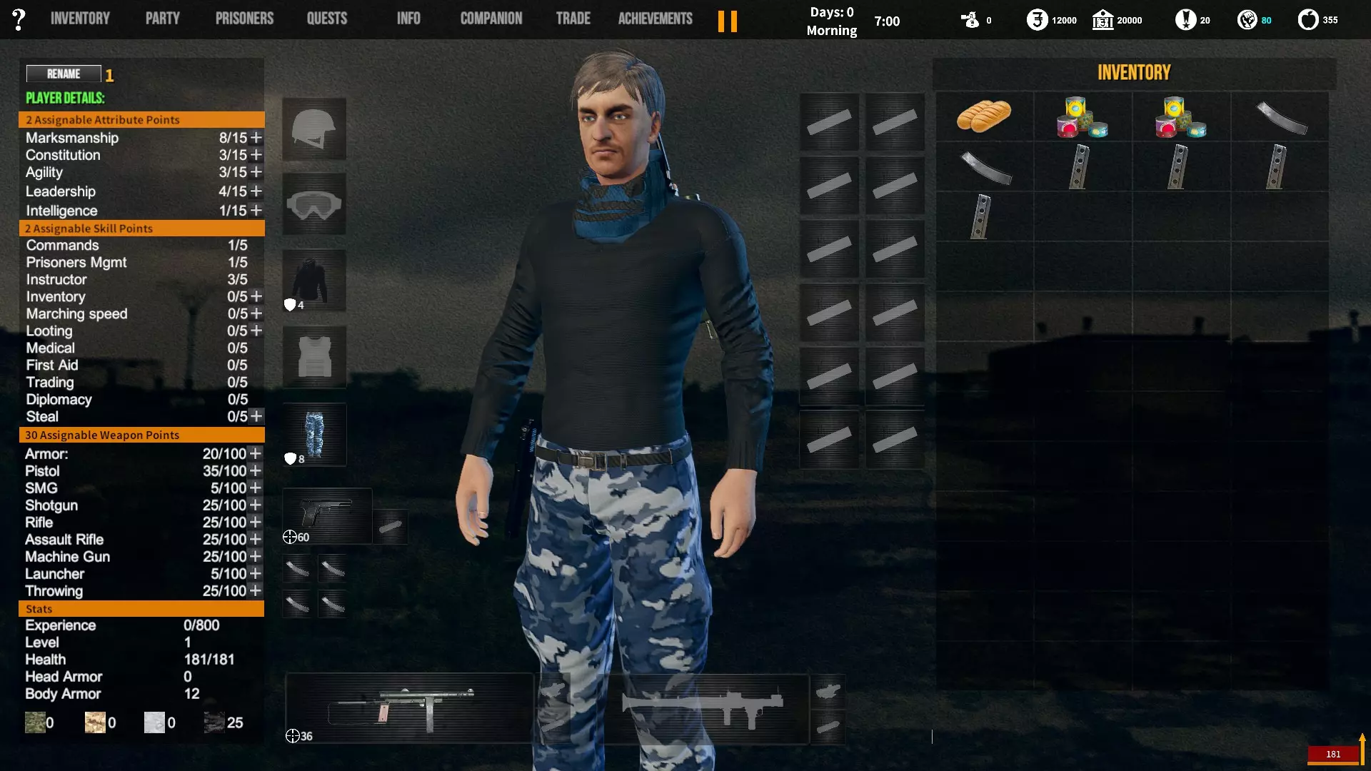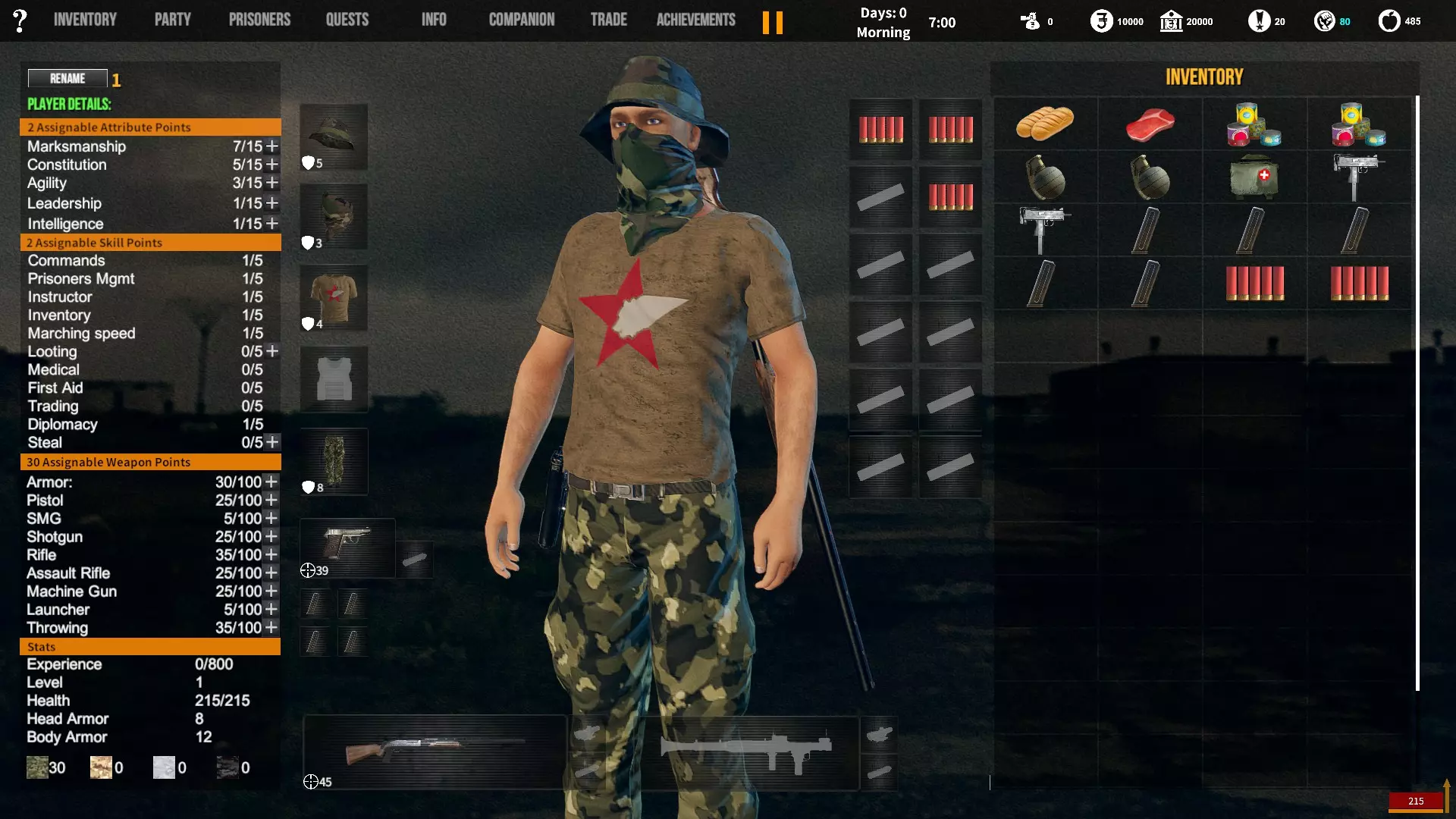 角色背景对玩家初始属性、装备和队伍的影响。适用于游戏1.12版本。 小提示 英语并非我的母语,若您发现任何语法(当然还有事实性)错误,请留言告知。(你可以直接使用,但建议保存该表格的副本并使用副本——否则当多人同时开始更改数值时会出现问题;) 第一选择(你为何来到这片大陆) 选择 属性 技能 武器技能 受伤的新兵 射击+5 体质+2 敏捷+1 教官+1 行军速度+1 急救+1 偷窃+1 护甲+30 冲锋枪+10 步枪+10 突击步枪+10 投掷+50 退役军官 射击+2 敏捷+1 领导力+4 智力+1 指挥+1 囚犯管理+1 教官+2 护甲+10 手枪+30 步枪+10 投掷+20 土匪 射击+3 体质+4 敏捷+1 掠夺+2 偷窃+2 护甲+20 冲锋枪+20 霰弹枪+10 步枪+10 投掷+30 医生 射击+1 体质+1 敏捷+1智力+4 医疗+2 急救+2 护甲+6 失败的商人 射击+1 敏捷+1 领导力+1 智力+5 背包+1 行军速度+1 交易+1 护甲+7 来自权贵家庭 射击+1 体质+2 敏捷+3 领导力+1 智力+2 行军速度+1 掠夺+1 交易+1 外交+1 护甲+7 决心带领人民 射击+3 体质+2 敏捷+1 领导力+1 智力+1 指挥+1 俘虏管理+1 背包+1 行军速度+1 外交+1 护甲+20 手枪+20 步枪+20 投掷+30 难民 射击+1 体质+2 敏捷+3 智力+2 行军速度+2 掠夺+1 交易+1 护甲+7 父亲留给我一座城堡 射击+3 体质+2 敏捷+2 领导力+2 智力+3 指挥+1囚犯管理+1 库存+1 行军速度+1 掠夺+1 交易+1 护甲+15 所有武器技能+5 第二选择(你过往的经历) 选择 属性 技能 武器技能 中学体育教师 体质+1 敏捷+1 教官+1 训练有素的保安 枪法+1 囚犯管理+1 擅长跑步的送货员 敏捷+1 库存+1 行军速度+1 从不失手的小偷 敏捷+1 掠夺+1 偷窃+1 热心实习护士 智力+1 医疗+1 急救+1 学生会副主席 领导力+1 智力+1 外交+1 勤奋的射击运动员 枪法+2 体质+1 教官+1 第三选择(你的爱好) 选择 属性 技能 武器技能 野外狩猎 枪法+1 体质+1 霰弹枪+20步枪+10 健身房力量训练 体质+1 护甲+10 攀岩、远足和露营 敏捷+1 背包容量+1 行军速度+1 社交与交友 领导力+1 外交+1 阅读书籍 智力+2 远程射击 枪法+1 手枪+5 冲锋枪+5 步枪+5 突击步枪+5 第四选择(赢得战争的最重要因素) 选项 属性 技能 武器技能 出色的战斗技巧 枪法+1 体质+1 敏捷+1 护甲+10 所有武器技能+5 完美的团队合作 领导力+1 指挥+1 教导+1 可靠的后勤保障 智力+1 背包容量+1 行军速度+1 医疗+1 周密的战术 智力+2 强大的经济支持 智力+1 搜刮+1 交易+1 选项 属性 技能 武器技能直接射击并以优势火力压制:枪法+1,突击步枪+20,机枪+20 主动进行远距离射击:枪法+2,步枪+30 冲锋并与敌人进行近距离战斗:冲锋枪+20,投掷+10 使用游击战术交战并撤退:敏捷+2 呼叫增援并尝试包围敌人:领导力+2 在敌人路径上设伏:智力+2 第六选项(战火蔓延至你的村庄) 选项 属性 技能 武器技能 倾尽所有资产购买 firearms(枪械):射击+1 变卖所有物资囤积大量食物和药品:库存+1,交易+1 趁乱劫掠附近村庄:掠夺+1,偷窃+1 召集民兵进行抵抗:领导力+1,指挥+1 带领所有村民撤离:行军速度+2 训练村民进行防御:领导力+1,教官+1 尝试说服敌人:外交+1 装备与部队 似乎只有第一个选项会决定你的部队和装备。你的士兵装备在不同游戏中可能会略有差异,但你的装备不会改变。如果我说错了,请在下方留言。 1. 受伤的新兵
