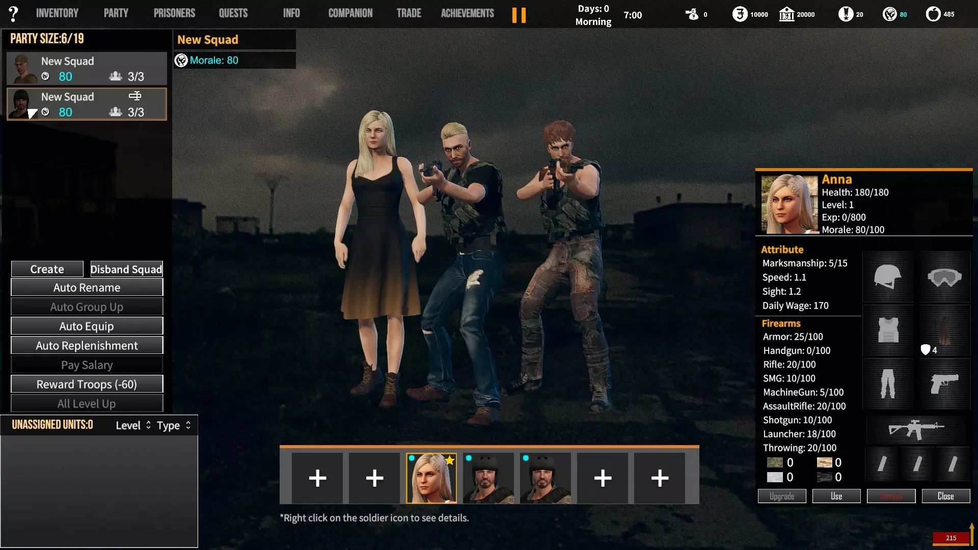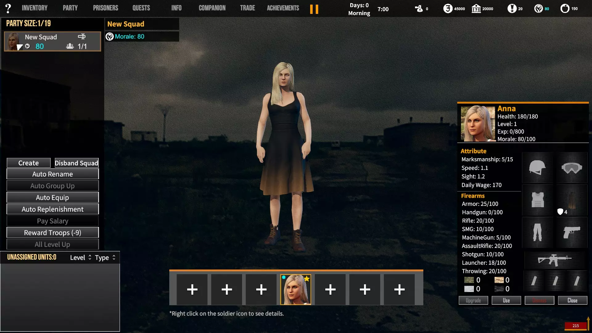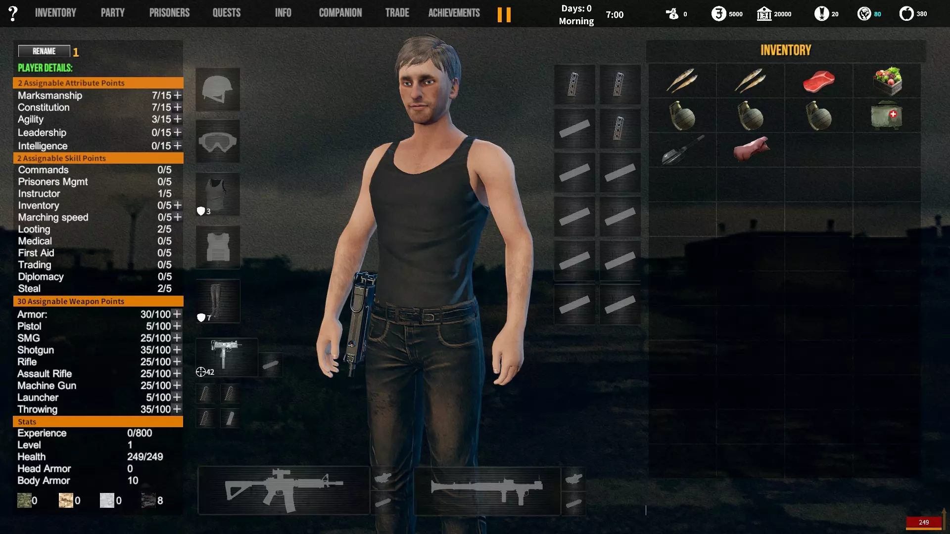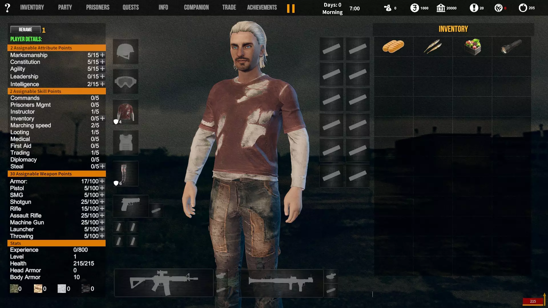 角色背景对玩家初始属性、装备和队伍的影响。适用于游戏1.12版本。 小提示 英语并非我的母语,若您发现任何语法(当然还有事实性)错误,请留言告知。(你可以直接使用,但建议保存该表格的副本并使用副本——否则当多人同时开始更改数值时会出现问题;) 第一选择(你为何来到这片大陆) 选择 属性 技能 武器技能 受伤的新兵 射击+5 体质+2 敏捷+1 教官+1 行军速度+1 急救+1 偷窃+1 护甲+30 冲锋枪+10 步枪+10 突击步枪+10 投掷+50 退役军官 射击+2 敏捷+1 领导力+4 智力+1 指挥+1 囚犯管理+1 教官+2 护甲+10 手枪+30 步枪+10 投掷+20 土匪 射击+3 体质+4 敏捷+1 掠夺+2 偷窃+2 护甲+20 冲锋枪+20 霰弹枪+10 步枪+10 投掷+30 医生 射击+1 体质+1 敏捷+1智力+4 医疗+2 急救+2 护甲+6 失败的商人 射击+1 敏捷+1 领导力+1 智力+5 背包+1 行军速度+1 交易+1 护甲+7 来自权贵家庭 射击+1 体质+2 敏捷+3 领导力+1 智力+2 行军速度+1 掠夺+1 交易+1 外交+1 护甲+7 决心带领人民 射击+3 体质+2 敏捷+1 领导力+1 智力+1 指挥+1 俘虏管理+1 背包+1 行军速度+1 外交+1 护甲+20 手枪+20 步枪+20 投掷+30 难民 射击+1 体质+2 敏捷+3 智力+2 行军速度+2 掠夺+1 交易+1 护甲+7 父亲留给我一座城堡 射击+3 体质+2 敏捷+2 领导力+2 智力+3 指挥+1囚犯管理+1 库存+1 行军速度+1 掠夺+1 交易+1 护甲+15 所有武器技能+5 第二选择(你过往的经历) 选择 属性 技能 武器技能 中学体育教师 体质+1 敏捷+1 教官+1 训练有素的保安 枪法+1 囚犯管理+1 擅长跑步的送货员 敏捷+1 库存+1 行军速度+1 从不失手的小偷 敏捷+1 掠夺+1 偷窃+1 热心实习护士 智力+1 医疗+1 急救+1 学生会副主席 领导力+1 智力+1 外交+1 勤奋的射击运动员 枪法+2 体质+1 教官+1 第三选择(你的爱好) 选择 属性 技能 武器技能 野外狩猎 枪法+1 体质+1 霰弹枪+20步枪+10 健身房力量训练 体质+1 护甲+10 攀岩、远足和露营 敏捷+1 背包容量+1 行军速度+1 社交与交友 领导力+1 外交+1 阅读书籍 智力+2 远程射击 枪法+1 手枪+5 冲锋枪+5 步枪+5 突击步枪+5 第四选择(赢得战争的最重要因素) 选项 属性 技能 武器技能 出色的战斗技巧 枪法+1 体质+1 敏捷+1 护甲+10 所有武器技能+5 完美的团队合作 领导力+1 指挥+1 教导+1 可靠的后勤保障 智力+1 背包容量+1 行军速度+1 医疗+1 周密的战术 智力+2 强大的经济支持 智力+1 搜刮+1 交易+1 选项 属性 技能 武器技能直接射击并以优势火力压制:枪法+1,突击步枪+20,机枪+20 主动进行远距离射击:枪法+2,步枪+30 冲锋并与敌人进行近距离战斗:冲锋枪+20,投掷+10 使用游击战术交战并撤退:敏捷+2 呼叫增援并尝试包围敌人:领导力+2 在敌人路径上设伏:智力+2 第六选项(战火蔓延至你的村庄) 选项 属性 技能 武器技能 倾尽所有资产购买 firearms(枪械):射击+1 变卖所有物资囤积大量食物和药品:库存+1,交易+1 趁乱劫掠附近村庄:掠夺+1,偷窃+1 召集民兵进行抵抗:领导力+1,指挥+1 带领所有村民撤离:行军速度+2 训练村民进行防御:领导力+1,教官+1 尝试说服敌人:外交+1 装备与部队 似乎只有第一个选项会决定你的部队和装备。你的士兵装备在不同游戏中可能会略有差异,但你的装备不会改变。如果我说错了,请在下方留言。 1. 受伤的新兵