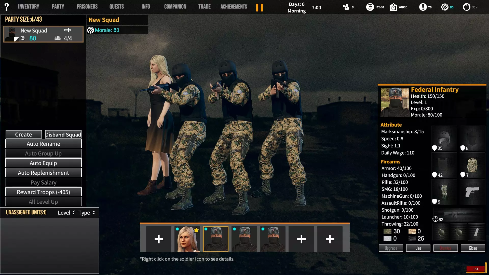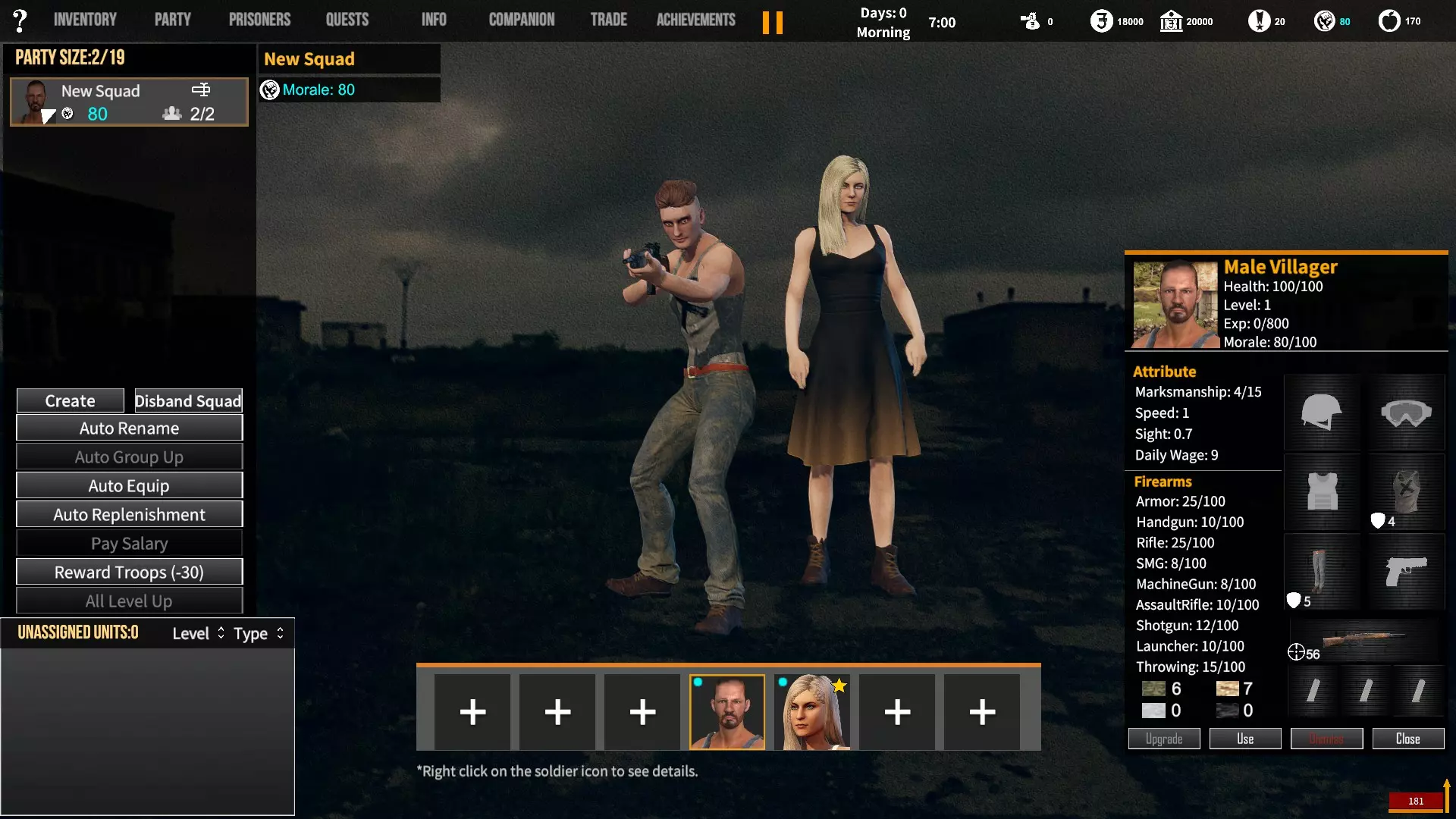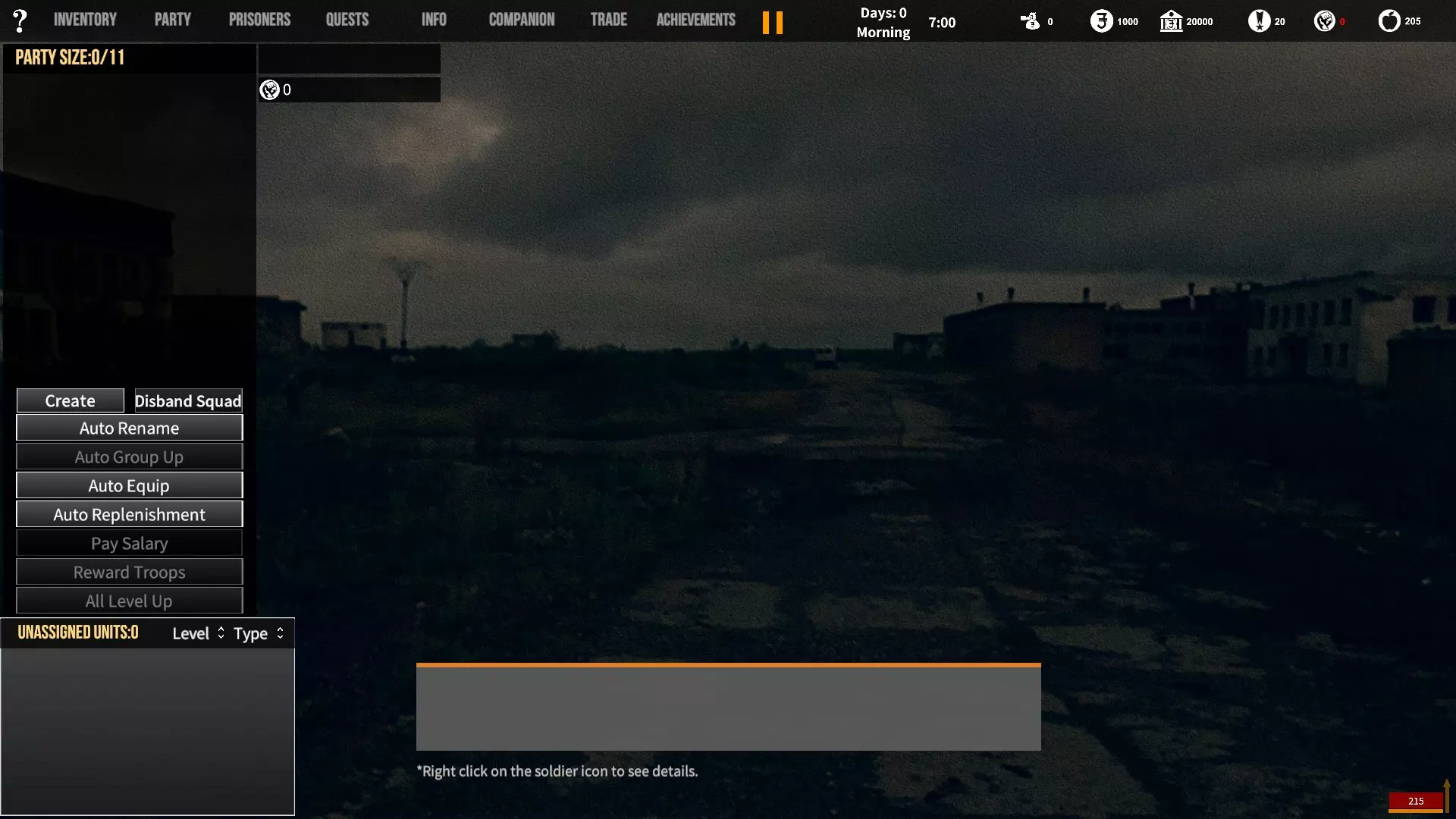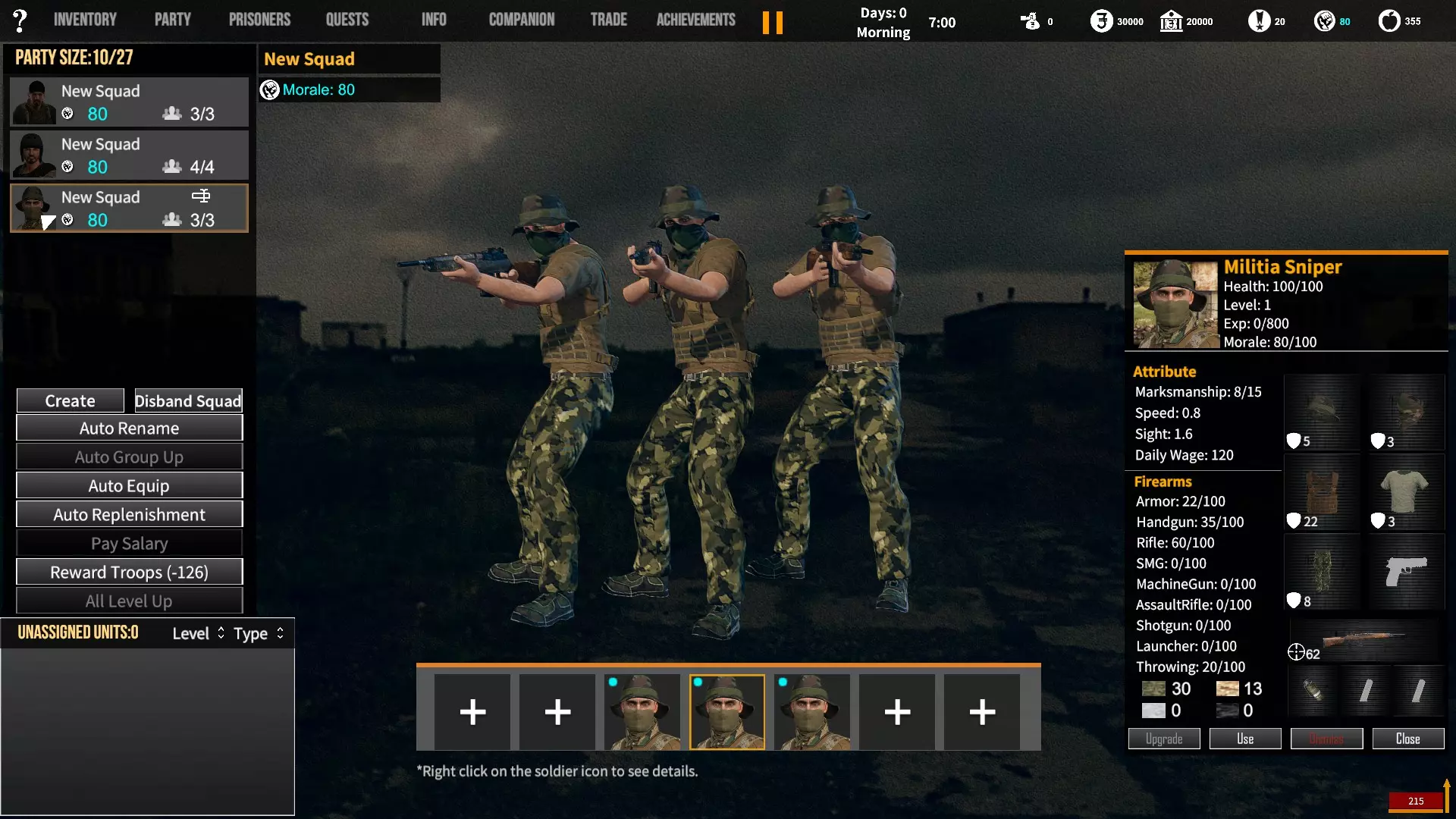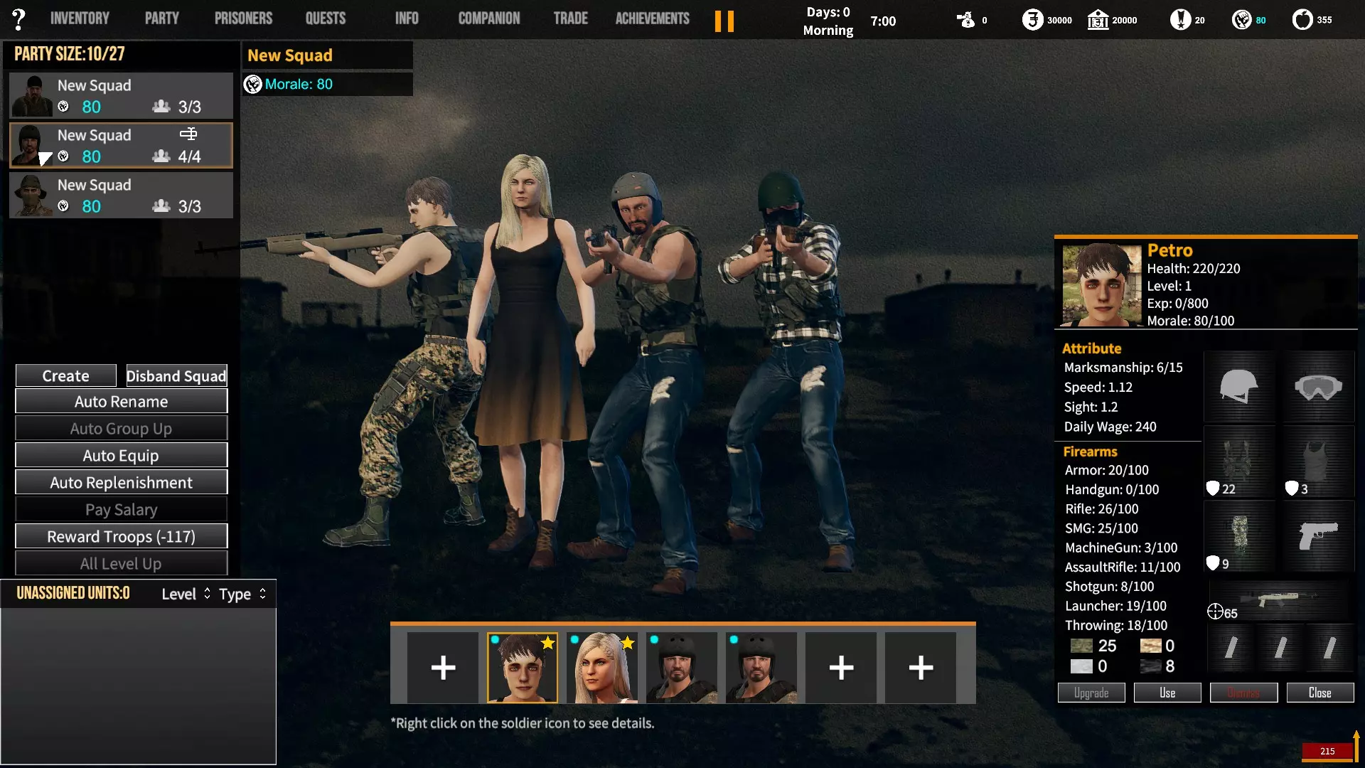 角色背景对玩家初始属性、装备和队伍的影响。适用于游戏1.12版本。 小提示 英语并非我的母语,若您发现任何语法(当然还有事实性)错误,请留言告知。(你可以直接使用,但建议保存该表格的副本并使用副本——否则当多人同时开始更改数值时会出现问题;) 第一选择(你为何来到这片大陆) 选择 属性 技能 武器技能 受伤的新兵 射击+5 体质+2 敏捷+1 教官+1 行军速度+1 急救+1 偷窃+1 护甲+30 冲锋枪+10 步枪+10 突击步枪+10 投掷+50 退役军官 射击+2 敏捷+1 领导力+4 智力+1 指挥+1 囚犯管理+1 教官+2 护甲+10 手枪+30 步枪+10 投掷+20 土匪 射击+3 体质+4 敏捷+1 掠夺+2 偷窃+2 护甲+20 冲锋枪+20 霰弹枪+10 步枪+10 投掷+30 医生 射击+1 体质+1 敏捷+1智力+4 医疗+2 急救+2 护甲+6 失败的商人 射击+1 敏捷+1 领导力+1 智力+5 背包+1 行军速度+1 交易+1 护甲+7 来自权贵家庭 射击+1 体质+2 敏捷+3 领导力+1 智力+2 行军速度+1 掠夺+1 交易+1 外交+1 护甲+7 决心带领人民 射击+3 体质+2 敏捷+1 领导力+1 智力+1 指挥+1 俘虏管理+1 背包+1 行军速度+1 外交+1 护甲+20 手枪+20 步枪+20 投掷+30 难民 射击+1 体质+2 敏捷+3 智力+2 行军速度+2 掠夺+1 交易+1 护甲+7 父亲留给我一座城堡 射击+3 体质+2 敏捷+2 领导力+2 智力+3 指挥+1囚犯管理+1 库存+1 行军速度+1 掠夺+1 交易+1 护甲+15 所有武器技能+5 第二选择(你过往的经历) 选择 属性 技能 武器技能 中学体育教师 体质+1 敏捷+1 教官+1 训练有素的保安 枪法+1 囚犯管理+1 擅长跑步的送货员 敏捷+1 库存+1 行军速度+1 从不失手的小偷 敏捷+1 掠夺+1 偷窃+1 热心实习护士 智力+1 医疗+1 急救+1 学生会副主席 领导力+1 智力+1 外交+1 勤奋的射击运动员 枪法+2 体质+1 教官+1 第三选择(你的爱好) 选择 属性 技能 武器技能 野外狩猎 枪法+1 体质+1 霰弹枪+20步枪+10 健身房力量训练 体质+1 护甲+10 攀岩、远足和露营 敏捷+1 背包容量+1 行军速度+1 社交与交友 领导力+1 外交+1 阅读书籍 智力+2 远程射击 枪法+1 手枪+5 冲锋枪+5 步枪+5 突击步枪+5 第四选择(赢得战争的最重要因素) 选项 属性 技能 武器技能 出色的战斗技巧 枪法+1 体质+1 敏捷+1 护甲+10 所有武器技能+5 完美的团队合作 领导力+1 指挥+1 教导+1 可靠的后勤保障 智力+1 背包容量+1 行军速度+1 医疗+1 周密的战术 智力+2 强大的经济支持 智力+1 搜刮+1 交易+1 选项 属性 技能 武器技能直接射击并以优势火力压制:枪法+1,突击步枪+20,机枪+20 主动进行远距离射击:枪法+2,步枪+30 冲锋并与敌人进行近距离战斗:冲锋枪+20,投掷+10 使用游击战术交战并撤退:敏捷+2 呼叫增援并尝试包围敌人:领导力+2 在敌人路径上设伏:智力+2 第六选项(战火蔓延至你的村庄) 选项 属性 技能 武器技能 倾尽所有资产购买 firearms(枪械):射击+1 变卖所有物资囤积大量食物和药品:库存+1,交易+1 趁乱劫掠附近村庄:掠夺+1,偷窃+1 召集民兵进行抵抗:领导力+1,指挥+1 带领所有村民撤离:行军速度+2 训练村民进行防御:领导力+1,教官+1 尝试说服敌人:外交+1 装备与部队 似乎只有第一个选项会决定你的部队和装备。你的士兵装备在不同游戏中可能会略有差异,但你的装备不会改变。如果我说错了,请在下方留言。 1. 受伤的新兵