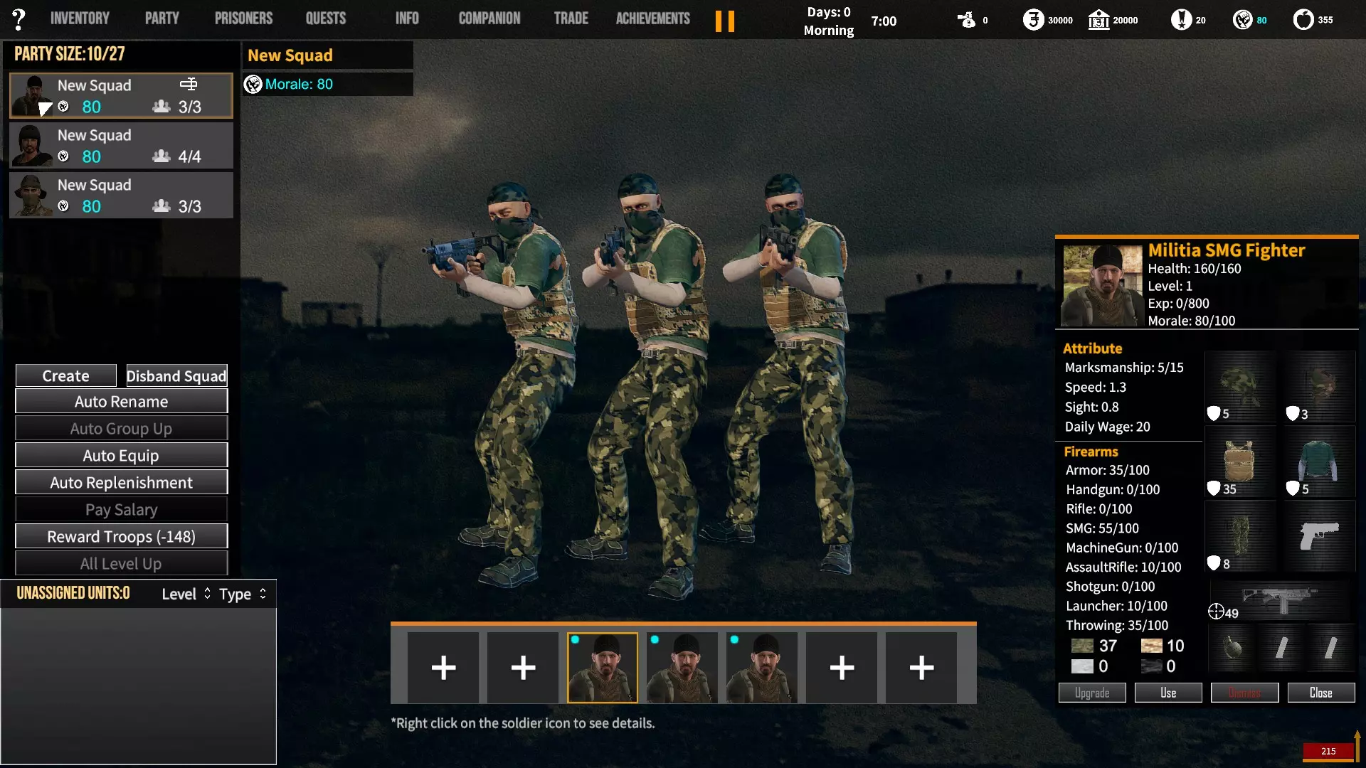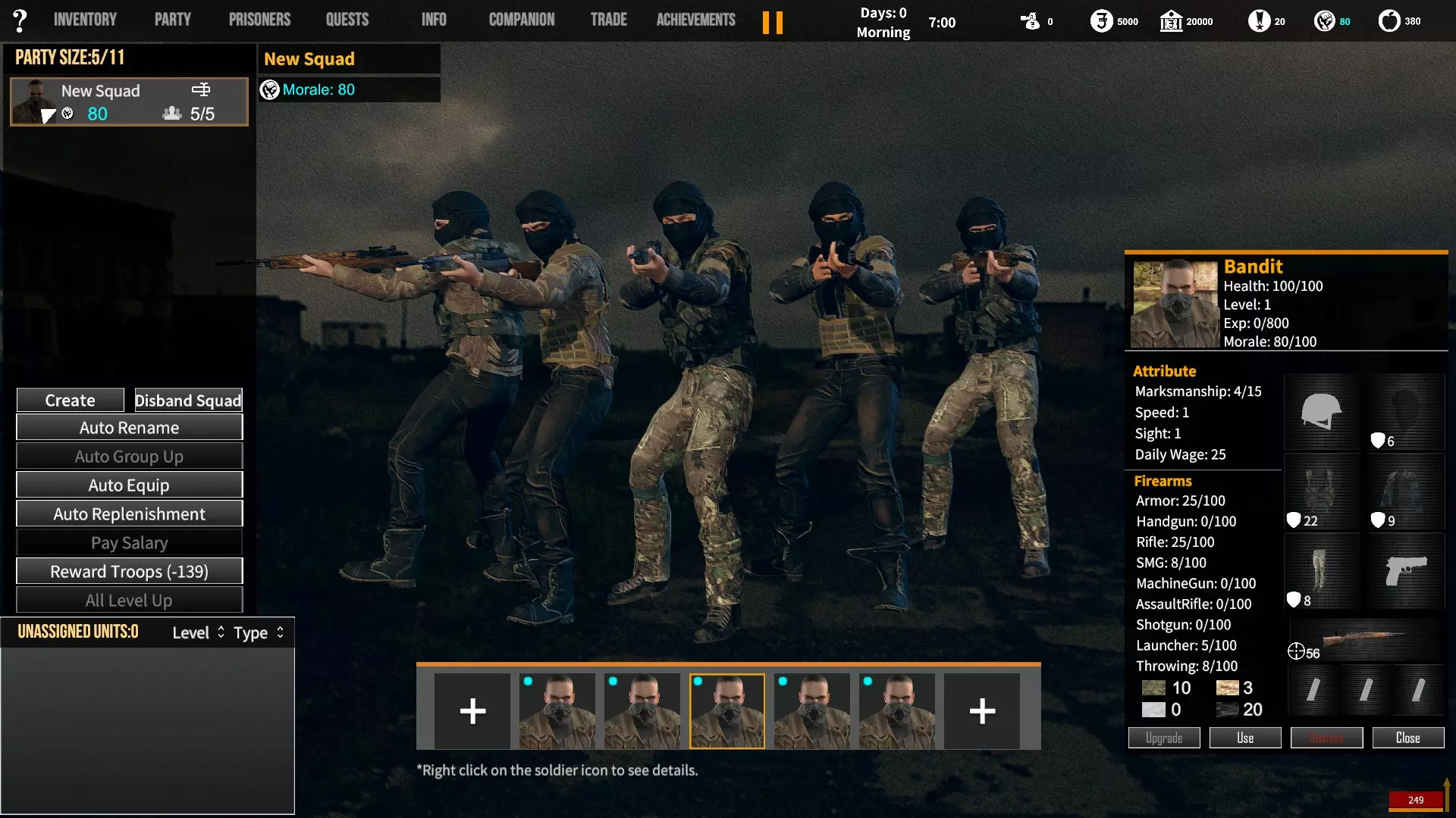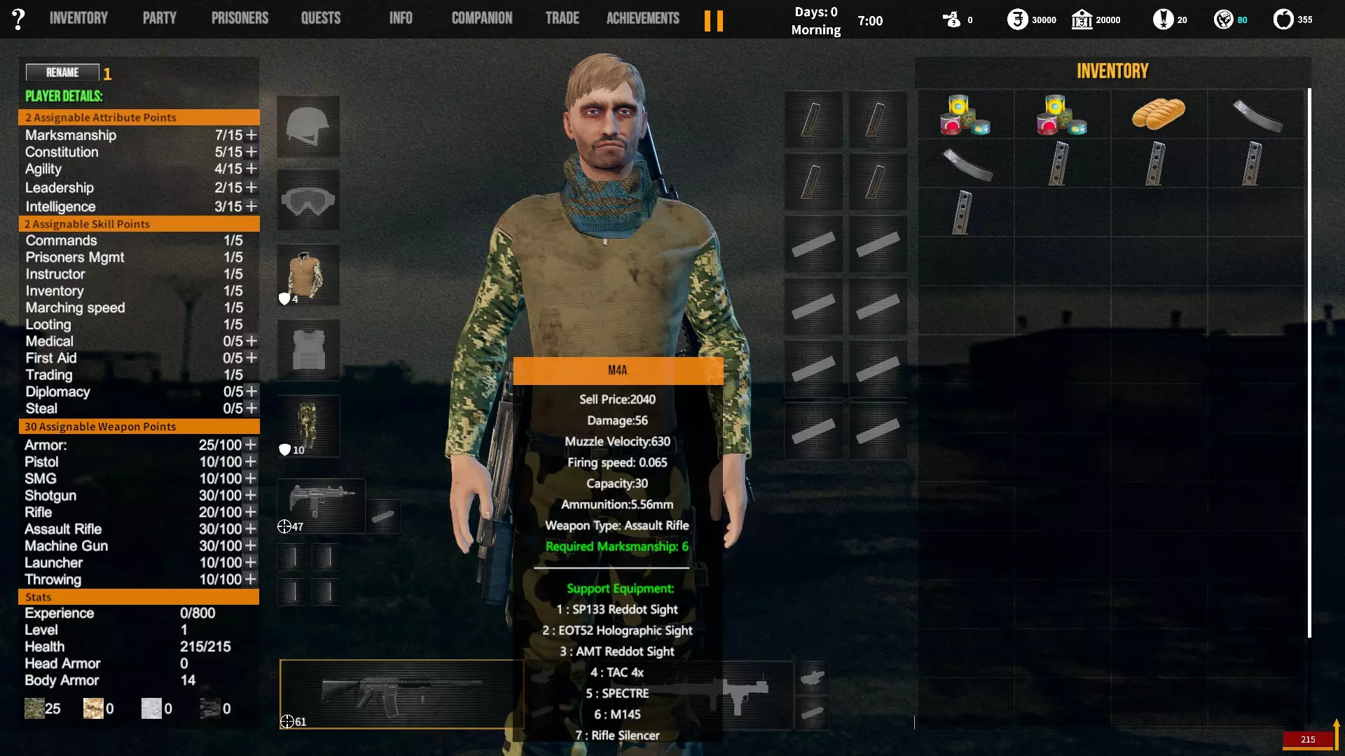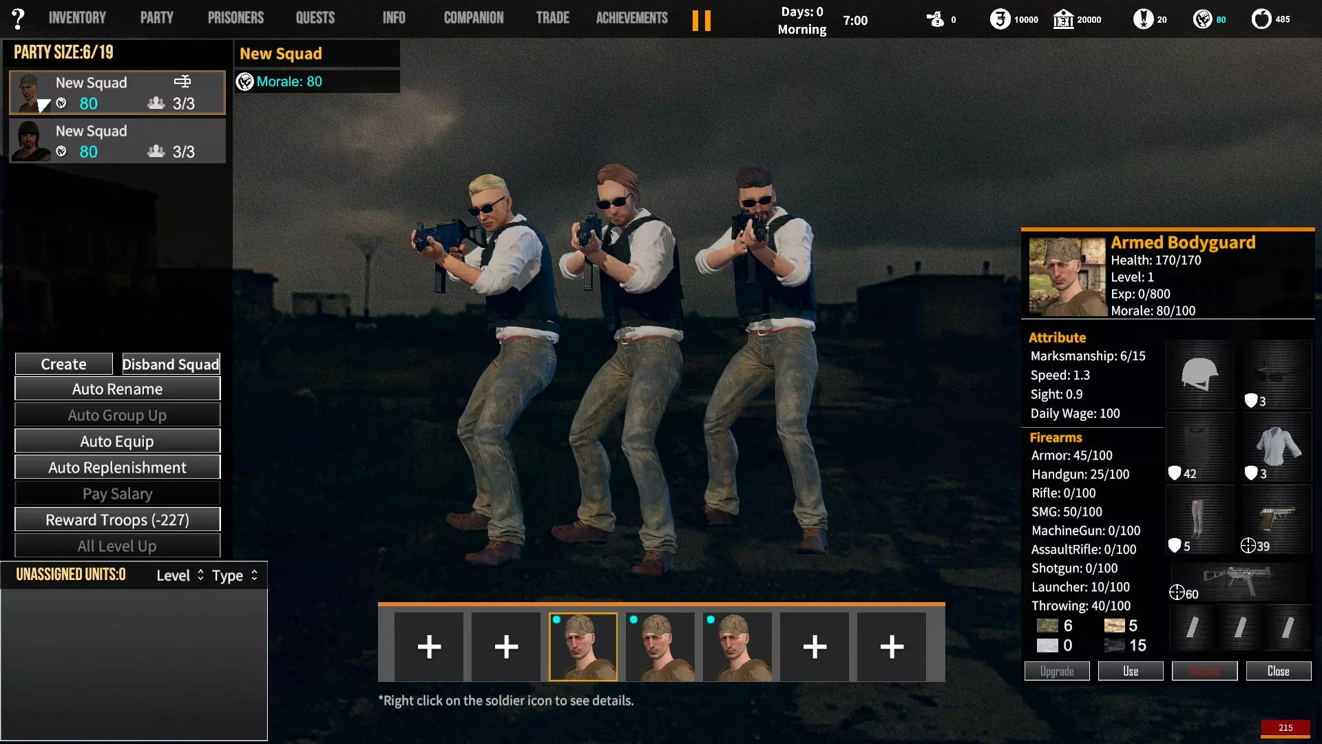 角色背景对玩家初始属性、装备和队伍的影响。适用于游戏1.12版本。 小提示 英语并非我的母语,若您发现任何语法(当然还有事实性)错误,请留言告知。(你可以直接使用,但建议保存该表格的副本并使用副本——否则当多人同时开始更改数值时会出现问题;) 第一选择(你为何来到这片大陆) 选择 属性 技能 武器技能 受伤的新兵 射击+5 体质+2 敏捷+1 教官+1 行军速度+1 急救+1 偷窃+1 护甲+30 冲锋枪+10 步枪+10 突击步枪+10 投掷+50 退役军官 射击+2 敏捷+1 领导力+4 智力+1 指挥+1 囚犯管理+1 教官+2 护甲+10 手枪+30 步枪+10 投掷+20 土匪 射击+3 体质+4 敏捷+1 掠夺+2 偷窃+2 护甲+20 冲锋枪+20 霰弹枪+10 步枪+10 投掷+30 医生 射击+1 体质+1 敏捷+1智力+4 医疗+2 急救+2 护甲+6 失败的商人 射击+1 敏捷+1 领导力+1 智力+5 背包+1 行军速度+1 交易+1 护甲+7 来自权贵家庭 射击+1 体质+2 敏捷+3 领导力+1 智力+2 行军速度+1 掠夺+1 交易+1 外交+1 护甲+7 决心带领人民 射击+3 体质+2 敏捷+1 领导力+1 智力+1 指挥+1 俘虏管理+1 背包+1 行军速度+1 外交+1 护甲+20 手枪+20 步枪+20 投掷+30 难民 射击+1 体质+2 敏捷+3 智力+2 行军速度+2 掠夺+1 交易+1 护甲+7 父亲留给我一座城堡 射击+3 体质+2 敏捷+2 领导力+2 智力+3 指挥+1囚犯管理+1 库存+1 行军速度+1 掠夺+1 交易+1 护甲+15 所有武器技能+5 第二选择(你过往的经历) 选择 属性 技能 武器技能 中学体育教师 体质+1 敏捷+1 教官+1 训练有素的保安 枪法+1 囚犯管理+1 擅长跑步的送货员 敏捷+1 库存+1 行军速度+1 从不失手的小偷 敏捷+1 掠夺+1 偷窃+1 热心实习护士 智力+1 医疗+1 急救+1 学生会副主席 领导力+1 智力+1 外交+1 勤奋的射击运动员 枪法+2 体质+1 教官+1 第三选择(你的爱好) 选择 属性 技能 武器技能 野外狩猎 枪法+1 体质+1 霰弹枪+20步枪+10 健身房力量训练 体质+1 护甲+10 攀岩、远足和露营 敏捷+1 背包容量+1 行军速度+1 社交与交友 领导力+1 外交+1 阅读书籍 智力+2 远程射击 枪法+1 手枪+5 冲锋枪+5 步枪+5 突击步枪+5 第四选择(赢得战争的最重要因素) 选项 属性 技能 武器技能 出色的战斗技巧 枪法+1 体质+1 敏捷+1 护甲+10 所有武器技能+5 完美的团队合作 领导力+1 指挥+1 教导+1 可靠的后勤保障 智力+1 背包容量+1 行军速度+1 医疗+1 周密的战术 智力+2 强大的经济支持 智力+1 搜刮+1 交易+1 选项 属性 技能 武器技能直接射击并以优势火力压制:枪法+1,突击步枪+20,机枪+20 主动进行远距离射击:枪法+2,步枪+30 冲锋并与敌人进行近距离战斗:冲锋枪+20,投掷+10 使用游击战术交战并撤退:敏捷+2 呼叫增援并尝试包围敌人:领导力+2 在敌人路径上设伏:智力+2 第六选项(战火蔓延至你的村庄) 选项 属性 技能 武器技能 倾尽所有资产购买 firearms(枪械):射击+1 变卖所有物资囤积大量食物和药品:库存+1,交易+1 趁乱劫掠附近村庄:掠夺+1,偷窃+1 召集民兵进行抵抗:领导力+1,指挥+1 带领所有村民撤离:行军速度+2 训练村民进行防御:领导力+1,教官+1 尝试说服敌人:外交+1 装备与部队 似乎只有第一个选项会决定你的部队和装备。你的士兵装备在不同游戏中可能会略有差异,但你的装备不会改变。如果我说错了,请在下方留言。 1. 受伤的新兵