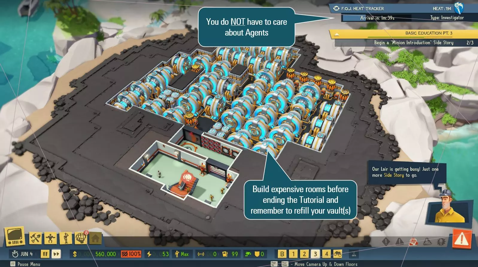 9.研究楼梯并连接到另一楼层。建造大型且昂贵的设施,例如大型发电机室。 10.当你觉得已准备好进行世界统治(拥有足够的黄金、研究成果和基地建设)时,去完成技工的教程目标。 11.执行卑劣行径并征服世界。 永远记住:要巧干,不要苦干!