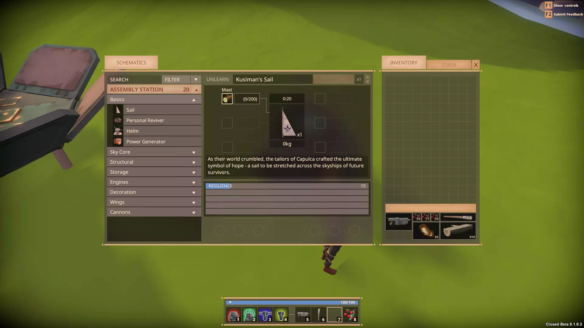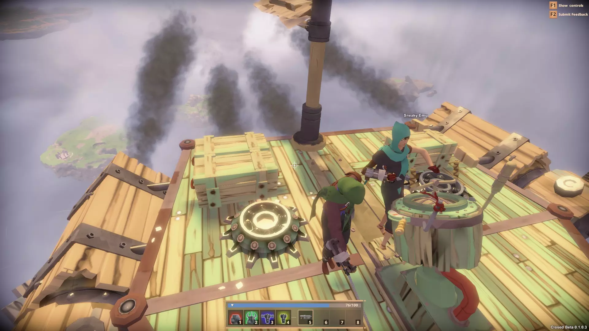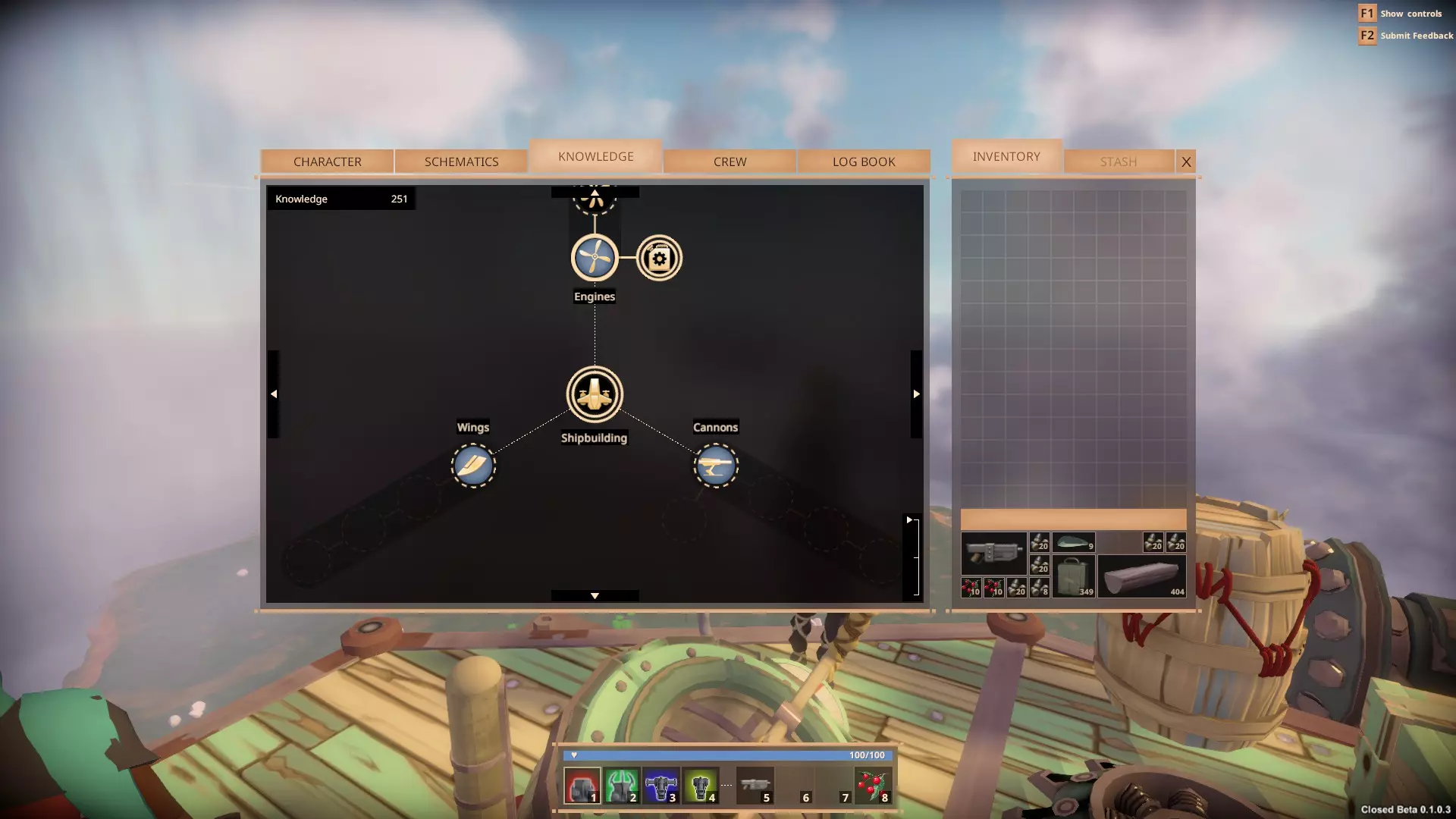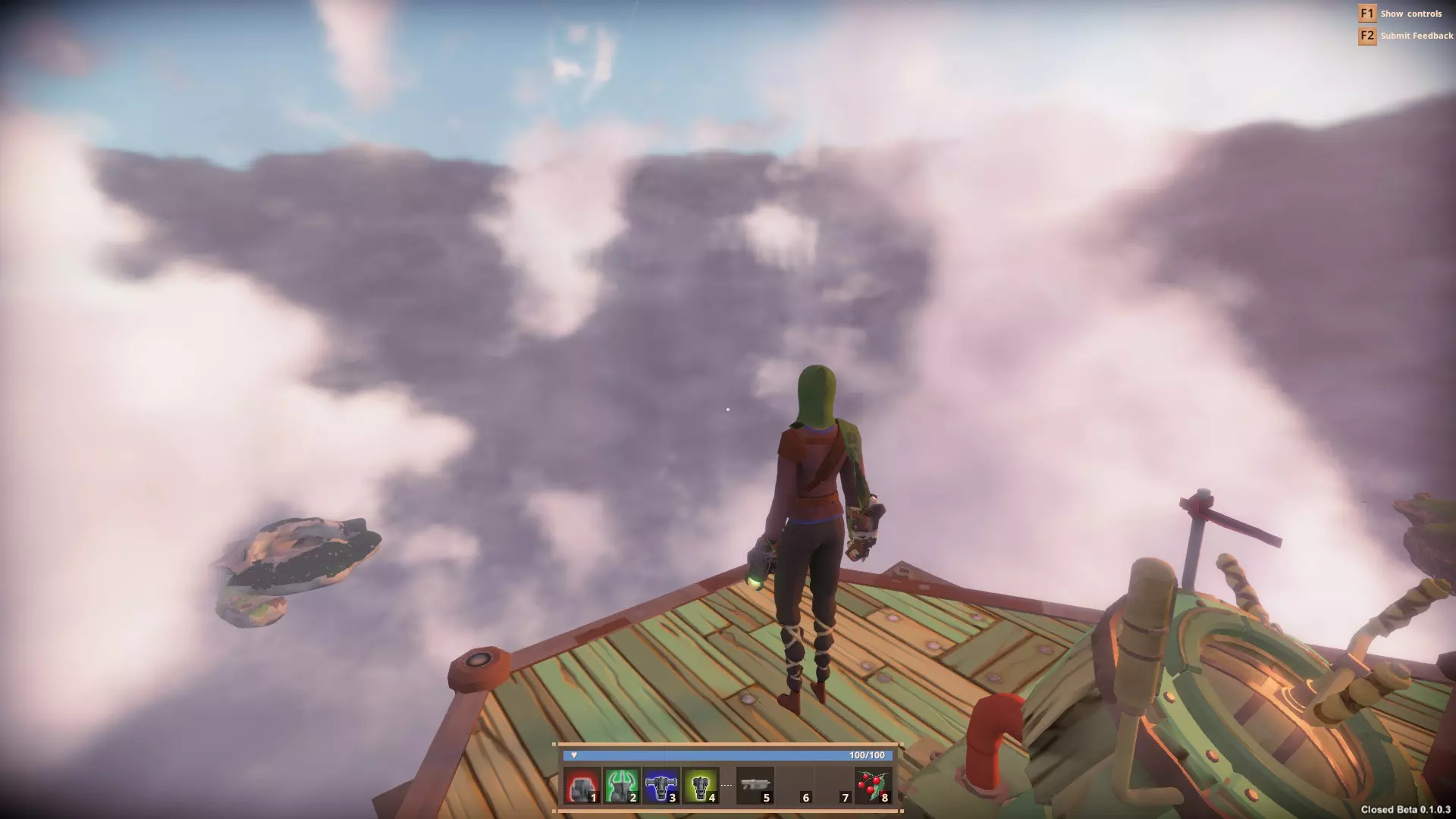 警告! 若你不够谨慎,你的飞船可能会被偷走。若你疏忽大意,你的战利品可能会被夺走。 在造船厂使用打捞工具可能会导致保护穹顶降下,此时任何人都可以劫持你的飞船并为所欲为。 2. 从何处开始 - 角色标签页 游戏的 controls 起初会有些别扭。你拥有标准移动方式,但很大一部分移动将由抓钩控制,为你的移动增添了第三维度。这需要一点时间来适应,但经过几次失误后,你将能轻松开采岛屿底部的矿石,或登上飞船并在桅杆间荡来荡去。 除非你做过调查(目前相关资料并不多),否则初次开始游戏时,你会完全不知道该做什么。先从学习操作开始。你的【抓钩】将是你的救命稻草,无论是误操作从船上掉落到下方空无一物的地方,还是遭遇一两个海盗袭击需要逃跑时,抓钩都是你主要的移动方式。 在这款游戏中,你的目标是收集足够的材料来建造自己的飞船,然后飞向天空进行探索。要做到这一点,你需要三种基本资源:木材、金属和知识。 木材和金属都有品质和重量之分。 品质越高,为你制作的部件提供的属性就越好。 它们有轻量、重型等不同类型,还有介于两者之间的各种情况。你用来建造飞船的木材类型,会对飞船的重量、生命值、移动速度、转向速度等产生巨大影响。知识是需要收集的最重要资源。没有知识,你就无法推进游戏进程,就是这么简单。我稍后会讲讲如何获取知识。 每艘船都有一定的载重上限,初始载重为1000千克。要提升载重,你需要穿过第一道风墙,收集蓝图以解锁新的【Atlas】部件。