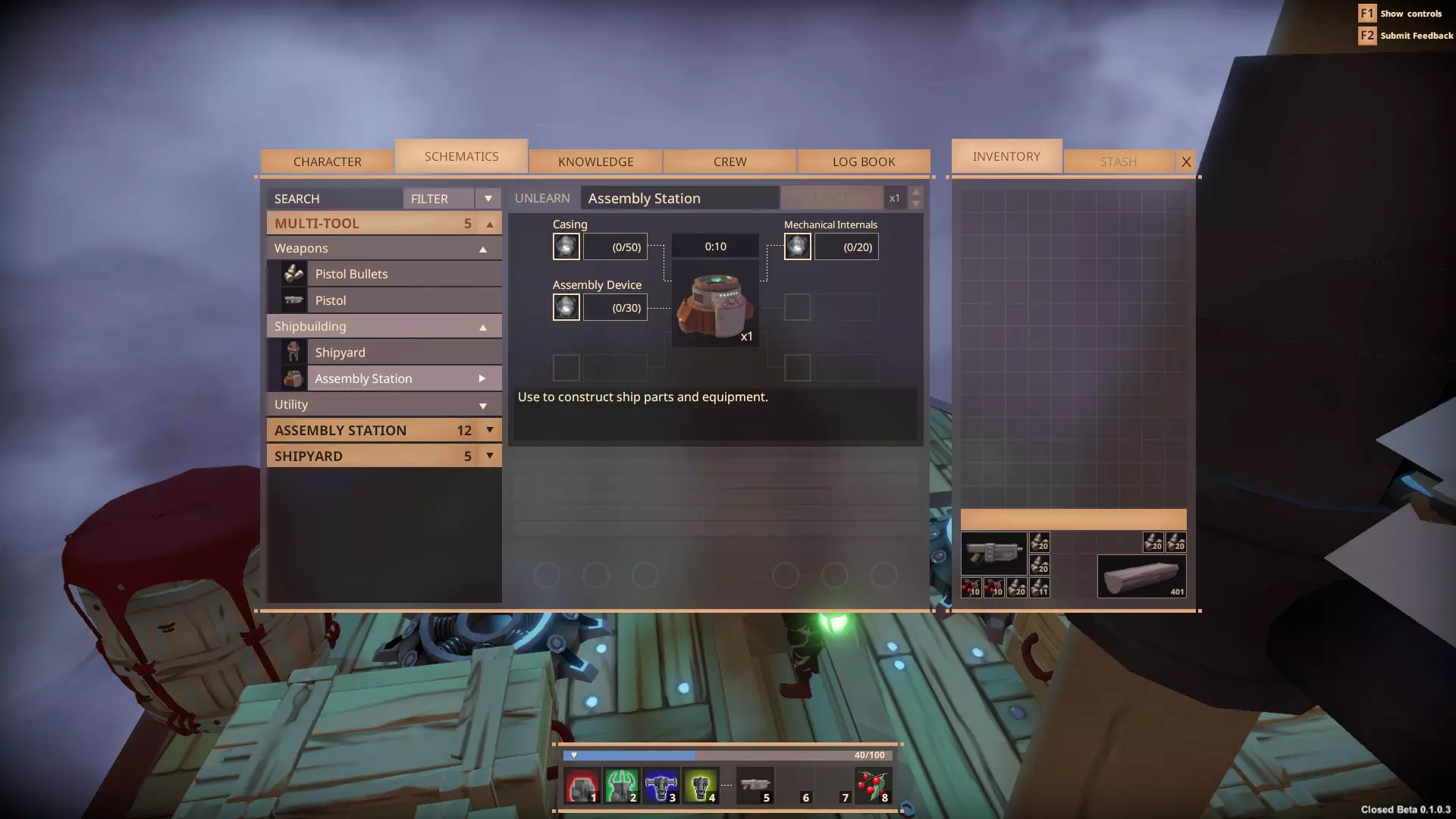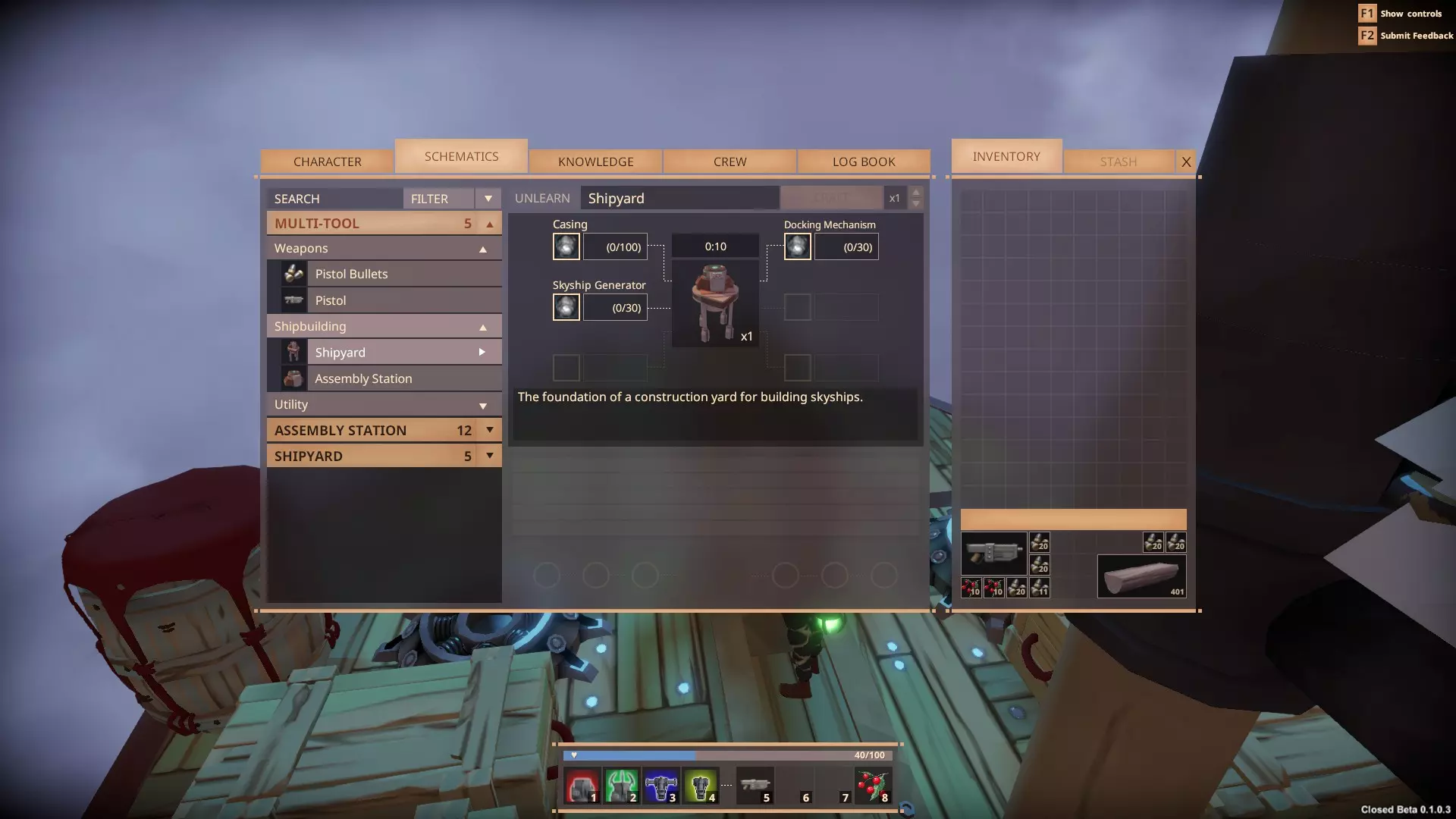 要开始建造飞船,你需要50点知识来解锁相关技能,并且必须从蓝图中的多功能工具选项卡建造【船坞】和【装配站】。
