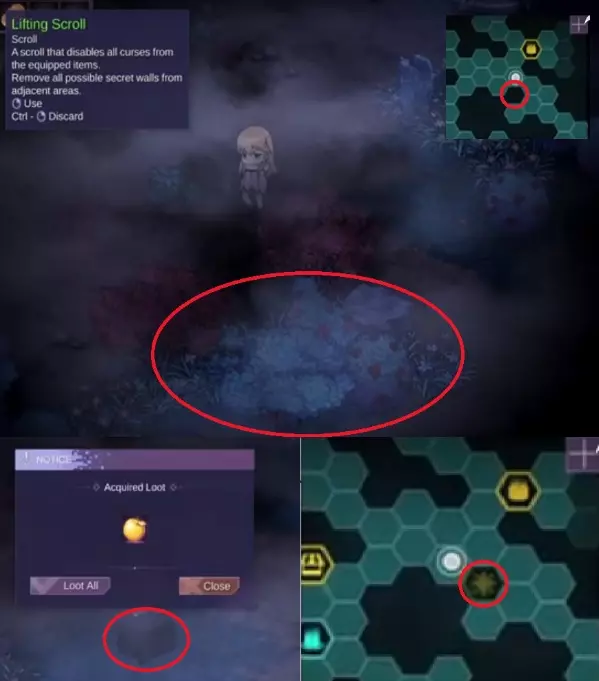 2. 隐藏宝藏从区域2到区域5开始出现。你可以使用【提升卷轴】、【净化卷轴】或【传送卷轴】来揭示它们。使用【地图卷轴】可在地图上标记它们的位置。不过,你也可以尝试自己猜测位置。大多数情况下,它们会出现在敌人队伍的旁边。寻找被6-7个空格包围的方块。如果你携带了【秘宝花环】,就寻找有白色花朵盛开的区域(区域5则寻找闪烁的黄色光点)。