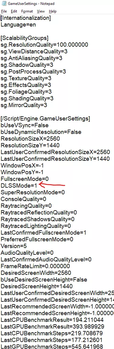然后进入“Local”文件夹并找到【巴士模拟21】。之后点击“Saved”、“Config”,再点击“WindowsNoEditor”。当你看到不同文件的列表时,点击“GameUserSettings”文件。打开记事本文件后,找到“DLSS Mode=0”。它的值应该被设置为0,所以你需要做的是将该值设置为1。