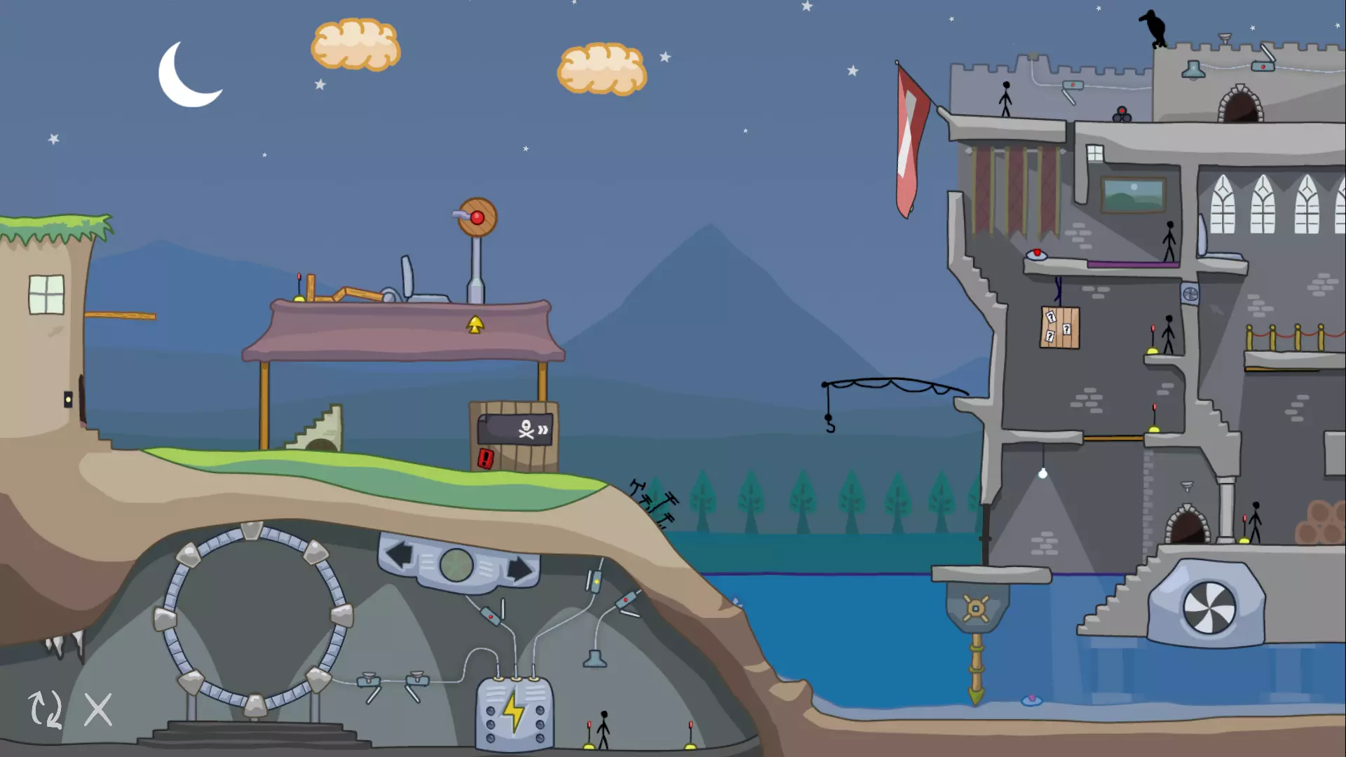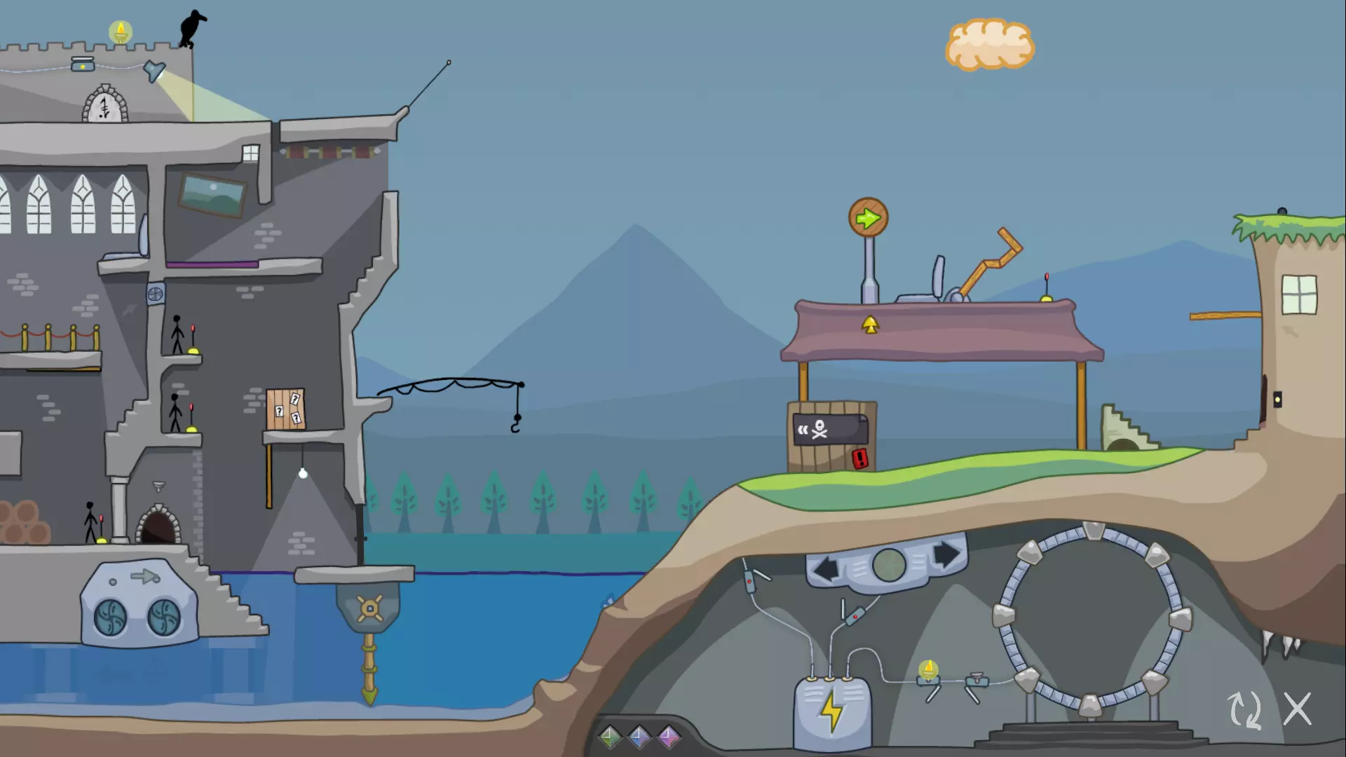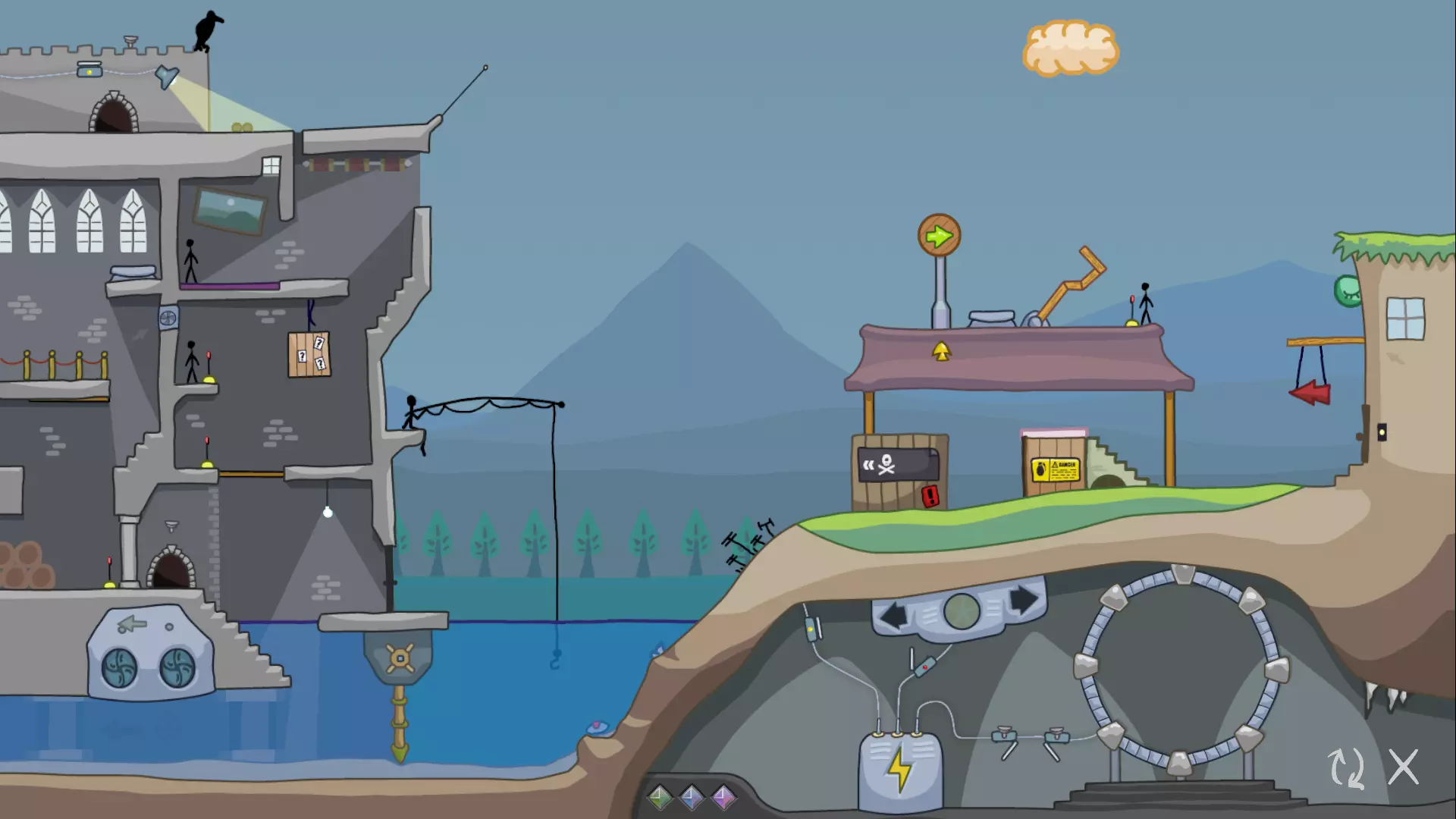 如果你一直按照我的攻略进行到这里,请注意我们现在的关卡处于一个更加无法解决的状态。在下一部分,我们将探讨我们犯了哪些阻碍进度的错误,并找出可以对之前步骤进行哪些修改来纠正这些问题。 1.4 修正我们的第一个错误 让我们把注意力转回关卡的右侧。在右边的房子旁边,又是一个那种红色箭头标志!借助箭头的力量,让我们探索一下能做些什么。 还记得我们一开始激活的那个绿色箭头标志吗?试着再次激活它。观察火柴人如何从建筑顶部跳下,正好落在红色箭头标志下方。当箭头指向左方时,火柴人会顺着指示走上楼梯,停在炸弹箱顶部。 现在尝试将箭头转向右方,然后再次点击火柴人。当他试图进入右侧的房子时,会碰掉门把手以及上方的黏糊糊生物,这个生物会立刻将他吞噬。当然,我们需要这个火柴人活着,所以这样操作的话这一轮就无法完成了。不过,我们还是来看看这个黏糊糊生物醒来后会做什么。 点击黏糊糊生物,它会像火柴人一样跟着箭头指示行动!如果箭头指向右,它只会撞门,没什么帮助。但如果把箭头指向左,黏糊糊生物就会走向护城河,途中会吞噬掉炸弹箱。然而,它很快就被地面上伸出的电线摧毁了。那个 blob 很有用,所以我们需要先清理那些电线。 第一步修正:清理电线 要清理电线,我们需要使用鸟和石头。我们曾用第二朵云让鸟把一块石头投进弹弓。如果对第一块石头做同样的操作,鸟就会把石头扔到电线上,从而摧毁它。 不过,我们只能在引爆第一朵云之前这样做。一旦第一朵云爆炸,它就消失了,我们就再也无法把石头扔到电线上了。 重置关卡,再次完成第 1、2、3 部分,但这次要用鸟和石头摧毁电线。继续操作,直到你准备点击 blob。如果你现在点击那个 blob,它会穿过电线到达护城河,但之后就会毫无用处地停在中间。要是能用 blob 清除一个障碍物就好了。实际上,我们确实可以!在点击 blob 之前,让我们重新启动水轮机。当 blob 进入水中时,水流会把它推向第二个地雷,从而将其摧毁。 清除电线和第二个地雷后,关卡应该是这样的: