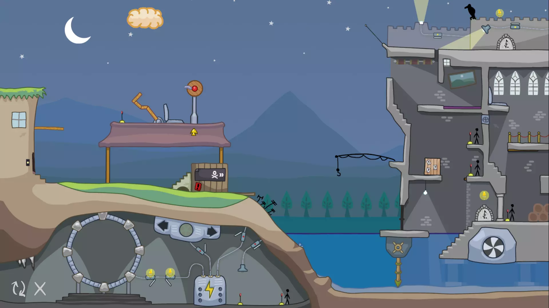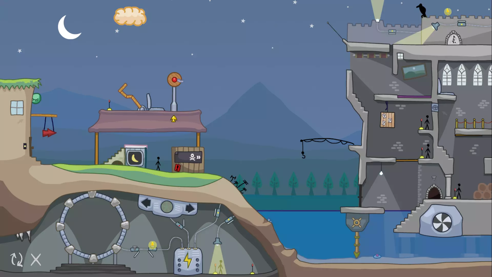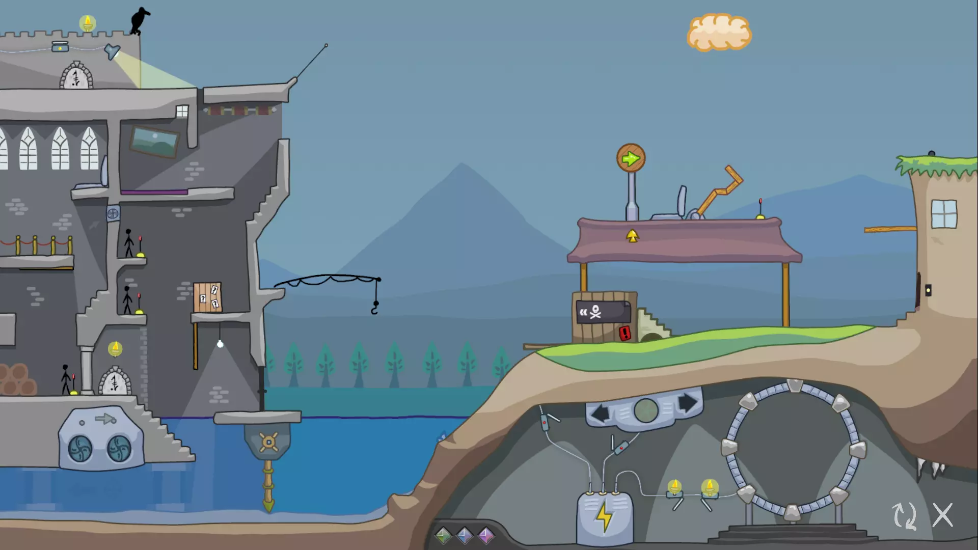如果你一直按照我的攻略进行到这里,请注意我们现在的关卡处于一个更加无法解决的状态。在下一部分,我们将探讨我们犯了哪些阻碍进度的错误,并找出可以对之前步骤进行哪些修改来纠正这些问题。 1.4 修正我们的第一个错误 让我们把注意力转回关卡的右侧。在右边的房子旁边,又是一个那种红色箭头标志!借助箭头的力量,让我们探索一下能做些什么。 还记得我们一开始激活的那个绿色箭头标志吗?试着再次激活它。观察火柴人如何从建筑顶部跳下,正好落在红色箭头标志下方。当箭头指向左方时,火柴人会顺着指示走上楼梯,停在炸弹箱顶部。 现在尝试将箭头转向右方,然后再次点击火柴人。当他试图进入右侧的房子时,会碰掉门把手以及上方的黏糊糊生物,这个生物会立刻将他吞噬。当然,我们需要这个火柴人活着,所以这样操作的话这一轮就无法完成了。不过,我们还是来看看这个黏糊糊生物醒来后会做什么。 点击黏糊糊生物,它会像火柴人一样跟着箭头指示行动!如果箭头指向右,它只会撞门,没什么帮助。但如果把箭头指向左,黏糊糊生物就会走向护城河,途中会吞噬掉炸弹箱。然而,它很快就被地面上伸出的电线摧毁了。那个 blob 很有用,所以我们需要先清理那些电线。 第一步修正:清理电线 要清理电线,我们需要使用鸟和石头。我们曾用第二朵云让鸟把一块石头投进弹弓。如果对第一块石头做同样的操作,鸟就会把石头扔到电线上,从而摧毁它。 不过,我们只能在引爆第一朵云之前这样做。一旦第一朵云爆炸,它就消失了,我们就再也无法把石头扔到电线上了。 重置关卡,再次完成第 1、2、3 部分,但这次要用鸟和石头摧毁电线。继续操作,直到你准备点击 blob。如果你现在点击那个 blob,它会穿过电线到达护城河,但之后就会毫无用处地停在中间。要是能用 blob 清除一个障碍物就好了。实际上,我们确实可以!在点击 blob 之前,让我们重新启动水轮机。当 blob 进入水中时,水流会把它推向第二个地雷,从而将其摧毁。 清除电线和第二个地雷后,关卡应该是这样的: