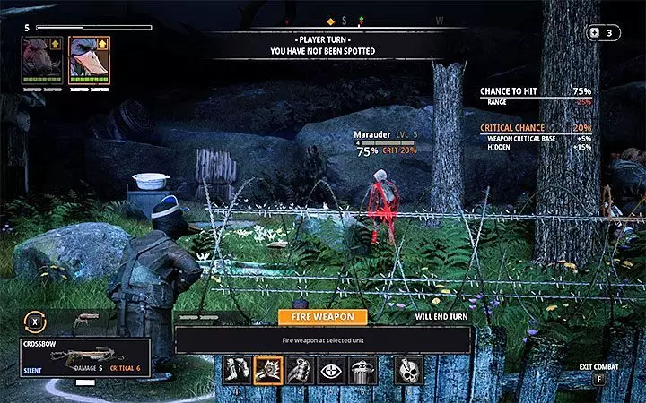 7. 你可以击杀单独的敌人而不惊动其他敌人 在侦查时,你可以发现单独的敌人,他们正在远离主营地的区域巡逻。你可以尝试消灭他们而不引起其他敌人的警觉。有两种主要方法可以实现这一目标: 使用无声武器,例如十字弓(可在商店购买)和带消音器的手枪(游戏初期可找到的塞尔玛使用这种武器)。如果能在一回合内消灭敌人,他们就无法向其他敌人发出警报。记得升级无声武器,以造成尽可能多的伤害。如果三个角色都能在一回合内使用无声武器,那会很有用。 在敌人听力范围外发动攻击存在问题,因为游戏不会提示你这次攻击是否会被听到。在尝试这么做之前,最好手动保存游戏。这种方法的优势在于可以使用“普通”但更强大的武器。当所选敌人拥有大量生命值时,这也会有所帮助。