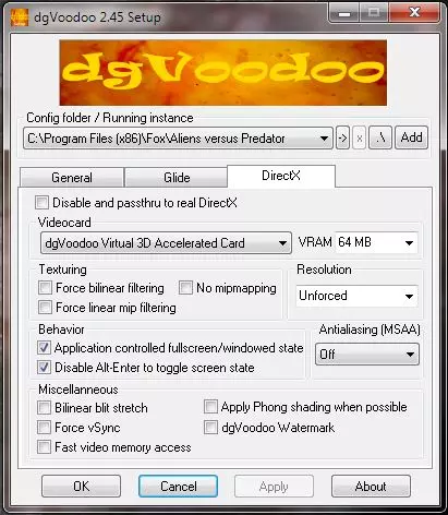 本指南将帮助你在现代操作系统上运行原版黄金版游戏,解决图形问题,且无需使用AvPx模组。 问题描述: 如果你在过去十年或更长时间里尝试过游玩《异形大战铁血战士 黄金版》,可能会遇到一个非常令人沮丧的问题。游戏能够加载,菜单显示正常,但关卡和实际游戏过程中会出现极其混乱的图形问题。据我所知,这是由于较新版本的DirectX无法正确解析该游戏引擎的图形所致。最终你会看到大片黑色区块,更糟糕的是,当你环顾四周时,屏幕画面会不断重复叠加。 到目前为止,有几种方法可以减轻这个问题。第一种方法是,作为海军陆战队时保持图像增强模式,或者作为铁血战士时始终保持隐形和/或绿色视觉模式。出于某种原因,这些视觉模式的改变不会导致图形问题。遗憾的是,使用此方法时,以异形身份游玩仍会出现图形问题。另一种方法是下载sirlemonhead的AvPx mod。这是一个独立的可执行文件,可解决单人模式和遭遇战模式下的问题。幸运的是,我的朋友,一位名叫UberFoX的优秀程序员发现了一个修复方法,能让你游玩原版《异形大战铁血战士 黄金版》(不是《异形大战铁血战士 经典2000》或AvPx)时避免出现图形错误。 解决方法: 1. 显然,你需要《异形大战铁血战士 黄金版》的光盘。如果没有,就去获取。安装游戏(我假设你不是傻子,能自己搞定安装步骤)。 在安装过程接近尾声时,会询问你是否要安装DirectX 6;不要安装它。1. 安装结束时,会询问是否阅读自述文件并运行游戏,这两项都不要操作。 2. setup.exe 会自动将游戏安装到 C: Program Files(86) Fox Aliens versus Predator。打开该文件位置(或你安装游戏的其他位置)并保持窗口打开。 3. 下载 dgVoodoo v2.45,这是一个模拟 Voodoo 显卡的免费软件。 4. 下载 dgVoodoo v2.45 后,用 WinRAR 打开。返回 Fox Aliens versus Predator 文件夹,创建一个名为 dgvoodoo 的文件夹。将 dgVoodoo2_45.zip 中的内容复制并粘贴到新建的 dgvoodoo 文件夹中。粘贴完成后,找到名为 MS 的文件夹,里面应该有两个 .dll 文件,其中一个名为 D3DImm。一个名为.dll,另一个名为DDraw.dll。复制这两个文件并粘贴到常规的异形大战铁血战士文件夹中。 5. 现在返回你的dgvoodoo文件夹。启动dgVoodooSetup.exe。在菜单顶部,你会看到一个目录。向其中添加此目录:你的驱动器: Program Files(x86) Fox Aliens versus Predator。然后点击添加。查看这三张截图,并调整你的程序使其与之匹配。
