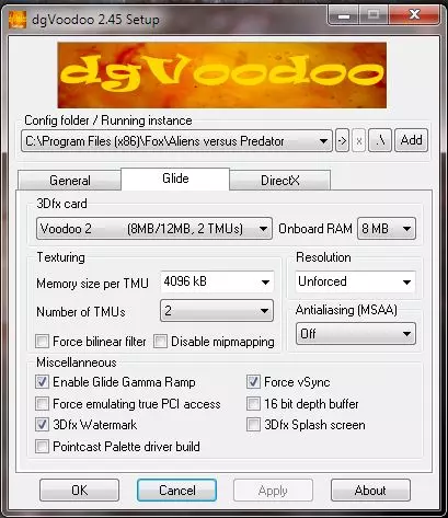 7. 当你将参数设置为与这些截图一致后,现在可以运行avp.exe。这样你应该不会遇到任何图形问题。 请注意,该游戏仍存在一个音频bug:如果你中断带有Fox Interactive和Rebellion标志的启动动画,以及游戏的任何其他片头/片尾视频,音频将会无限循环。为防止这种情况发生,你可以执行以下三种操作之一: 连续按Enter键跳过开场标志,在它们开始播放前就跳过。然后在菜单中,进入音频/视频选项,将片头视频设置为关闭(这是我个人首选的方法)。 永远不要中断开场标志或片头/片尾视频。 你可以下载UberFoX的AVP启动器,它会跳过所有视频(包括开场标志)。额外内容:让Inteng(关卡编辑器)正常运行 对于想要编辑游戏关卡或HUD/NPC模型的玩家,这里有个小提示。游戏编辑器Inteng会出现与上述相同(或类似)的问题,使用上述相同方法即可让该程序正常运行。以下是简要步骤: 1. 如果尚未安装黄金版,请先安装。然后如果尚未安装AVP黄金版工具,也请安装。 2. 如果尚未下载dgVoodoo,请进行下载。打开压缩文件,但先不要进行任何操作。 3. 进入你的Fox Aliens versus Predator Tools文件夹,新建一个名为dgvoodoo的文件夹。 4. 将你下载的压缩文件内容解压到dgvoodoo文件夹中。进入dgvoodoo文件夹,找到名为MS的子文件夹。里面应该有两个.dll文件,将它们复制,返回两级文件夹,粘贴到tools文件夹中。 回到dgvoodoo文件夹,打开dgvoodoosetup.exe。在“Config folder/Running instance”(配置文件夹/运行实例)下,点击“Add”(添加),然后将此目录位置(你的驱动器: Program Files (x86) Fox Aliens versus Predator Tools)添加到程序中。 确保你的设置与上述三张截图中的设置一致。要运行Inteng,首先进入你的avp_rifs文件夹。右键点击其中一个关卡文件(它们以.rif结尾),点击“Open With ->”(打开方式 ->),选择“Choose default program”(选择默认程序),然后找到Inteng.exe。rif文件时,它应该会在Inteng中打开,并且你不会遇到任何绘制距离问题。故障排除 如果游戏在加载关卡时崩溃:请尝试在dgVoodoo的DirectX选项卡中选择不同的显卡选项。也可以尝试显卡选项上方的【禁用并直通至真实DirectX】选项。在Glide选项卡中,尝试不同的3dfx显卡选项。 如果没有显示不同的多人游戏选项:你可能正在以兼容模式运行avp.exe。请确保不要以兼容模式运行该程序。 法律声明 本指南由我(Olde)独立撰写。但如果没有UberFoX的努力,这一切都不可能实现,他有了这一了不起的发现。你可以(并且应该)使用本指南并与他人分享。但你不应在分发本指南时将作者 credit 归于你自己、他人或不注明任何作者。