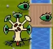 这个Boss会向你移动。 1) 当不在视野范围内时,会生成绿色眼睛敌人追逐你,类似蟑螂但生命值稍高。 2) 向自身周围发射2道环形弹幕。 3) 发射3波、每波3发的追踪子弹!非常危险!在绿色胡椒盒地图中,即使子弹飞出屏幕外,也可能被击中。 2. 三个壳客