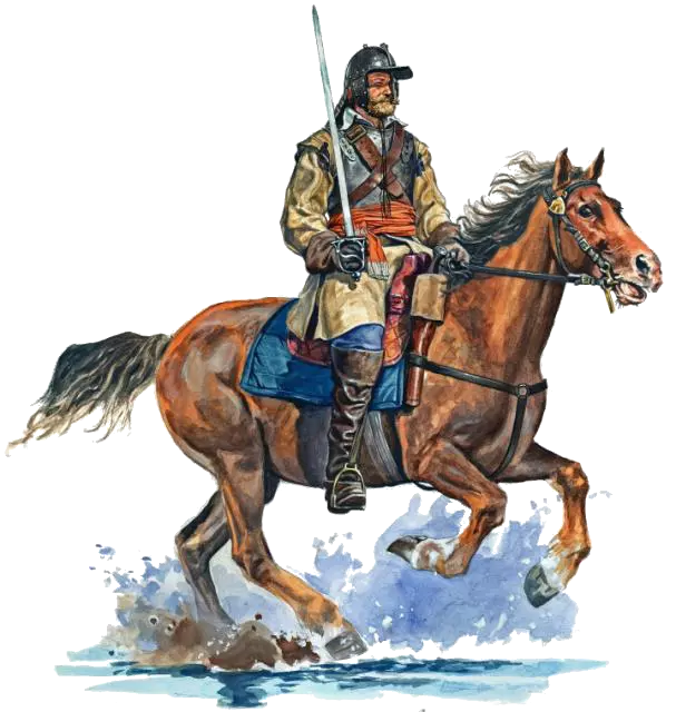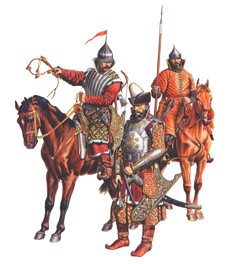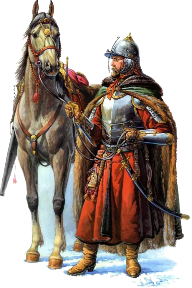 “沙皇军队”或许应有尽有……既有无需 pikiner( pikiner )掩护就能作战的弓箭手,也有数量众多的轻骑兵和中型骑兵……这一切都让莫斯科沙皇国比邻国拥有巨大优势…… “骑兵”波雅尔亲卫骑兵——俄罗斯最重的骑兵……他们的武器与其他俄罗斯骑兵差异不大——包括马刀、苏尼长矛(一种带有弯曲尖端的长矛),但也可能使用战锤或鹤嘴锤(一种打击部分呈鹤嘴状的战锤)作战。他们的链甲和头盔几乎能抵御马刀的劈砍,而战马则能轻易冲散敌方步兵。 莫斯科胸甲骑兵——是欧洲胸甲骑兵的更成功仿制品。他们身披厚实的铠甲,除了手枪外还配备骑兵卡宾枪,近战则使用马刀…… 卡尔梅克人——是生活在王国领土上的民族之一……他们装备精良——东方马刀、复合弓……其厚实的锁子甲很难被刺穿,而且骑着快马,难以追上……