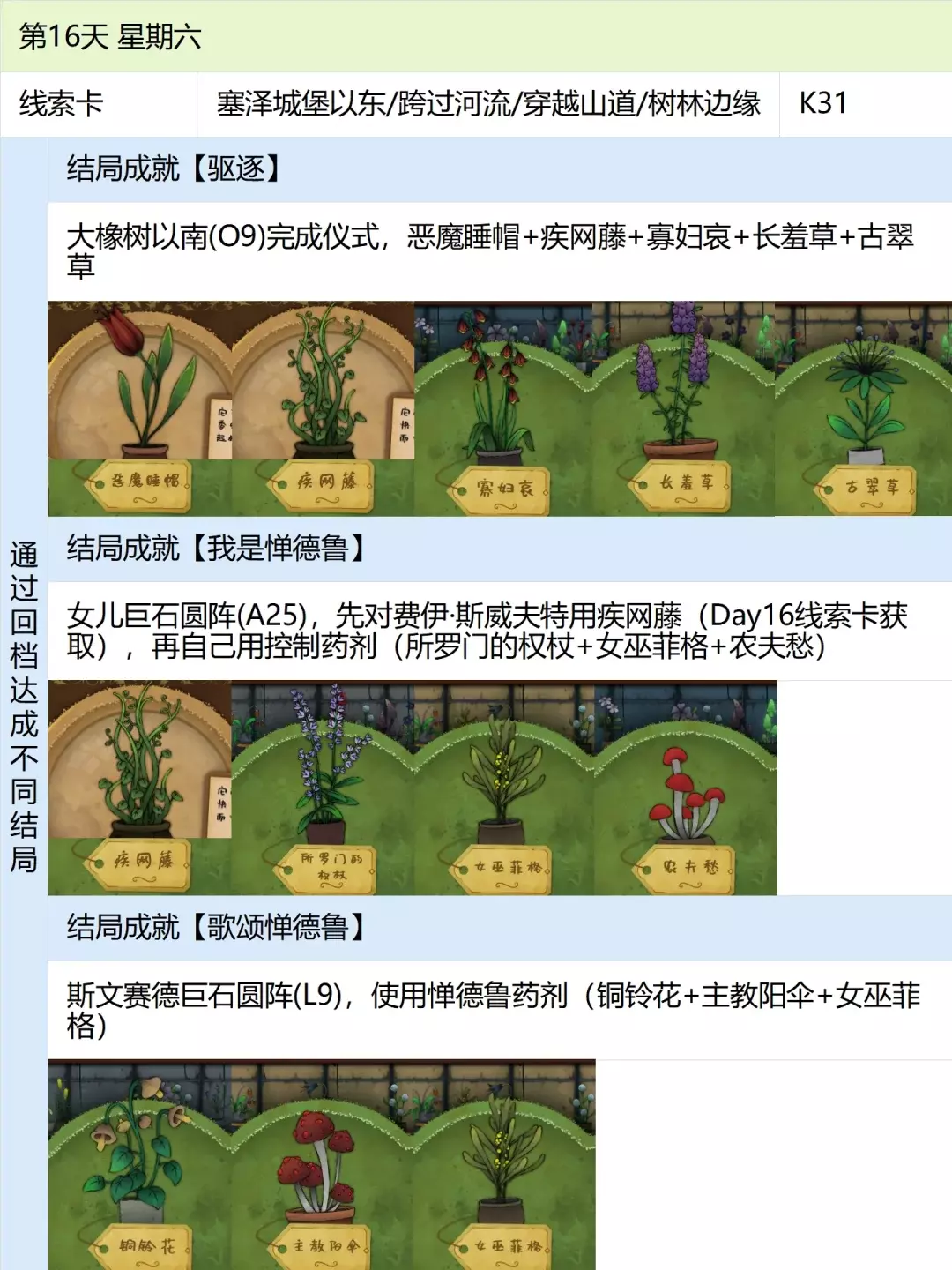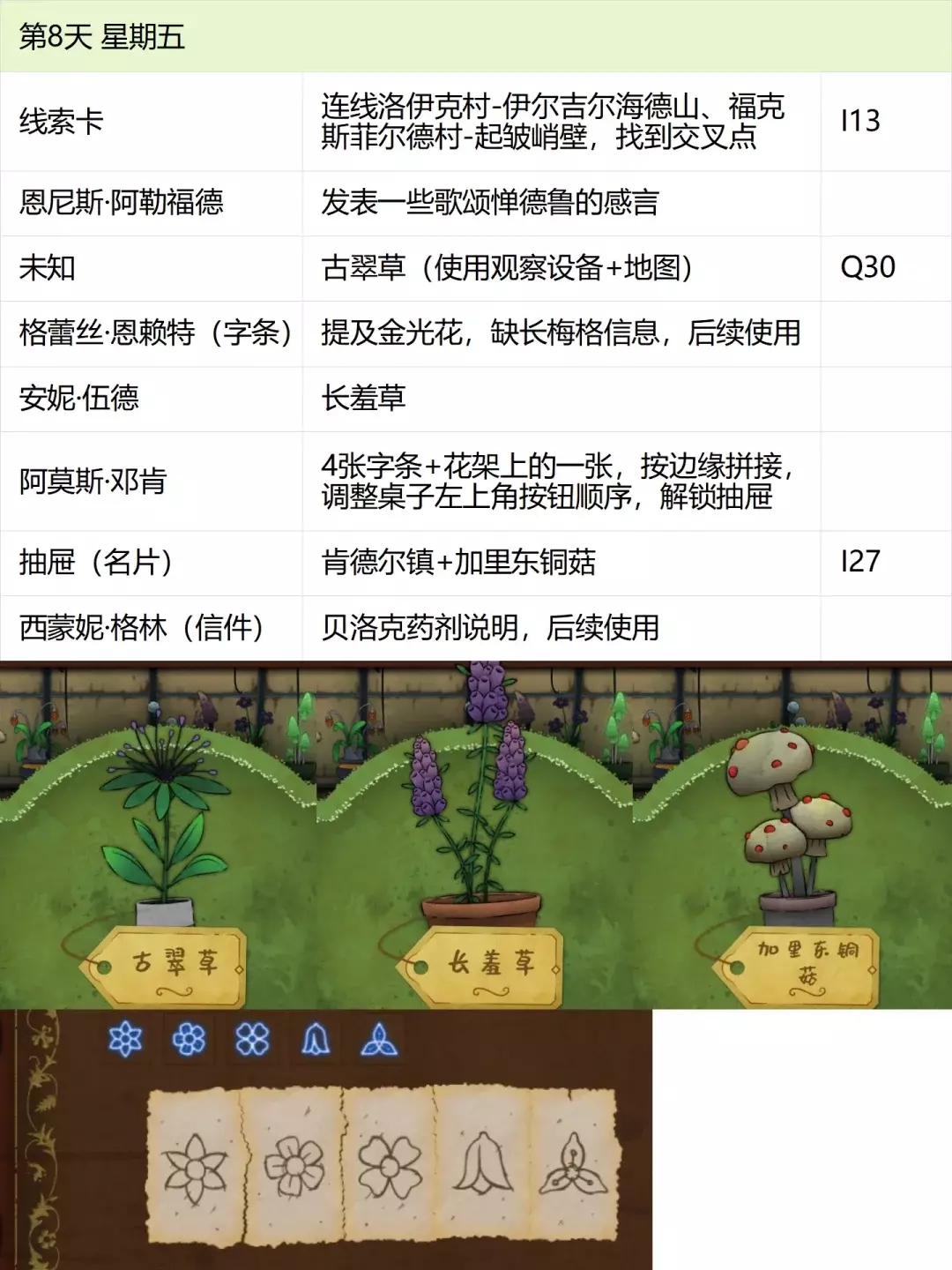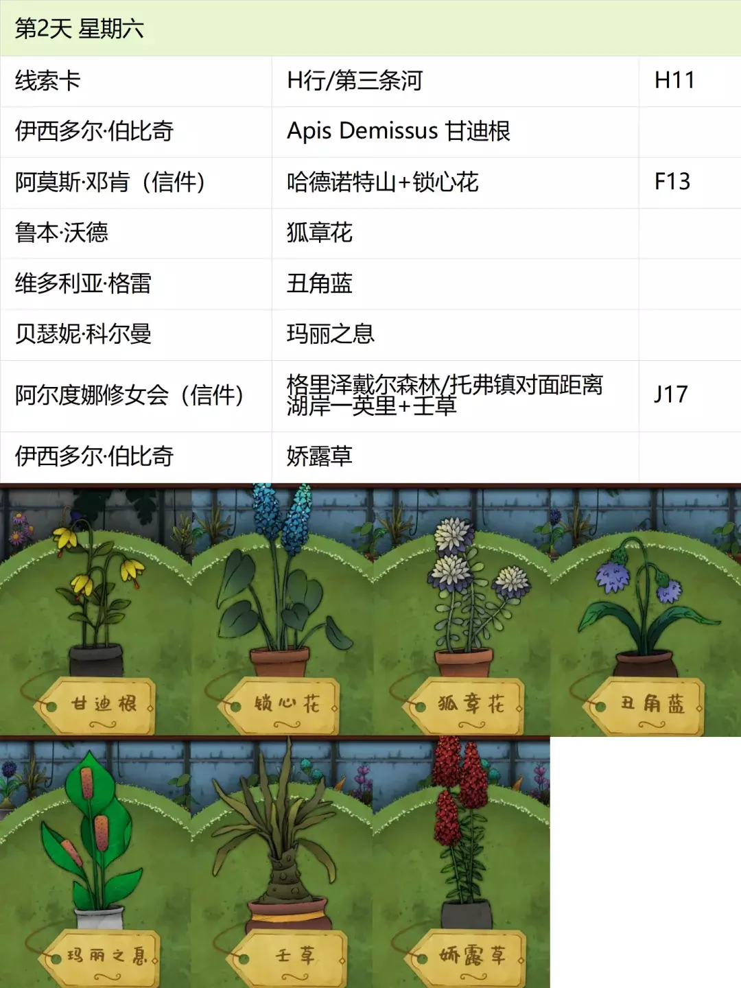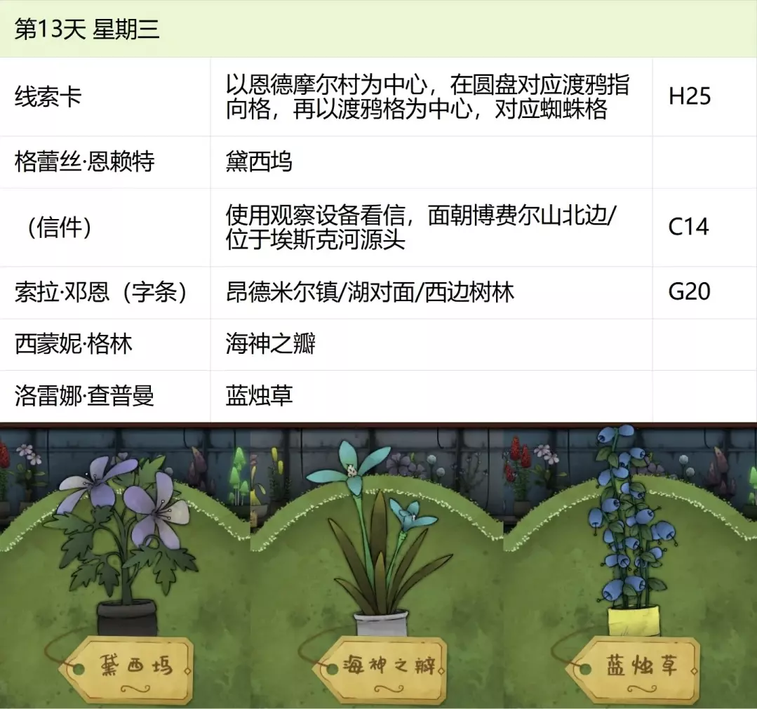 这份全成就指南将帮助你完成游戏中的每个成就,成为园艺大师。流程类成就(13个) 「园艺家」在不使用提示按钮的情况下完整通关 「开端」招待第一位客人 「学徒」识别10种植物 「地图之上」破解第一张线索卡片 「探索家」前往20个地图地点 「破解谜团」使用布莱尔圆盘找到一个地点 「配制大师」配制一款药剂 「结局」通关游戏 「资深园艺家」识别所有植物 「隐藏文本」启用观察设备(第5天拿到观察设备,第7天用红阿博尼激活) 「秘密」解锁桌子抽屉(花架纸片+第8天的4张纸片,按边缘拼接后,调整桌子左上角按钮顺序) 「九死一生」攒满一次恐惧条后成功恢复 「爱猫人士」抚摸柜台上的黑猫13次(可通过读档一天内完成) 结局&人物成就(5个)【极端后果】谋杀伯比奇 Day2-给伊西多尔·伯比奇娇露草 Day5-给赤语果 【森林守护者】拯救修女会 Day10-在格里泽戴尔森林(I19)放置烬魂花 Day12-修女会告知存活后解锁 【驱逐】完成仪式 Day16-在大橡树以南(O9)放置恶魔睡帽+疾网藤+寡妇哀+长羞草+古翠草 【歌颂惮德鲁】 Day6-恩尼斯·阿勒福德会给一封信件,去萨吉尔村(C28)放圣约翰红花 Day12-给福雷斯特·韦尔小乐坞 Day15-给未知寡妇哀 Day16-斯文赛德巨石圆阵(L9),使用惮德鲁药剂(铜铃花+主教阳伞+女巫菲格) 【我是惮德鲁】 Day4-给费伊·斯威夫特烛木 Day13-给西蒙妮·格林海神之瓣第16天-女儿巨石圆阵(A25),先对费伊·斯威夫特使用疾网藤(第16天线索卡获取),再自己使用控制药剂(所罗门的权杖+女巫菲格+农夫愁) 第一天