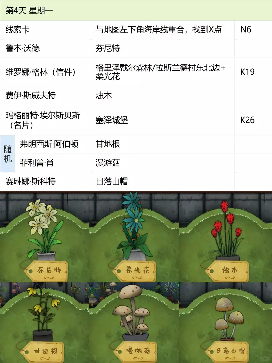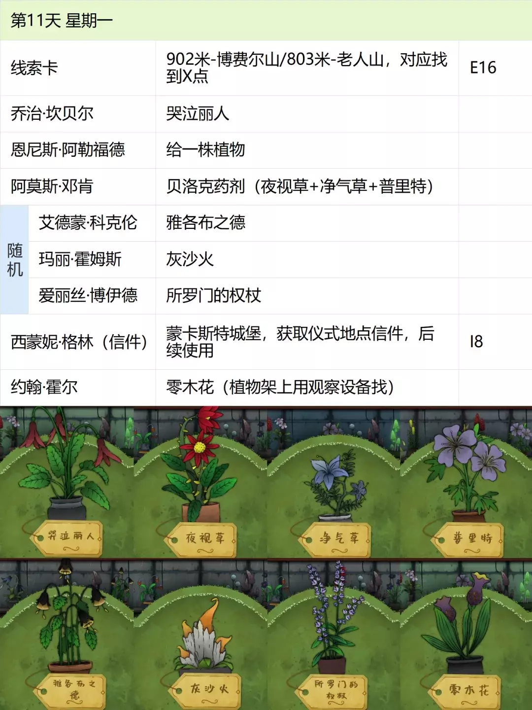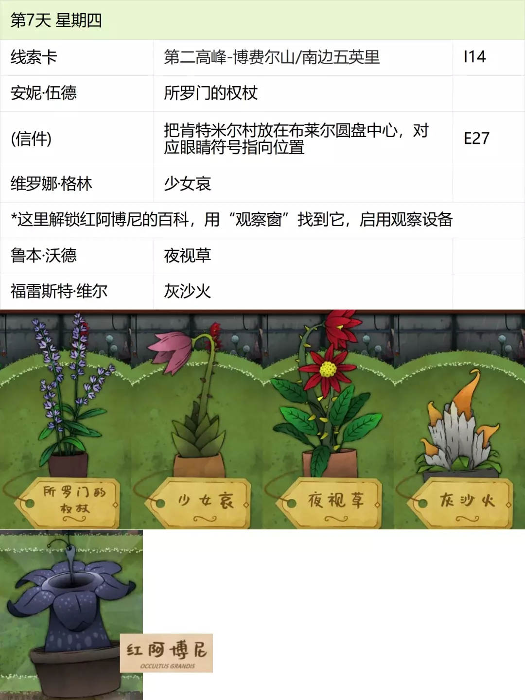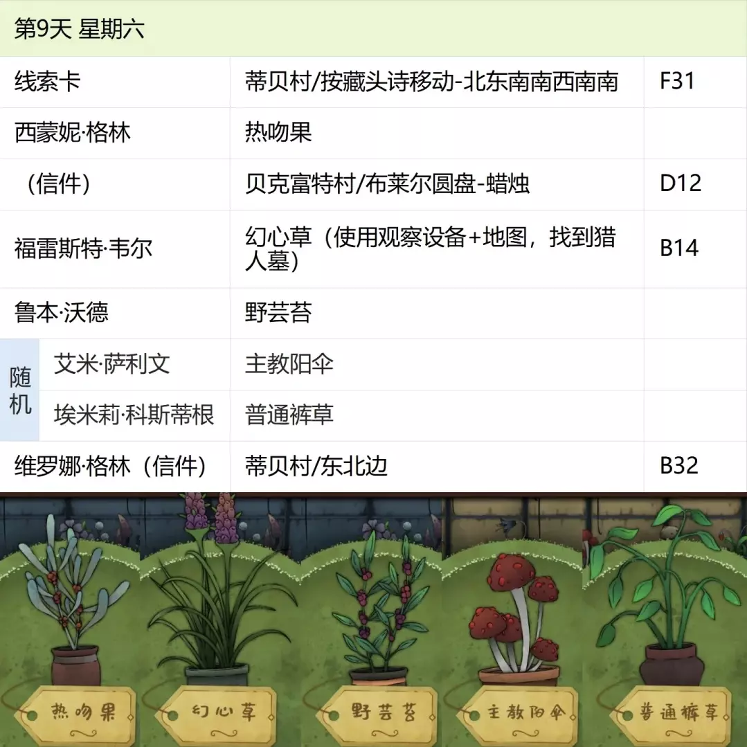 这份全成就指南将帮助你完成游戏中的每个成就,成为园艺大师。流程类成就(13个) 「园艺家」在不使用提示按钮的情况下完整通关 「开端」招待第一位客人 「学徒」识别10种植物 「地图之上」破解第一张线索卡片 「探索家」前往20个地图地点 「破解谜团」使用布莱尔圆盘找到一个地点 「配制大师」配制一款药剂 「结局」通关游戏 「资深园艺家」识别所有植物 「隐藏文本」启用观察设备(第5天拿到观察设备,第7天用红阿博尼激活) 「秘密」解锁桌子抽屉(花架纸片+第8天的4张纸片,按边缘拼接后,调整桌子左上角按钮顺序) 「九死一生」攒满一次恐惧条后成功恢复 「爱猫人士」抚摸柜台上的黑猫13次(可通过读档一天内完成) 结局&人物成就(5个)【极端后果】谋杀伯比奇 Day2-给伊西多尔·伯比奇娇露草 Day5-给赤语果 【森林守护者】拯救修女会 Day10-在格里泽戴尔森林(I19)放置烬魂花 Day12-修女会告知存活后解锁 【驱逐】完成仪式 Day16-在大橡树以南(O9)放置恶魔睡帽+疾网藤+寡妇哀+长羞草+古翠草 【歌颂惮德鲁】 Day6-恩尼斯·阿勒福德会给一封信件,去萨吉尔村(C28)放圣约翰红花 Day12-给福雷斯特·韦尔小乐坞 Day15-给未知寡妇哀 Day16-斯文赛德巨石圆阵(L9),使用惮德鲁药剂(铜铃花+主教阳伞+女巫菲格) 【我是惮德鲁】 Day4-给费伊·斯威夫特烛木 Day13-给西蒙妮·格林海神之瓣第16天-女儿巨石圆阵(A25),先对费伊·斯威夫特使用疾网藤(第16天线索卡获取),再自己使用控制药剂(所罗门的权杖+女巫菲格+农夫愁) 第一天