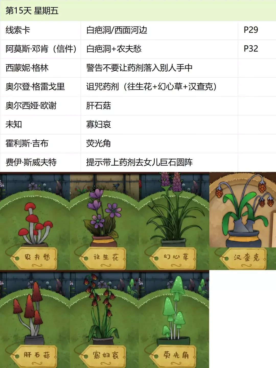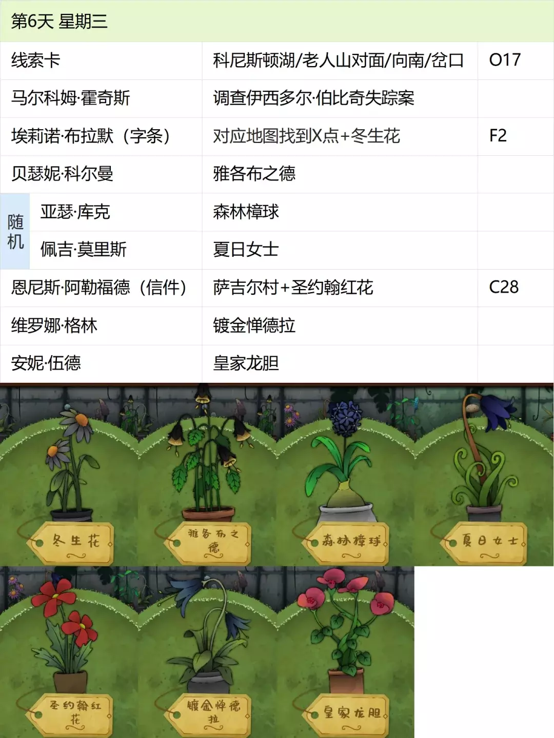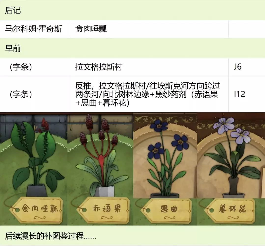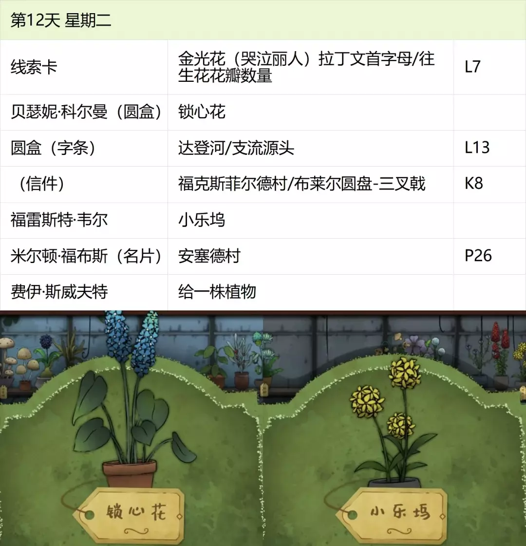这份全成就指南将帮助你完成游戏中的每个成就,成为园艺大师。流程类成就(13个) 「园艺家」在不使用提示按钮的情况下完整通关 「开端」招待第一位客人 「学徒」识别10种植物 「地图之上」破解第一张线索卡片 「探索家」前往20个地图地点 「破解谜团」使用布莱尔圆盘找到一个地点 「配制大师」配制一款药剂 「结局」通关游戏 「资深园艺家」识别所有植物 「隐藏文本」启用观察设备(第5天拿到观察设备,第7天用红阿博尼激活) 「秘密」解锁桌子抽屉(花架纸片+第8天的4张纸片,按边缘拼接后,调整桌子左上角按钮顺序) 「九死一生」攒满一次恐惧条后成功恢复 「爱猫人士」抚摸柜台上的黑猫13次(可通过读档一天内完成) 结局&人物成就(5个)【极端后果】谋杀伯比奇 Day2-给伊西多尔·伯比奇娇露草 Day5-给赤语果 【森林守护者】拯救修女会 Day10-在格里泽戴尔森林(I19)放置烬魂花 Day12-修女会告知存活后解锁 【驱逐】完成仪式 Day16-在大橡树以南(O9)放置恶魔睡帽+疾网藤+寡妇哀+长羞草+古翠草 【歌颂惮德鲁】 Day6-恩尼斯·阿勒福德会给一封信件,去萨吉尔村(C28)放圣约翰红花 Day12-给福雷斯特·韦尔小乐坞 Day15-给未知寡妇哀 Day16-斯文赛德巨石圆阵(L9),使用惮德鲁药剂(铜铃花+主教阳伞+女巫菲格) 【我是惮德鲁】 Day4-给费伊·斯威夫特烛木 Day13-给西蒙妮·格林海神之瓣第16天-女儿巨石圆阵(A25),先对费伊·斯威夫特使用疾网藤(第16天线索卡获取),再自己使用控制药剂(所罗门的权杖+女巫菲格+农夫愁) 第一天
