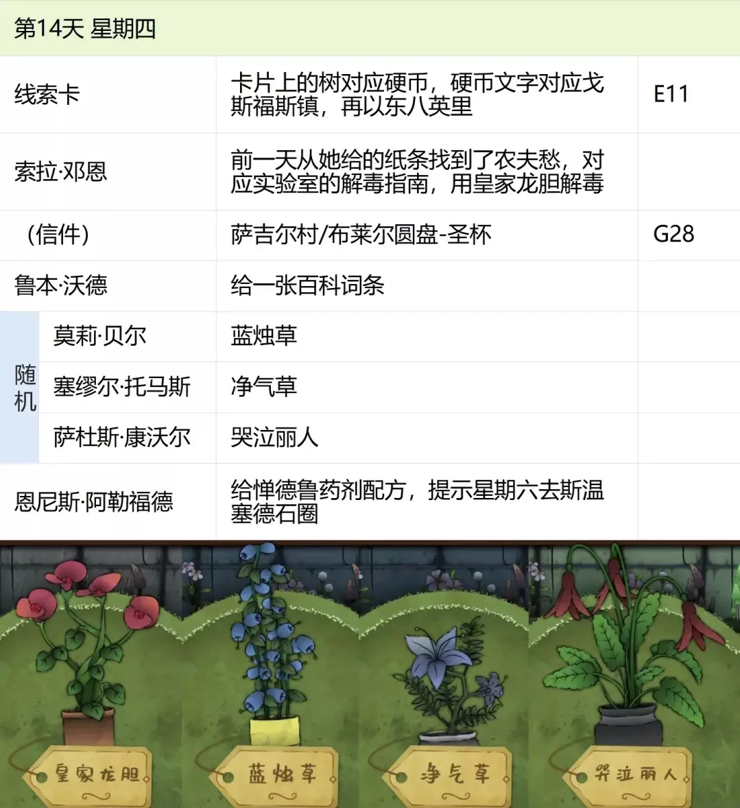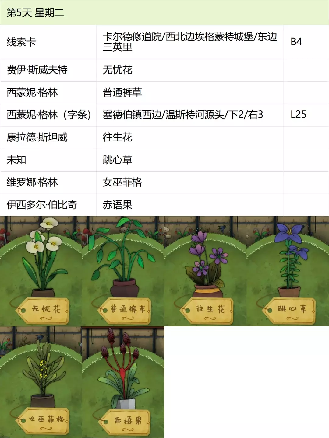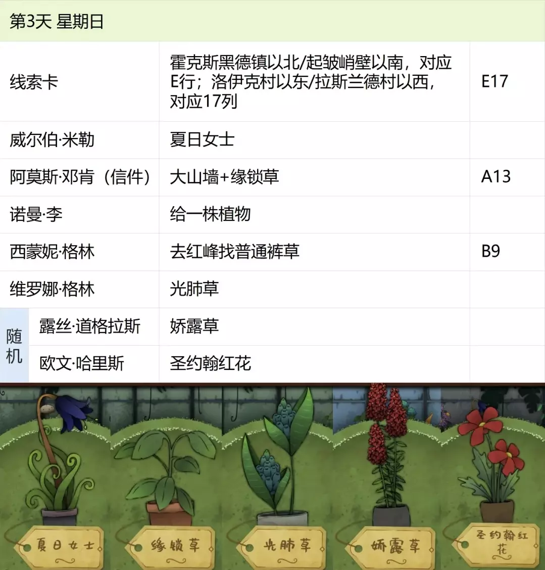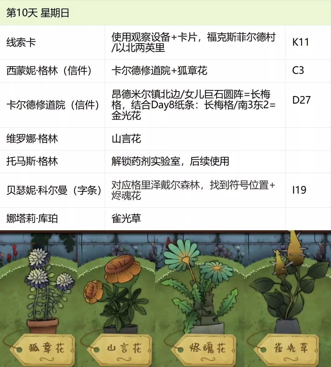 这份全成就指南将帮助你完成游戏中的每个成就,成为园艺大师。流程类成就(13个) 「园艺家」在不使用提示按钮的情况下完整通关 「开端」招待第一位客人 「学徒」识别10种植物 「地图之上」破解第一张线索卡片 「探索家」前往20个地图地点 「破解谜团」使用布莱尔圆盘找到一个地点 「配制大师」配制一款药剂 「结局」通关游戏 「资深园艺家」识别所有植物 「隐藏文本」启用观察设备(第5天拿到观察设备,第7天用红阿博尼激活) 「秘密」解锁桌子抽屉(花架纸片+第8天的4张纸片,按边缘拼接后,调整桌子左上角按钮顺序) 「九死一生」攒满一次恐惧条后成功恢复 「爱猫人士」抚摸柜台上的黑猫13次(可通过读档一天内完成) 结局&人物成就(5个)【极端后果】谋杀伯比奇 Day2-给伊西多尔·伯比奇娇露草 Day5-给赤语果 【森林守护者】拯救修女会 Day10-在格里泽戴尔森林(I19)放置烬魂花 Day12-修女会告知存活后解锁 【驱逐】完成仪式 Day16-在大橡树以南(O9)放置恶魔睡帽+疾网藤+寡妇哀+长羞草+古翠草 【歌颂惮德鲁】 Day6-恩尼斯·阿勒福德会给一封信件,去萨吉尔村(C28)放圣约翰红花 Day12-给福雷斯特·韦尔小乐坞 Day15-给未知寡妇哀 Day16-斯文赛德巨石圆阵(L9),使用惮德鲁药剂(铜铃花+主教阳伞+女巫菲格) 【我是惮德鲁】 Day4-给费伊·斯威夫特烛木 Day13-给西蒙妮·格林海神之瓣第16天-女儿巨石圆阵(A25),先对费伊·斯威夫特使用疾网藤(第16天线索卡获取),再自己使用控制药剂(所罗门的权杖+女巫菲格+农夫愁) 第一天