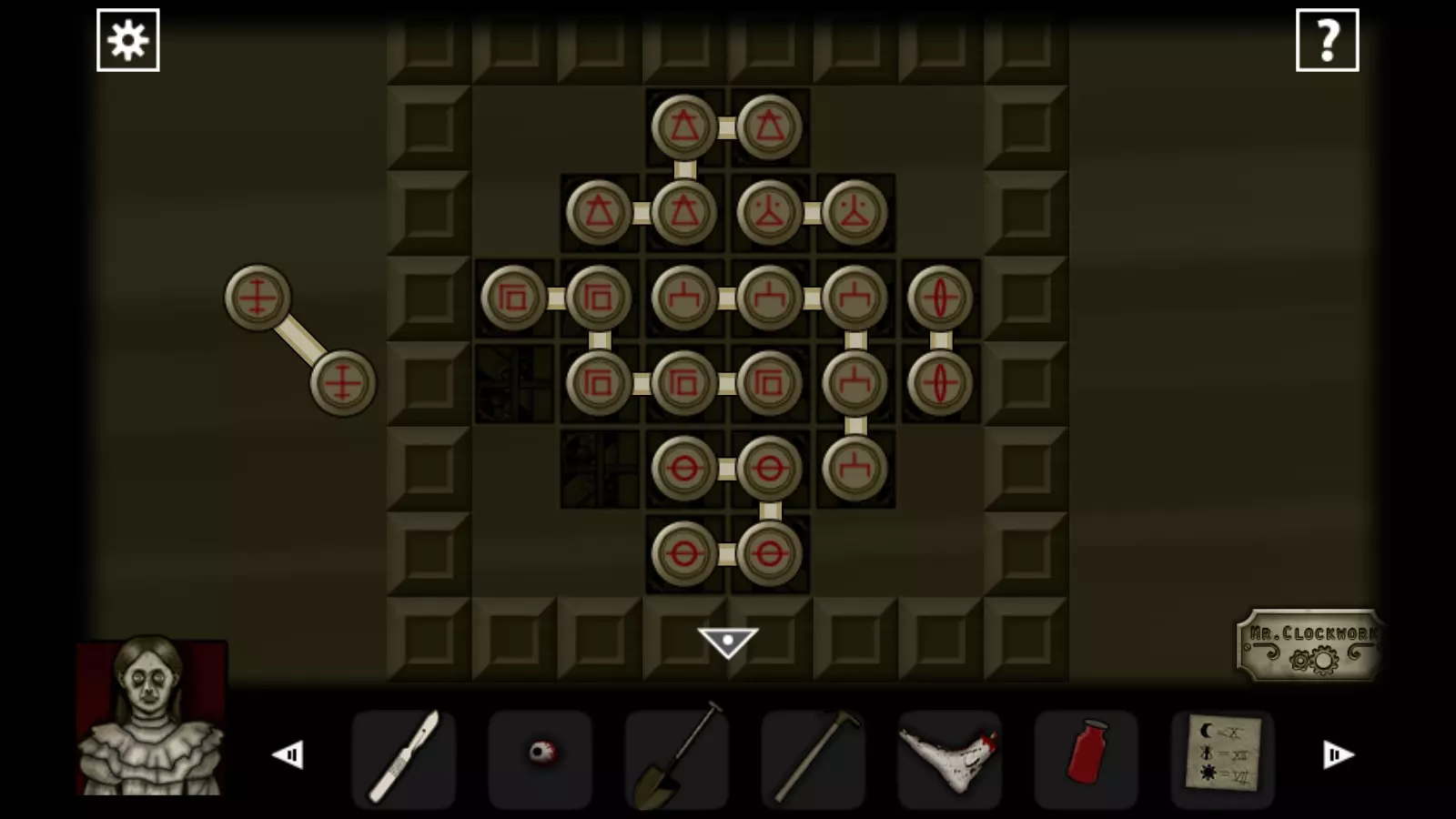 晚安 这张床真舒服…… 点击床上的方块,然后按以下按钮: 13 14 11 10 15 12 04 09 16 03 05 08 01 02 06 07 拿起磁盘(2/4)和纸。点击门左边的谜题,输入密码: II III V VI I V VI I 拿起磁盘(3/4)和饰品,将其插入梳妆台的抽屉。拿起磁盘(4/4),将所有磁盘插入门右边的谜题。拼好拼图,进入房间。 点击床上的月亮:3、3、2、4、2、1、1,拿起钥匙。在抽屉中输入密码RUTH。拿起保险丝,用钥匙打开门。进入室内。 拿起火柴,用火柴点燃蜡烛。拼好拼图,拿起曼德拉草。将保险丝插入机械装置,转动旋钮并按下按钮,使所有灯泡亮起。获得成就Machine activated。