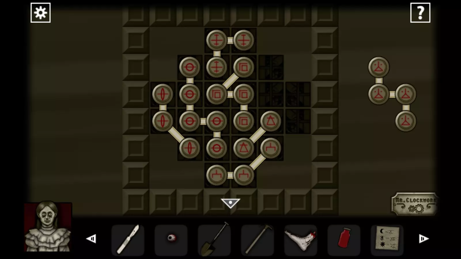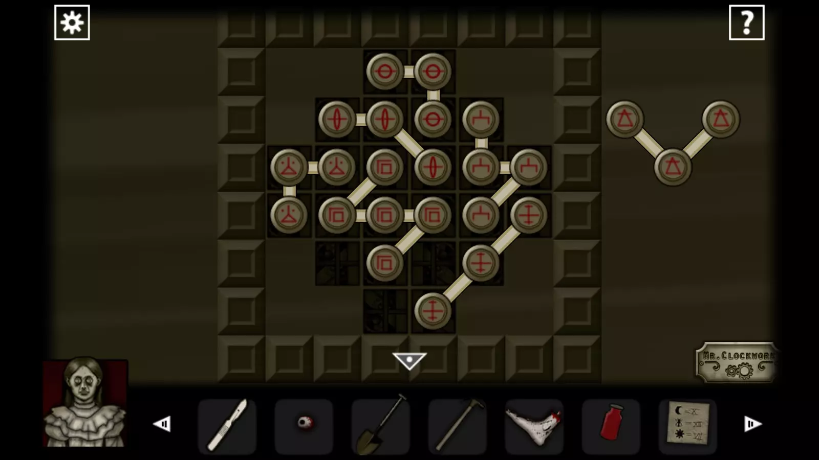 倒吊人 做仅剩的那件事 4. 游戏场地 向右走,在桌子旁拿起钥匙。解开谜题,拿起眼球。用钥匙打开小柜子,拿起纸和钥匙。用它们打开门,进入里面。 拿起刀和一块画,点击盘子。按照画上的样子重新摆放盘子。拿起纸,用它打开房间里的小柜子(转动指针到纸上符号的位置)。拿起吊坠和纸,在门上输入吊坠上的密码。进入里面。将眼睛放入鹿头中,拿到钥匙。用钥匙打开门,进入门内。在井字棋游戏中战胜儿子,获得成就Tic Tac Toe。