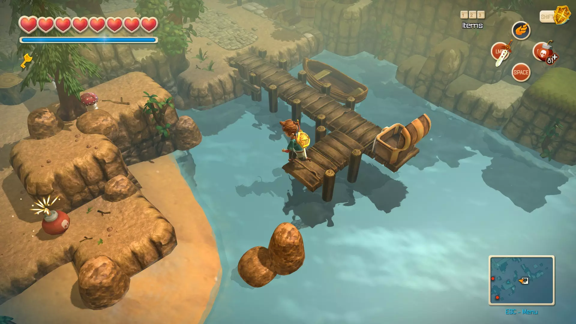 如何在低语岛获得最后一块心之碎片并达成100%进度(从96%完成) 获取低语岛隐藏的最后一块心之碎片 要获得低语岛乃至可能是游戏中的最后一块心之碎片,下船后需向右走,那里有一个宝箱。从该位置,需要向左侧岸边的一块草地投掷炸弹,如图片所示。完成此操作后,缺失的心之碎片将自动添加到物品栏,你也将达成该岛的100%进度。