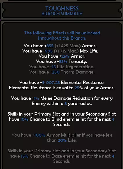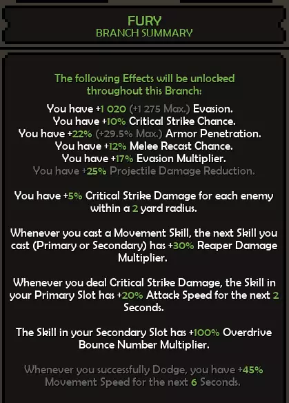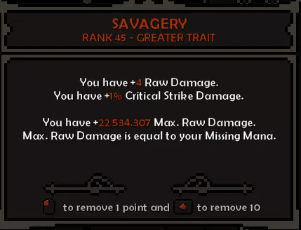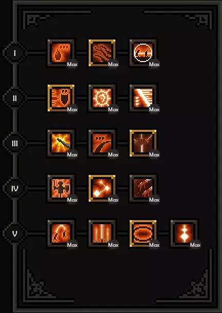 第一层:致残痛苦 第二层:鲜血护盾 第三层:餐叉与小刀 第四层:流血过载 第五层:血腥杀戮 技能与升级说明 木棍:该技能是狭窄空间的主要伤害来源,也可通过频繁使用来获取更多护甲。如果每次攻击的法力值不足,可将森林护甲替换为投资回报,直至从装备中获得攻击回蓝。 若拥有足够的攻击回蓝来频繁使用两个技能,可通过森林之根使敌人定身。 森林喷发和森林冲击会触发碎片爆炸,意味着能获得更多触发效果。 投掷剑:该技能是开阔空间中应对群体敌人的主要伤害来源。与木棍类似,此技能兼具进攻和防御作用,因为它可以叠加格挡并施加减速效果。获取【流血过载】和【血腥杀戮】升级非常重要,因为它们是该技能的主要触发效果。 另外,将此技能装备在副技能槽,这样你就能获得60点狂怒值(+100%过载弹跳倍率)的加成。 属性 坚韧 45
